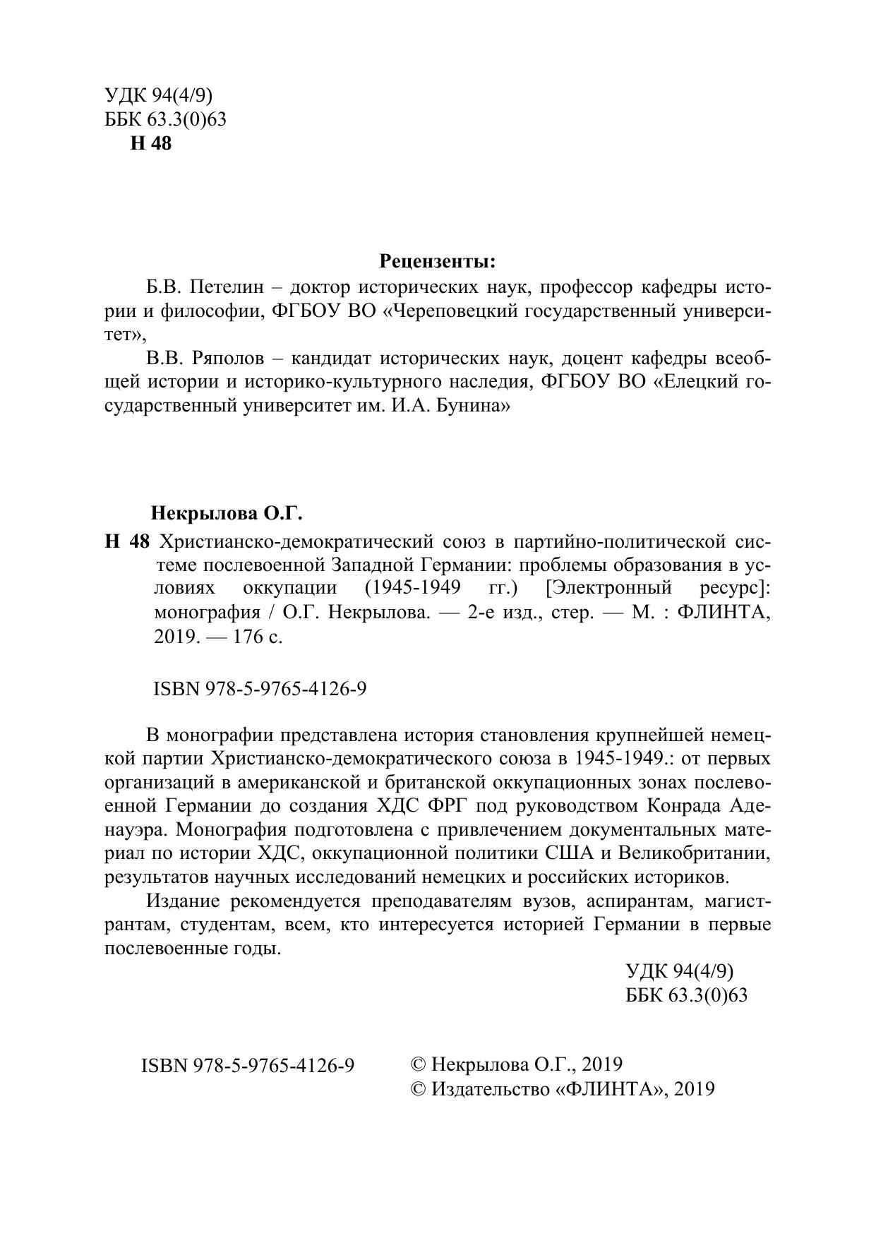 В монографии представлена история становления крупнейшей немецкой партии Христианско-демократического союза в 1945-1949.: от первых организаций в американской и британской оккупационных зонах послевоенной Германии до создания ХДС ФРГ под руководством Конрада Аденауэра. Монография подготовлена с привлечением документальных материал по истории ХДС, оккупационной политики США и Великобритании, результатов научных исследований немецких и российских историков.