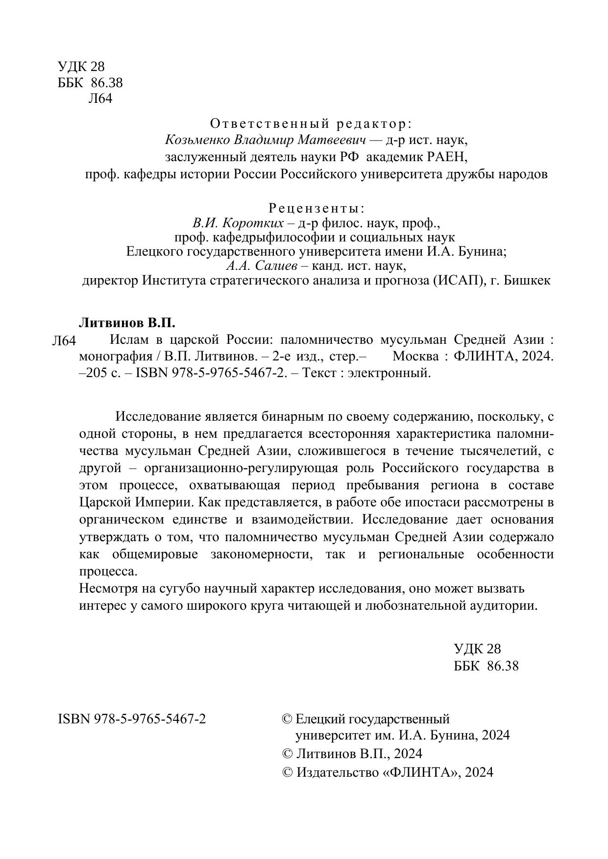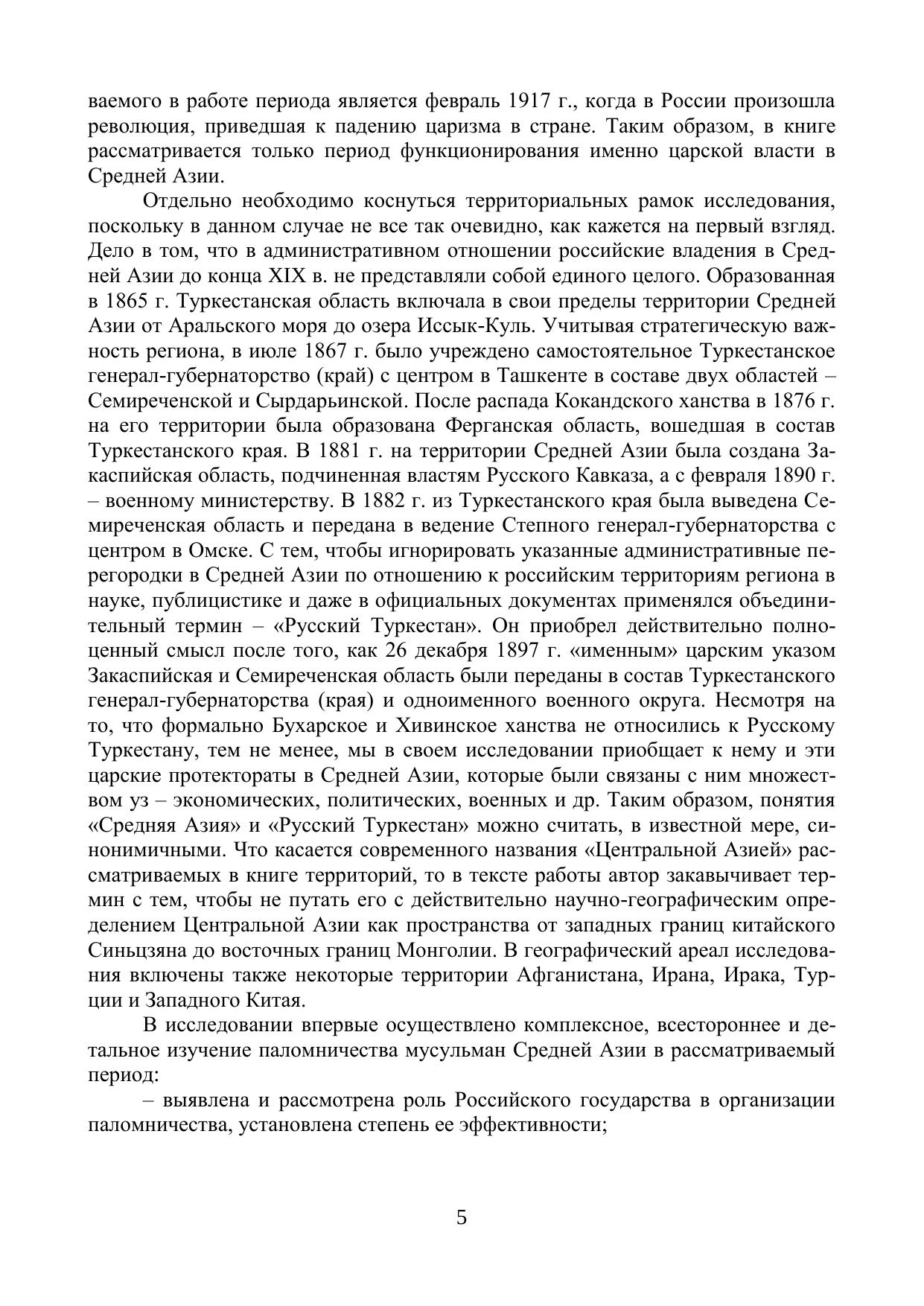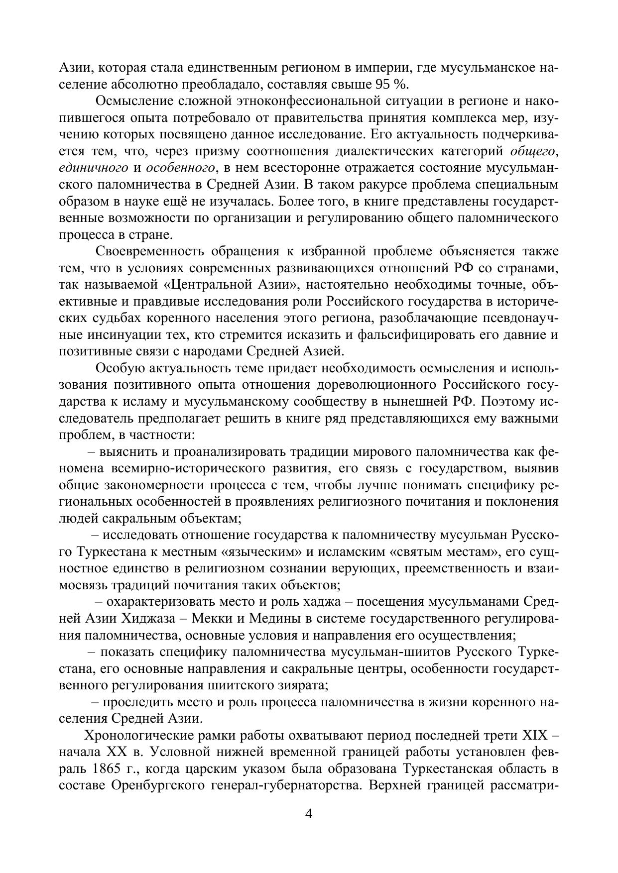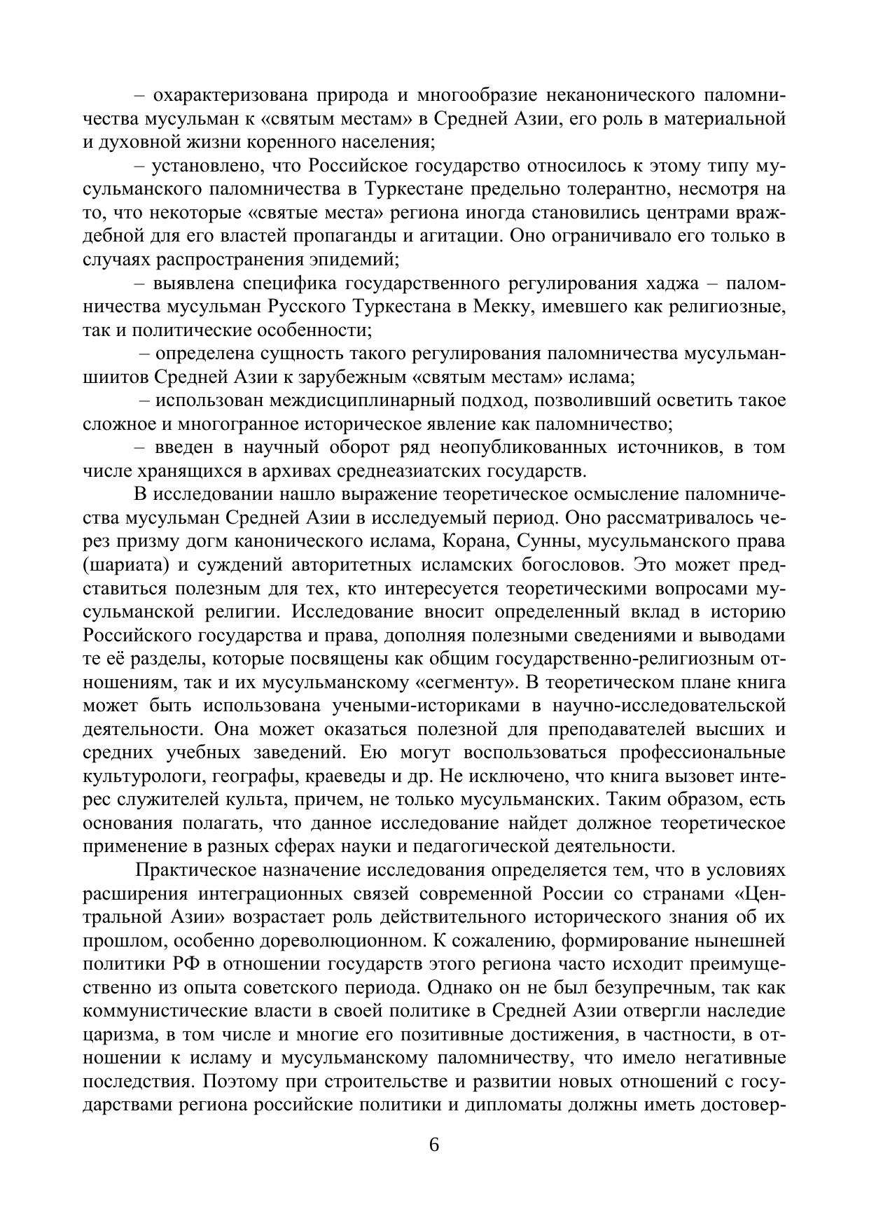 Исследование является бинарным по своему содержанию, поскольку, с одной стороны, в нем предлагается всесторонняя характеристика паломничества мусульман Средней Азии, сложившегося в течение тысячелетий, с другой – организационно-регулирующая роль Российского государства в этом процессе, охватывающая период пребывания региона в составе царской империи. Как представляется, в работе обе ипостаси рассмотрены в органическом единстве и взаимодействии. Исследование дает основания утверждать о том, что паломничество мусульман Средней Азии содержало в себе как общемировые закономерности, так и региональные особенности процесса. Несмотря на сугубо научный характер исследования, оно может вызвать интерес у самого широкого круга читающей и любознательной аудитории.
