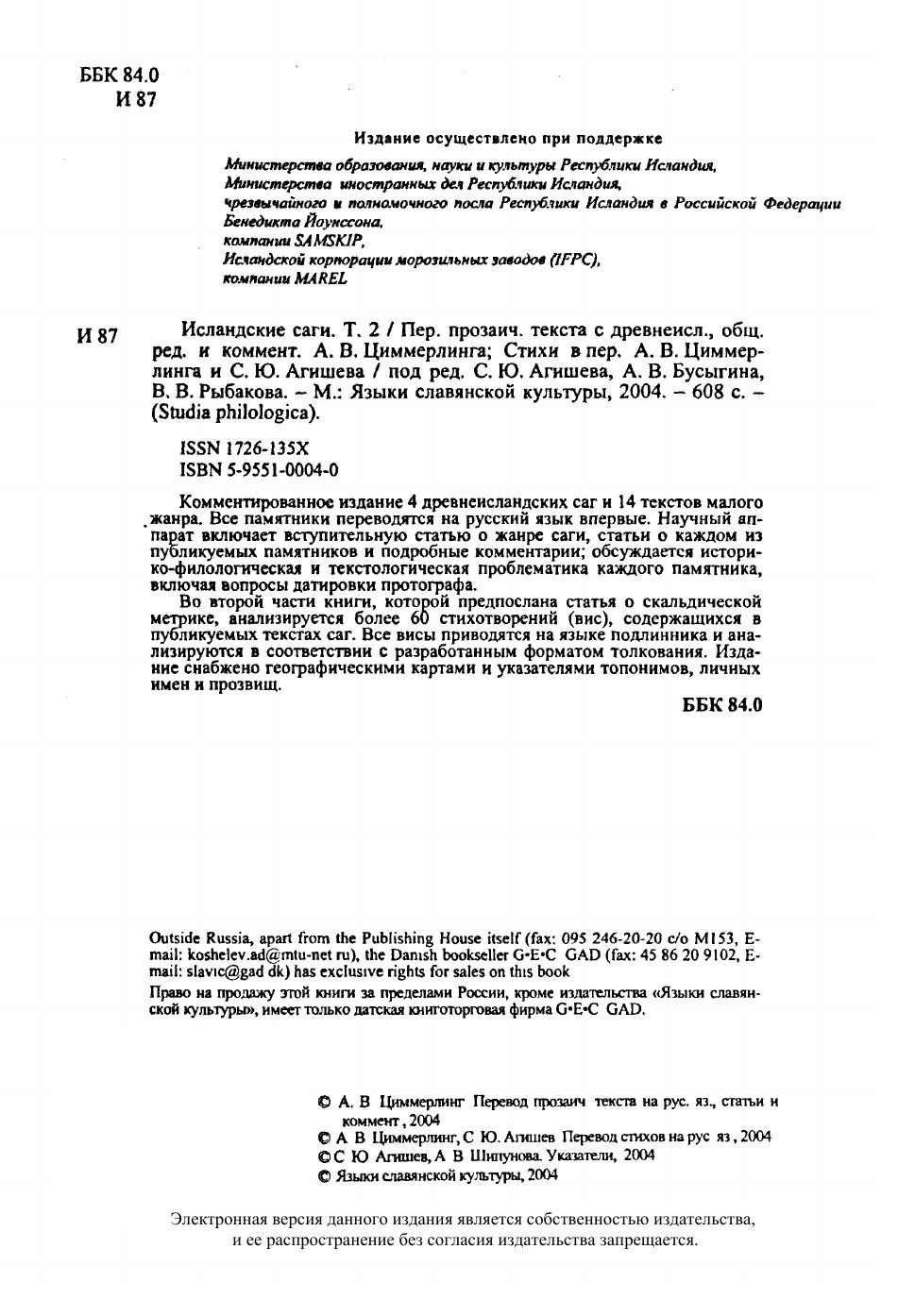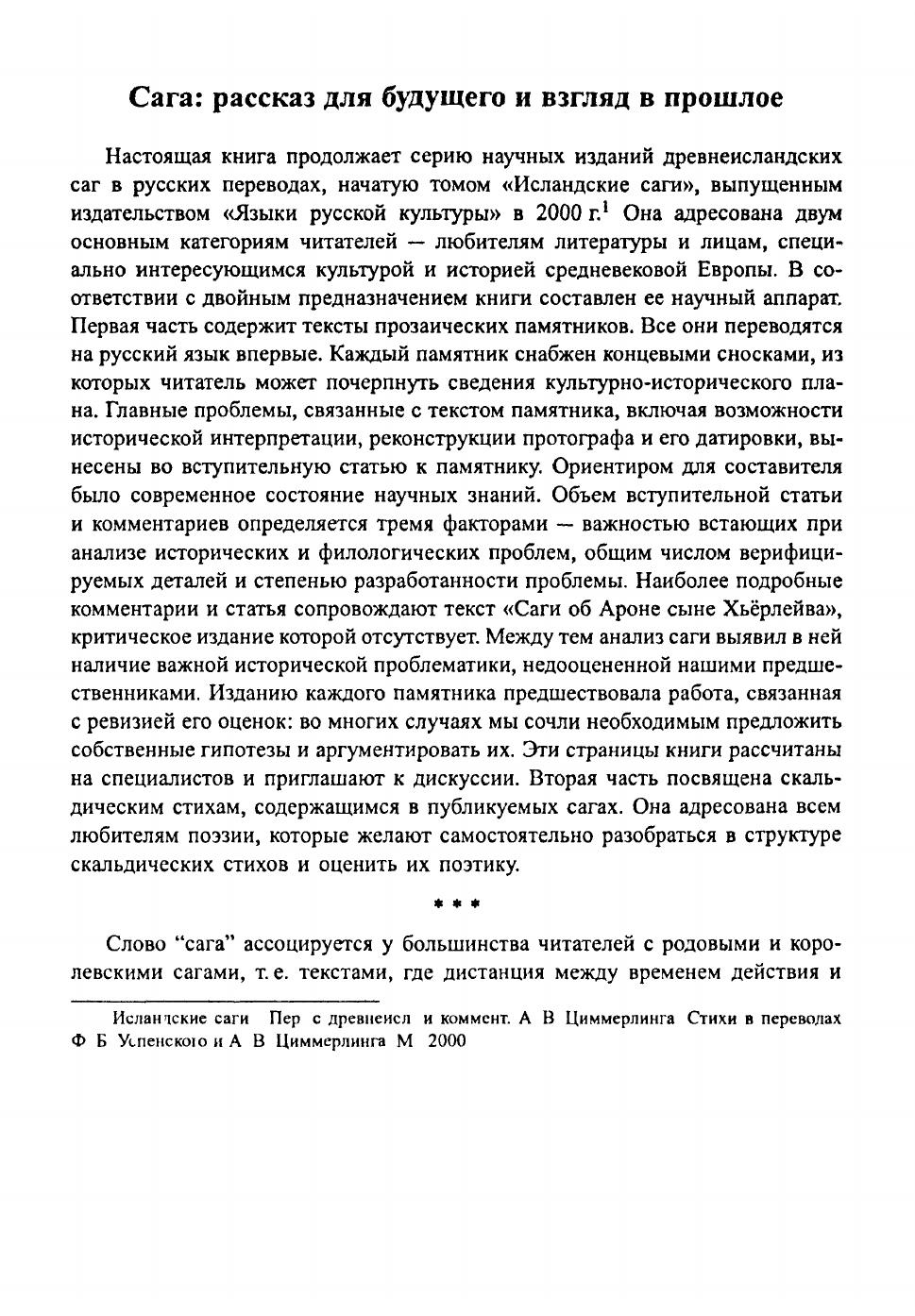 Комментированное издание 4 древнеисландских саг и 14 текстов малого жанра. Все памятники переводятся на русский язык впервые. Научный аппарат включает вступительную статью о жанре саги, статьи о каждом из публикуемых памятников и подробные комментарии, обсуждается историко-филологическая и текстологическая проблематика каждого памятника, включая вопросы датировки протографа. Во второй части книги, которой предпослана статья о скальдической метрике, анализируется более 60 стихотворений (вис), содержащихся в публикуемых текстах саг. Все висы приводятся на языке подлинника и анализируются в соответствии с разработанным форматом толкования. Издание снабжено географическими картами и указателями топонимов, личных имен и прозвищ. Для научных работников, широкого круга специалистов.