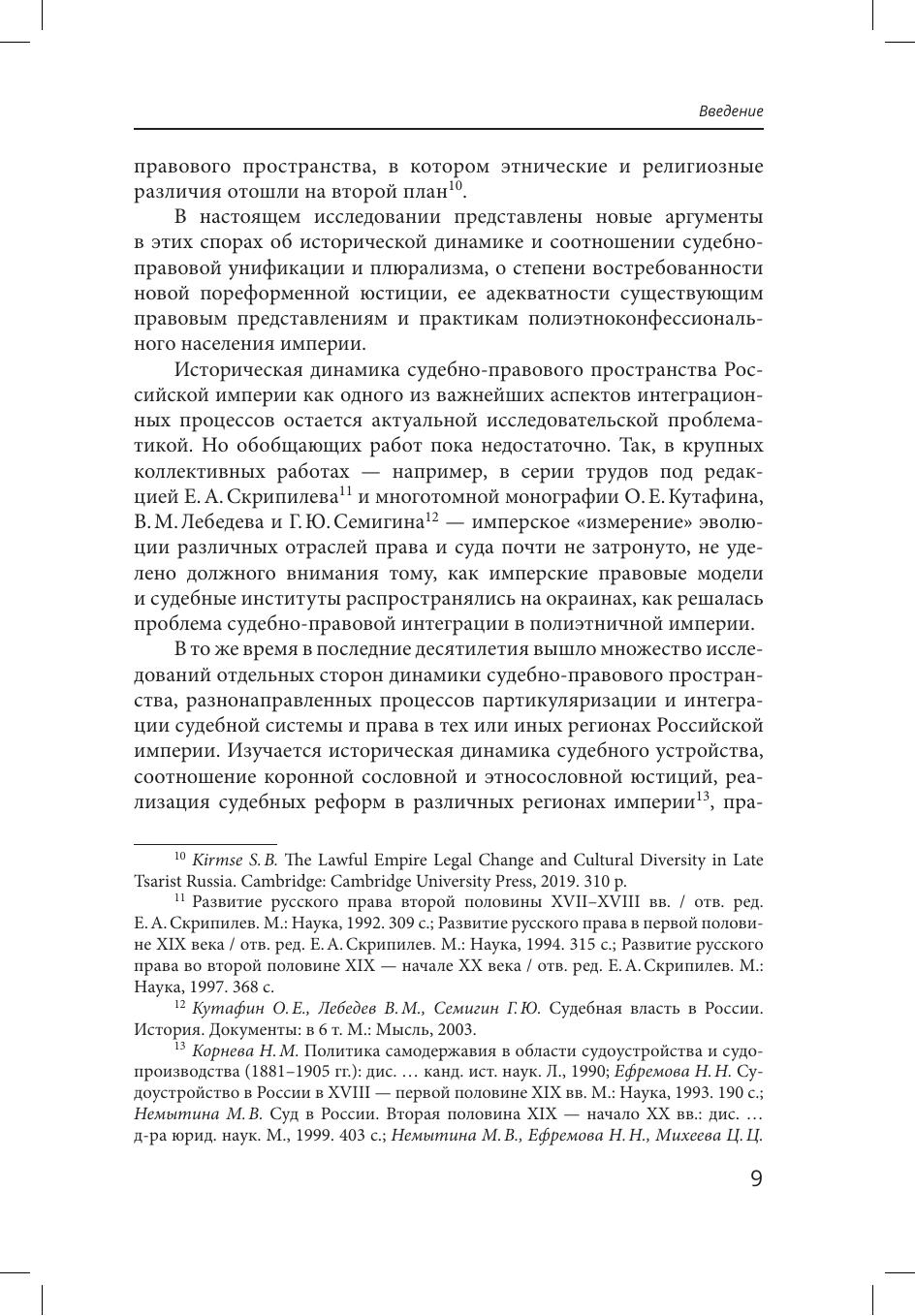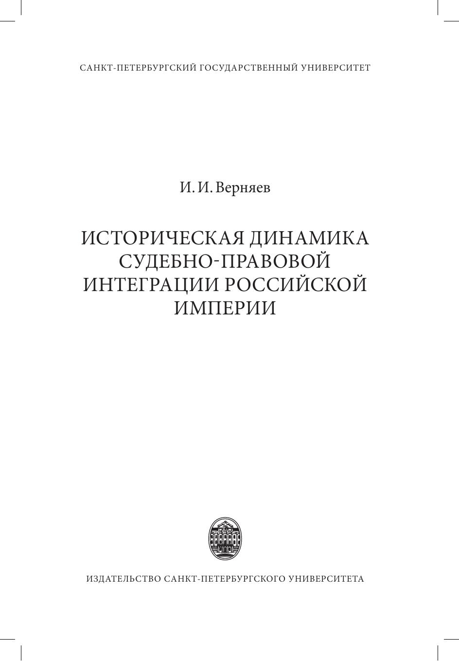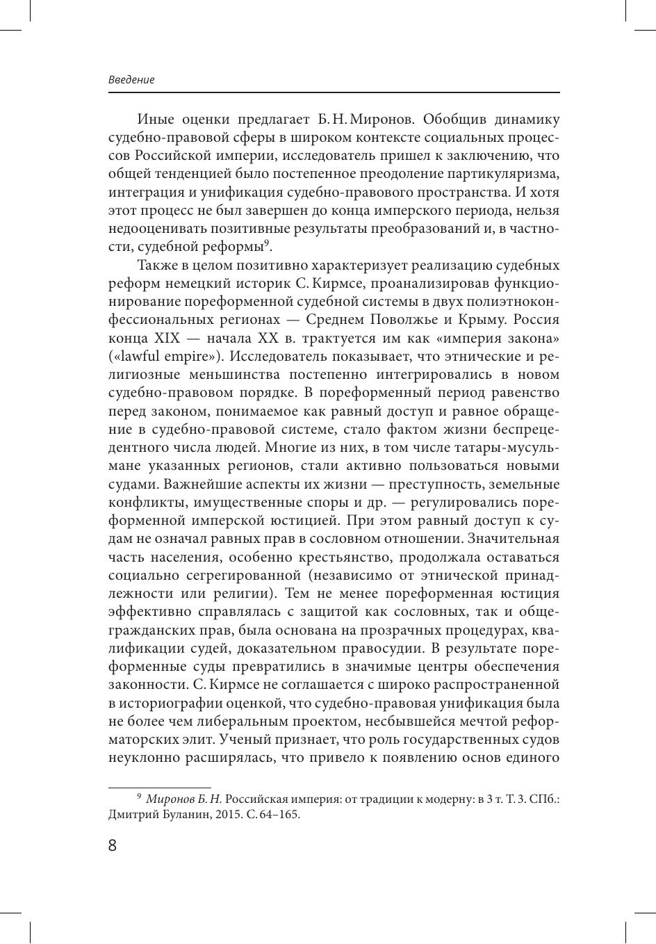 Стратегической целью государственной власти на протяжении всей истории Российской империи была интеграция и гомогенизация ее судебно правового пространства. Однако социокультурное и правовое разнообразие, высокие материальные и кадровые затраты на унификацию и функциональную дифференциацию заставляли учитывать, отчасти легализовывать и инкорпорировать правовые нормы и судебные институты сообществ империи, прибегать к образованию гибридных судебноправовых моделей. Проблема формирования общих институтов в судебно-правовой сфере устойчиво гетерогенной империи рассмотрена в исследовании как она из ключевых. Особое внимание уделено местной юстиции как массовому институту, в наибольшей степени соприкасающемуся с повседневной жизнью этнически разнообразного населения империи.