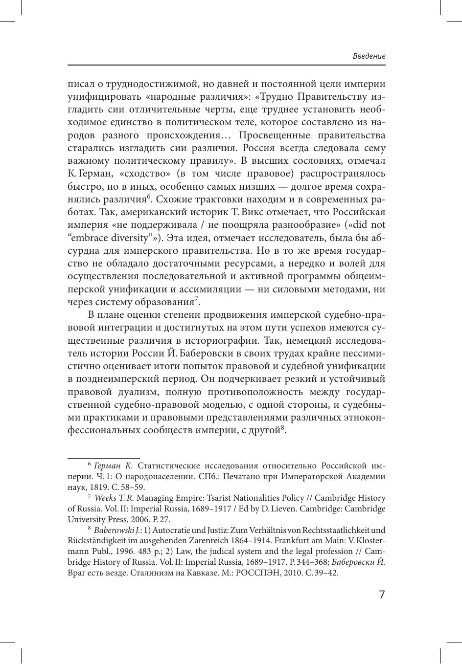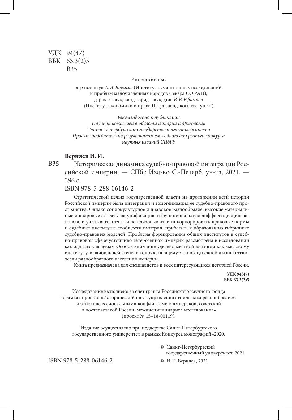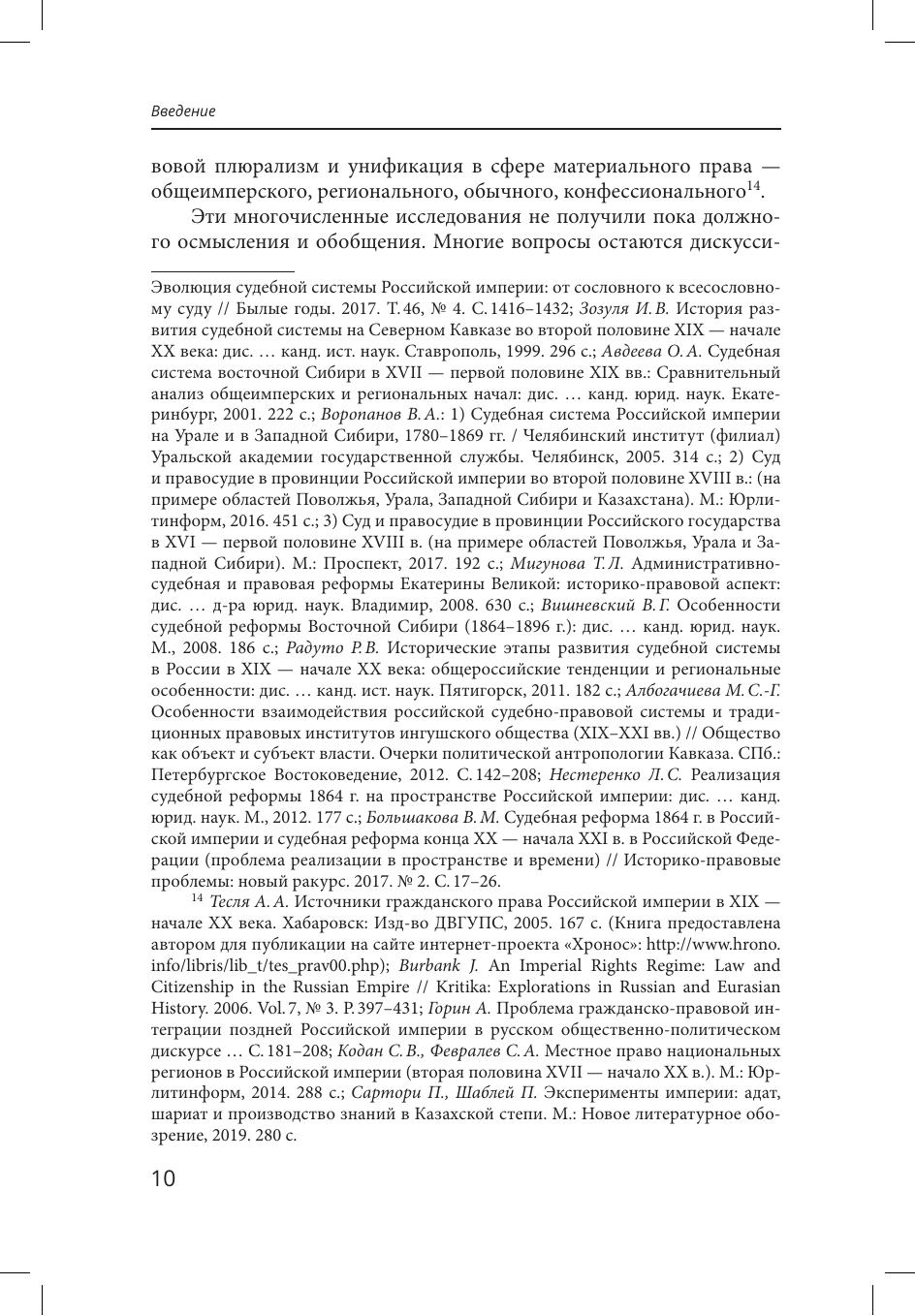Стратегической целью государственной власти на протяжении всей истории Российской империи была интеграция и гомогенизация ее судебно правового пространства. Однако социокультурное и правовое разнообразие, высокие материальные и кадровые затраты на унификацию и функциональную дифференциацию заставляли учитывать, отчасти легализовывать и инкорпорировать правовые нормы и судебные институты сообществ империи, прибегать к образованию гибридных судебноправовых моделей. Проблема формирования общих институтов в судебно-правовой сфере устойчиво гетерогенной империи рассмотрена в исследовании как она из ключевых. Особое внимание уделено местной юстиции как массовому институту, в наибольшей степени соприкасающемуся с повседневной жизнью этнически разнообразного населения империи.