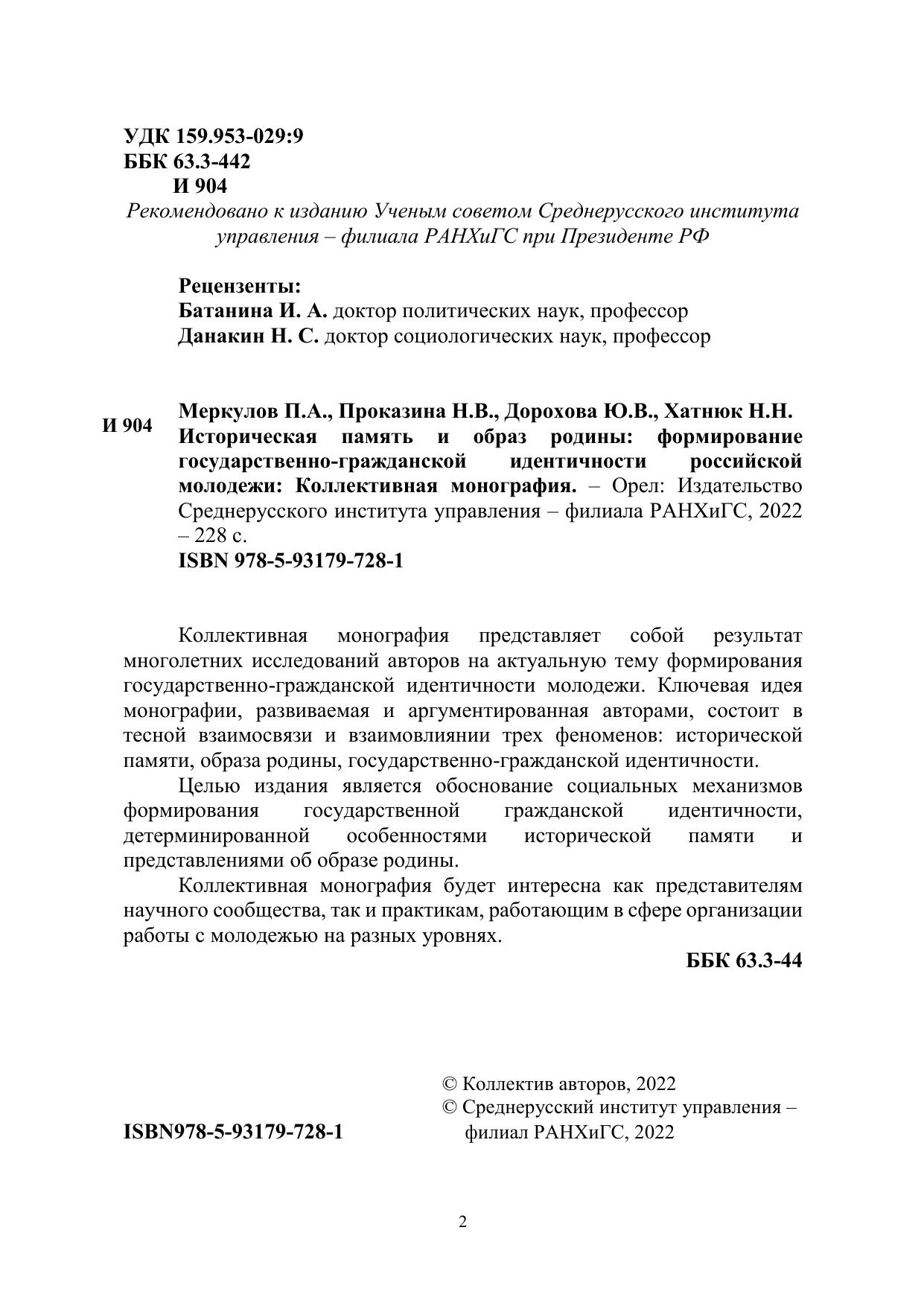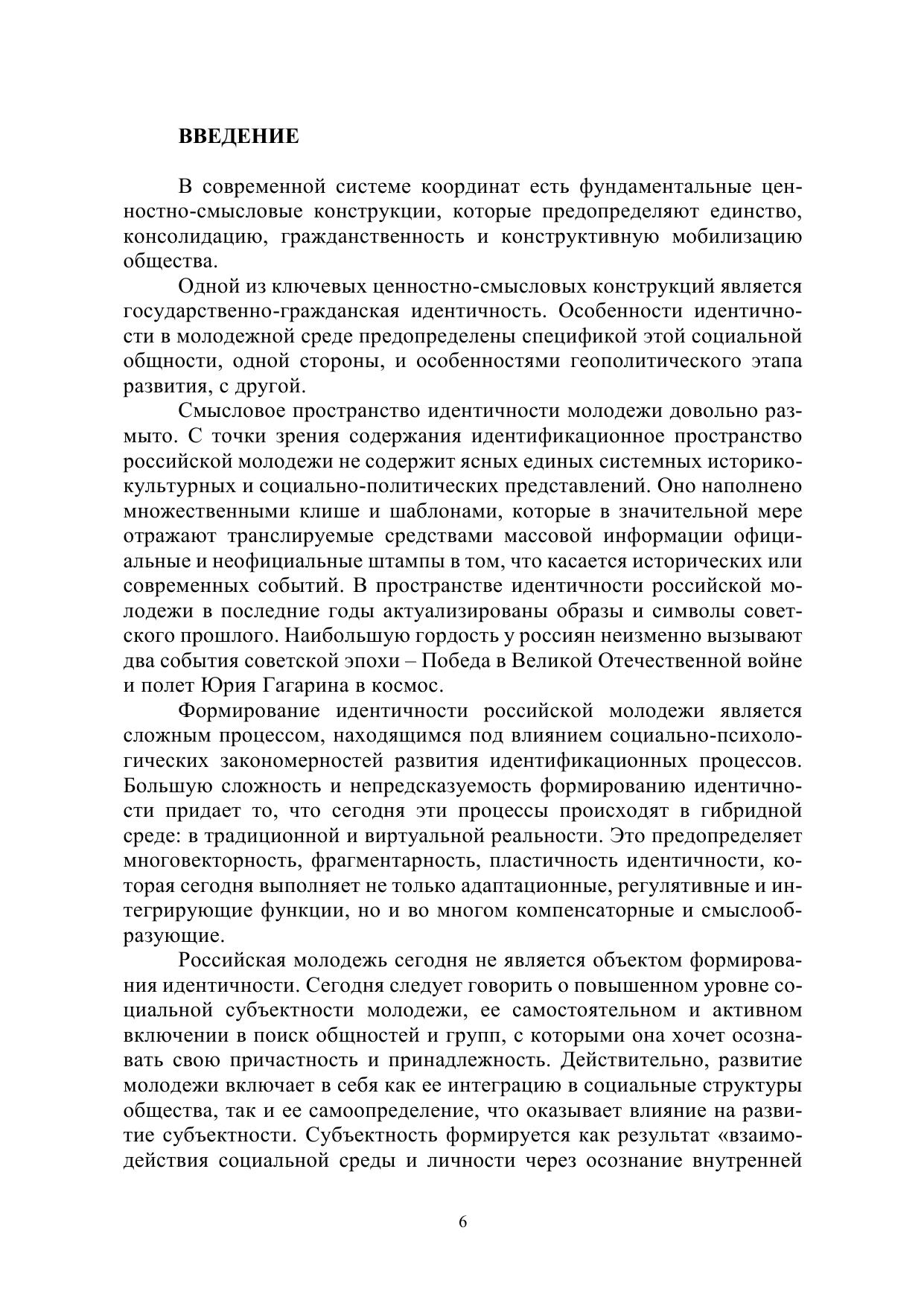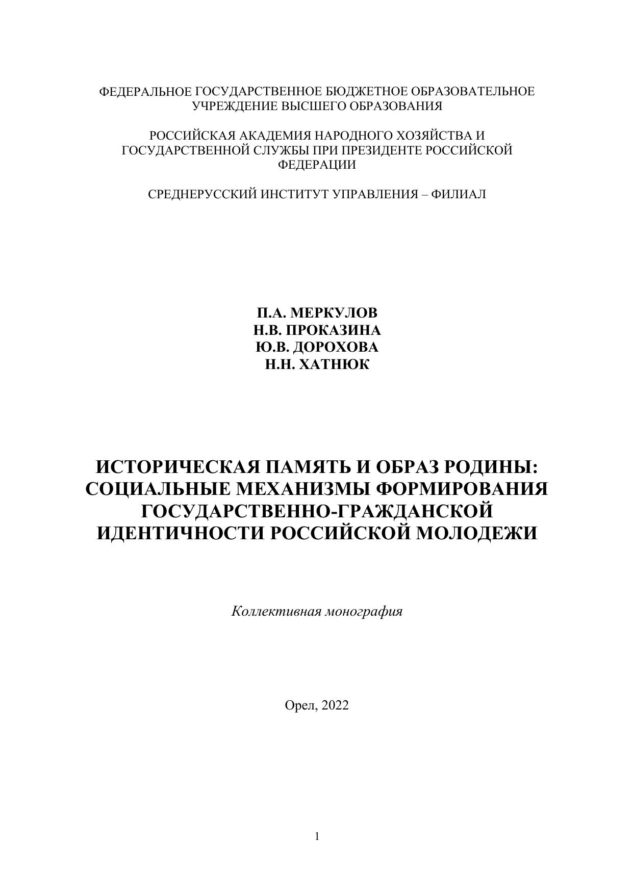 Коллективная монография представляет собой результат многолетних исследований авторов на актуальную тему формирования государственно-гражданской идентичности молодежи. Ключевая идея монографии, развиваемая и аргументированная авторами, состоит в тесной взаимосвязи и взаимовлиянии трех феноменов: исторической памяти, образа родины, государственно-гражданской идентичности. Целью издания является обоснование социальных механизмов формирования государственной гражданской идентичности, детерминированной особенностями исторической памяти и представлениями об образе родины. Коллективная монография будет интересна как представителям научного сообщества, так и практикам, работающим в сфере организации работы с молодежью на разных уровнях.