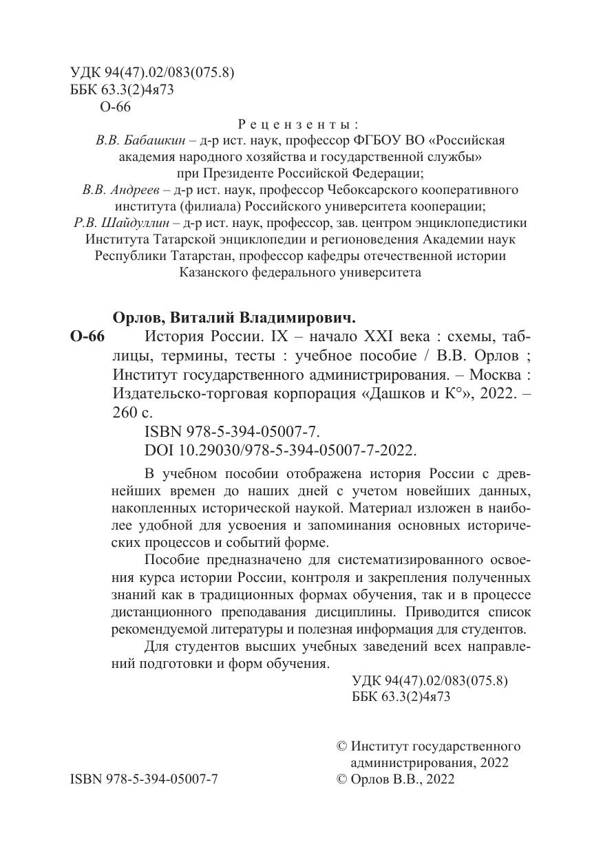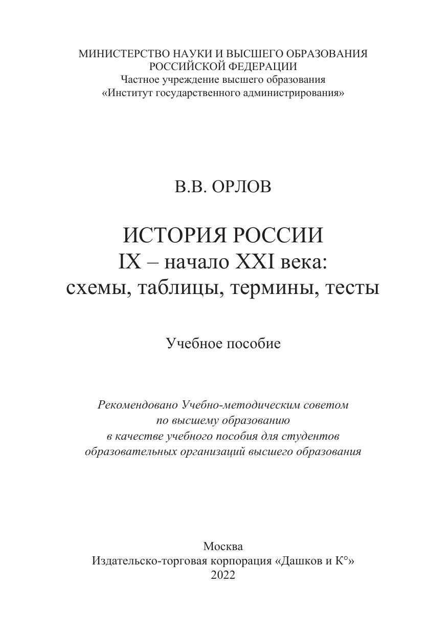 Пособие предназначено для систематизированного освоения курса истории России, контроля и закрепления полученных знаний как в традиционных формах обучения, так и в процессе дистанционного преподавания дисциплины. Приводится список рекомендуемой литературы и полезная информация для студентов.