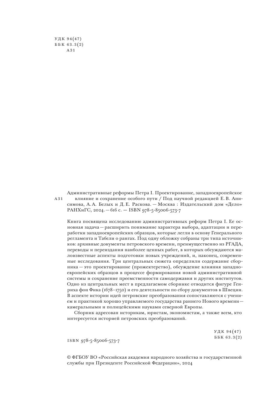 Книга посвящена исследованию административных реформ Петра I. Ее основная задача — расширить понимание характера выбора, адаптации и переработки западноевропейских образцов, которые легли в основу Генерального регламента и Табели о рангах. Под одну обложку собраны три типа источников: архивные документы петровского времени, преимущественно из РГАДА, переводы и переиздания наиболее ценных работ, в которых обсуждаются малоизвестные аспекты подготовки новых учреждений, и, наконец, современные исследования. Три центральных сюжета определили содержание сборника — это проектирование (прожектерство), обсуждение влияния западноевропейских образцов в процессе формирования новой административной системы и сохранение преемственности самодержавия и других институтов. Одно из центральных мест в предлагаемом сборнике отводится фигуре Генриха фон Фика (1678–1750) и его деятельности по сбору документов в Швеции. В аспекте истории идей петровские преобразования сопоставляются с учением и практикой хорошо управляемого государства раннего Нового времени — камеральными и полицейскими науками северной Европы. Сборник адресован историкам, юристам, экономистам, а также всем, кто интересуется историей петровских преобразований.