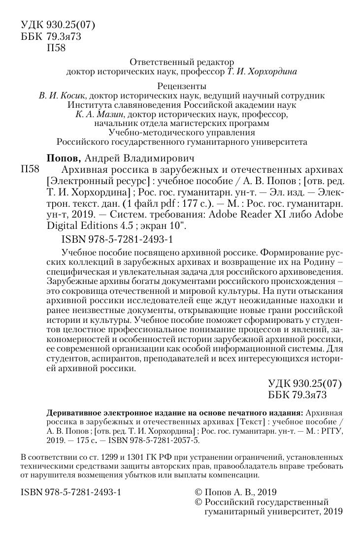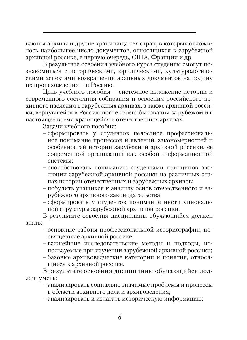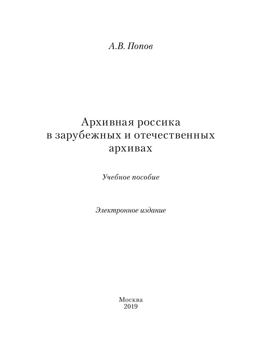 Учебное пособие посвящено архивной россике. Формирование русских коллекций в зарубежных архивах и возвращение их на Родину – специфическая и увлекательная задача для российского архивоведения. Зарубежные архивы богаты документами российского происхождения – это сокровища отечественной и мировой культуры. На пути отыскания архивной россики исследователей еще ждут неожиданные находки и ранее неизвестные документы, открывающие новые грани российской истории и культуры. Учебное пособие поможет сформировать у студентов целостное профессиональное понимание процессов и явлений, закономерностей и особенностей истории зарубежной архивной россики, ее современной организации как особой информационной системы. Для студентов, аспирантов, преподавателей и всех интересующихся историей архивной россики.
