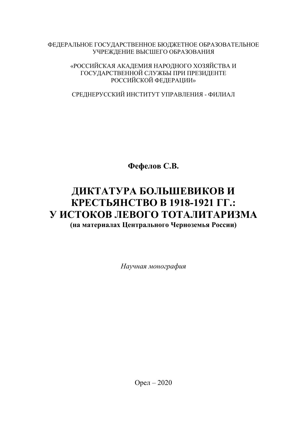 Диктатура большевиков и крестьянства 1918-1921 гг.: у истоков левого тоталитаризма (на материалах Центрального Черноземья России)