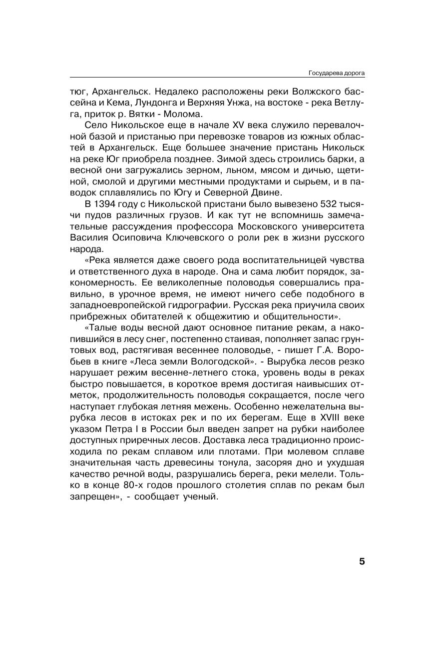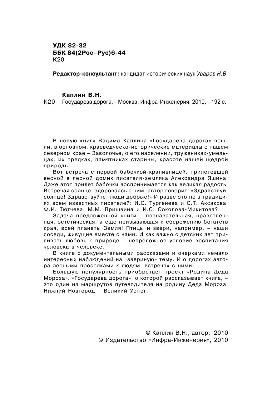 В новую книгу Вадима Каплина "Государева дорога" вошли, в основном, краеведческо-исторические материалы о нашем северном крае - Заволочье, о его населении, тружениках-умельцах, их предках, памятниках старины, красоте нашей щедрой природы. Вот встреча с первой бабочкой-крапивницей, прилетевшей весной в лесной домик писателя-земляка Александра Яшина. Даже этот прилет бабочки воспринимается как великая радость! Встречая солнце, здороваясь с ним, автор говорит: "Здравствуй, солнце! Здравствуйте, люди добрые!" И разве это не в традициях всем известных писателей: И.С.Тургенева и С.Т.Аксакова, Ф.И.Тютчева, М.М.Пришвина и И.С.Соколова-Микитова? Задача предложенной книги - познавательная, нравственная, эстетическая, а еще призывающая к сбережению богатств края, всей планеты Земля! Птицы и звери, например, - наши соседи, живущие вместе с нами. И как важно с детских лет прививать любовь к природе - непреложное условие воспитания человека в человеке. В книге с документальными рассказами и очерками немало интересных наблюдений на "звериную" тему. И о дорогах автора лесными проселками к людям, встречах с ними. Большую популярность приобретает проект "Родина Деда Мороза". "Государева дорога", о которой рассказывает книга, - это один из маршрутов путеводителя на родину Деда Мороза: Нижний Новгород - Великий Устюг
