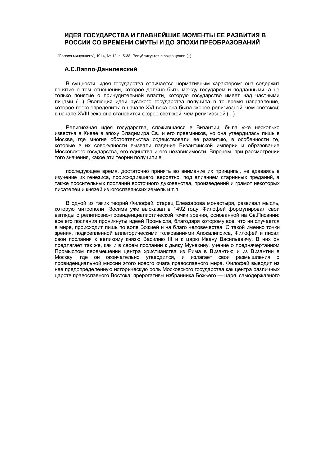Идея государства и главнейшие моменты ее развития в России со времени Смуты и до эпохи преобразований.