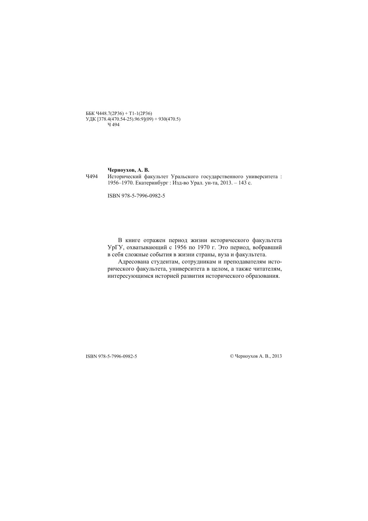 В книге отражен период жизни исторического факультета УрГУ, охватывающий с 1956 по 1970 г. Это период, вобравший в себя сложные события в жизни страны, вуза и факультета. Адресована студентам, сотрудникам и преподавателям исторического факультета, университета в целом, а также читателям, интересующимся историей развития исторического образования.