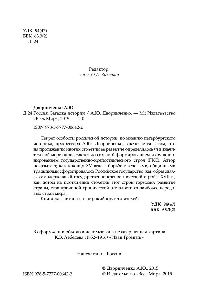Секрет особости российской истории, по мнению петербургского историка, профессора А.Ю. Дворниченко, заключается в том, что на протяжении многих столетий ее развитие определялось (и в значительной мере определяется до сих пор) формированием и функционированием государственно крепостнического строя (ГКС). Автор показывает, как к концу XV века в борьбе с вечевыми, общинными традициями сформировалось Российское государство, как образовался самодержавный государственно крепостнический строй в XVII в., как потом на протяжении столетий этот строй тормозил развитие страны, став причиной хронической отсталости от наиболее передовых стран мира. Книга рассчитана на широкий круг читателей.