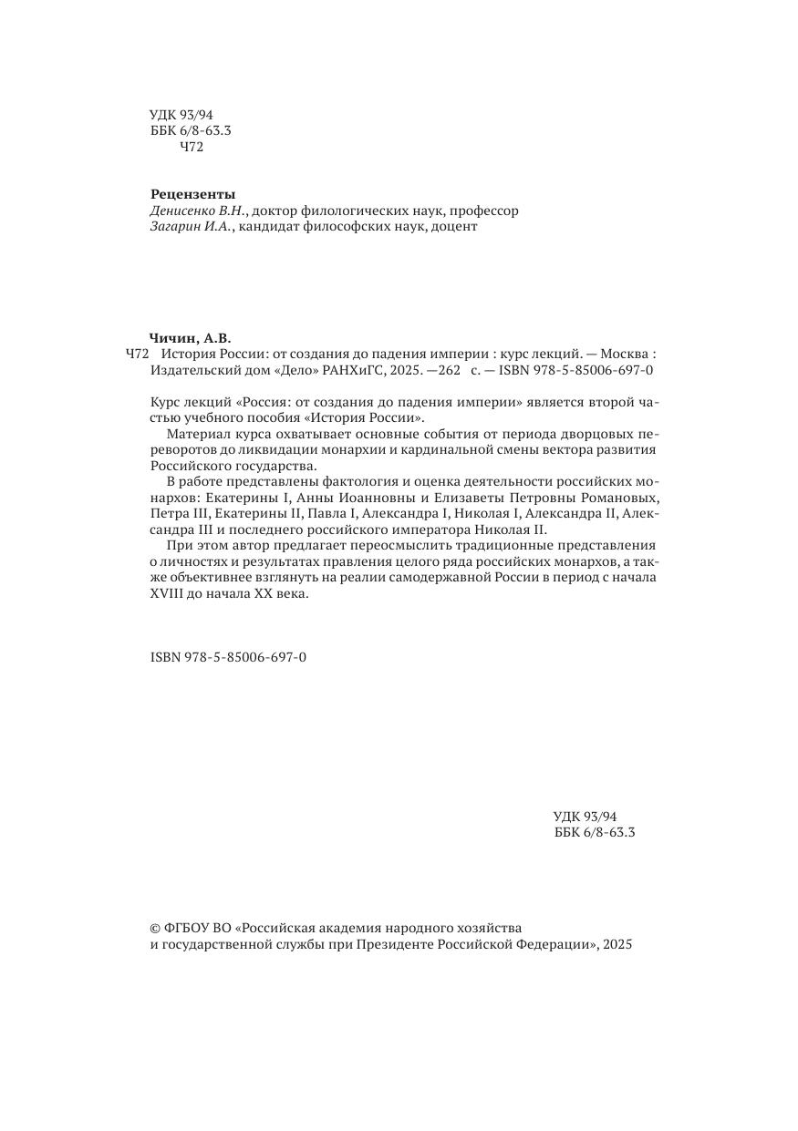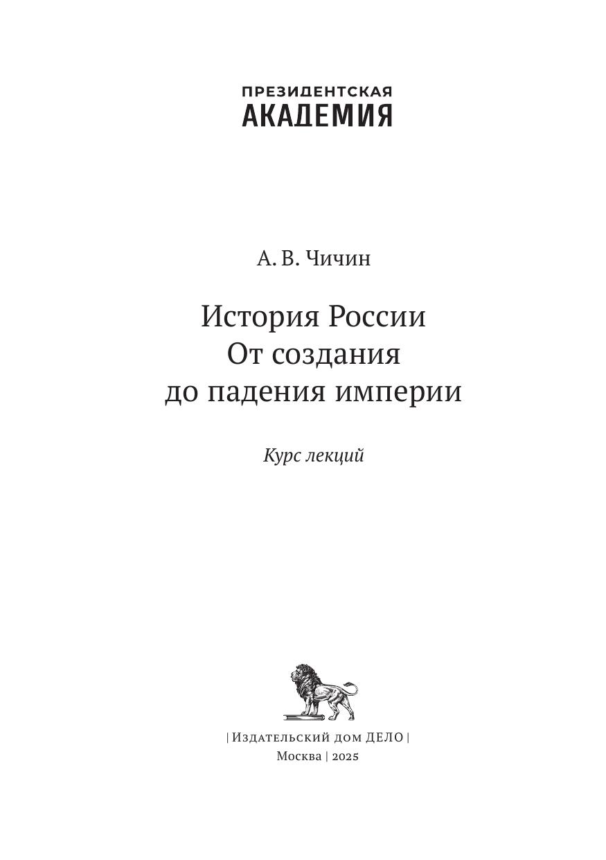 Курс лекций «Россия: от создания до падения империи» является второй частью учебного пособия «История России». Материал курса охватывает основные события от периода дворцовых переворотов до ликвидации монархии и кардинальной смены вектора развития Российского государства. В работе представлены фактология и оценка деятельности российских монархов: Екатерины I, Анны Иоанновны и Елизаветы Петровны Романовых, Петра III, Екатерины II, Павла I, Александра I, Николая I, Александра II, Александра III и последнего российского императора Николая II. При этом автор предлагает переосмыслить традиционные представления о личностях и результатах правления целого ряда российских монархов, а также объективнее взглянуть на реалии самодержавной России в период с начала XVIII до начала XX века.