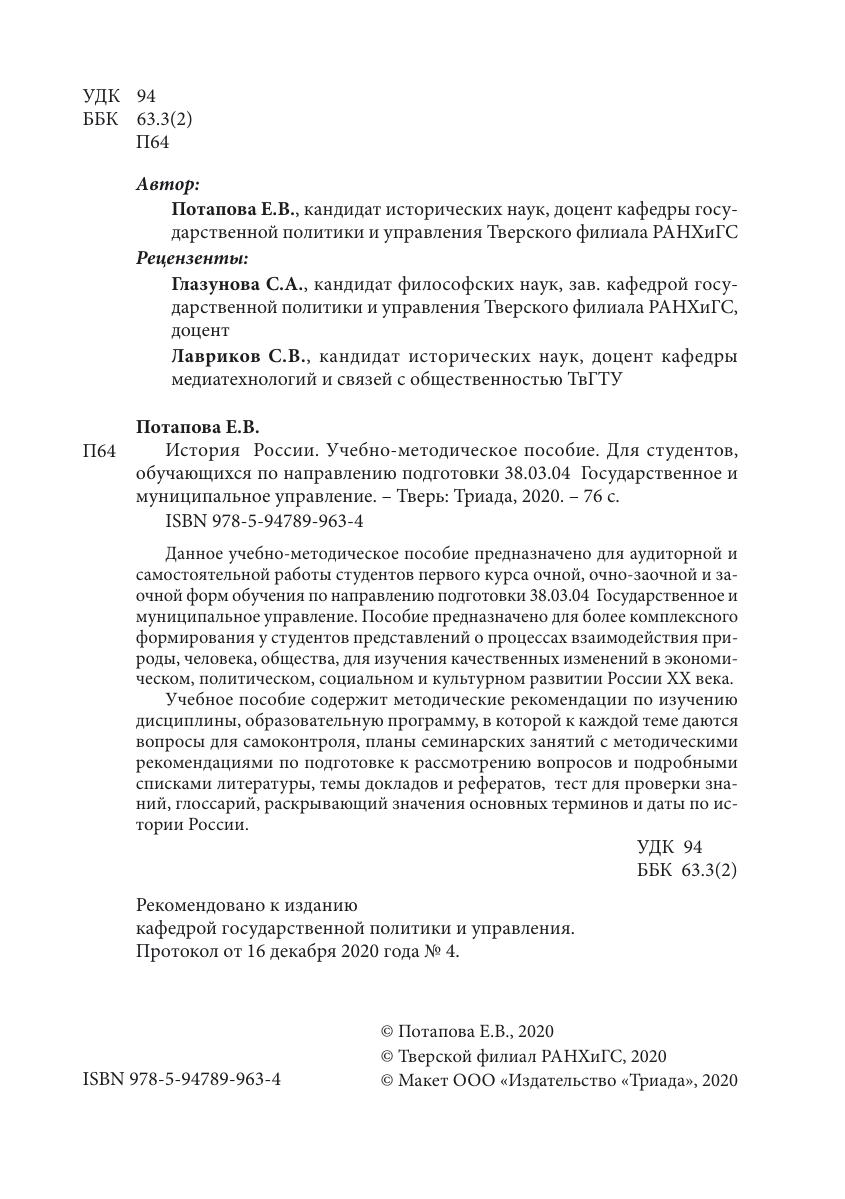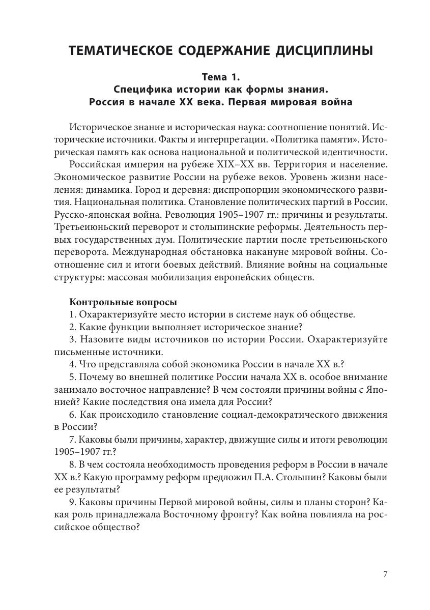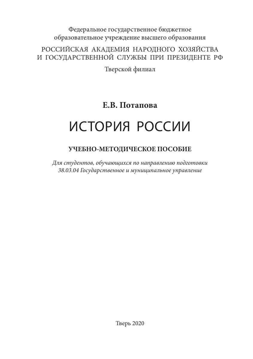 Данное учебно-методическое пособие предназначено для аудиторной и самостоятельной работы студентов первого курса очной, очно-заочной и заочной форм обучения по направлению подготовки 38.03.04 Государственное и муниципальное управление. Пособие предназначено для более комплексного формирования у студентов представлений о процессах взаимодействия природы, человека, общества, для изучения качественных изменений в экономическом, политическом, социальном и культурном развитии России XX века. Учебное пособие содержит методические рекомендации по изучению дисциплины, образовательную программу, в которой к каждой теме даются вопросы для самоконтроля, планы семинарских занятий с методическими рекомендациями по подготовке к рассмотрению вопросов и подробными списками литературы, темы докладов и рефератов, тест для проверки знаний, глоссарий, раскрывающий значения основных терминов и даты по истории России.