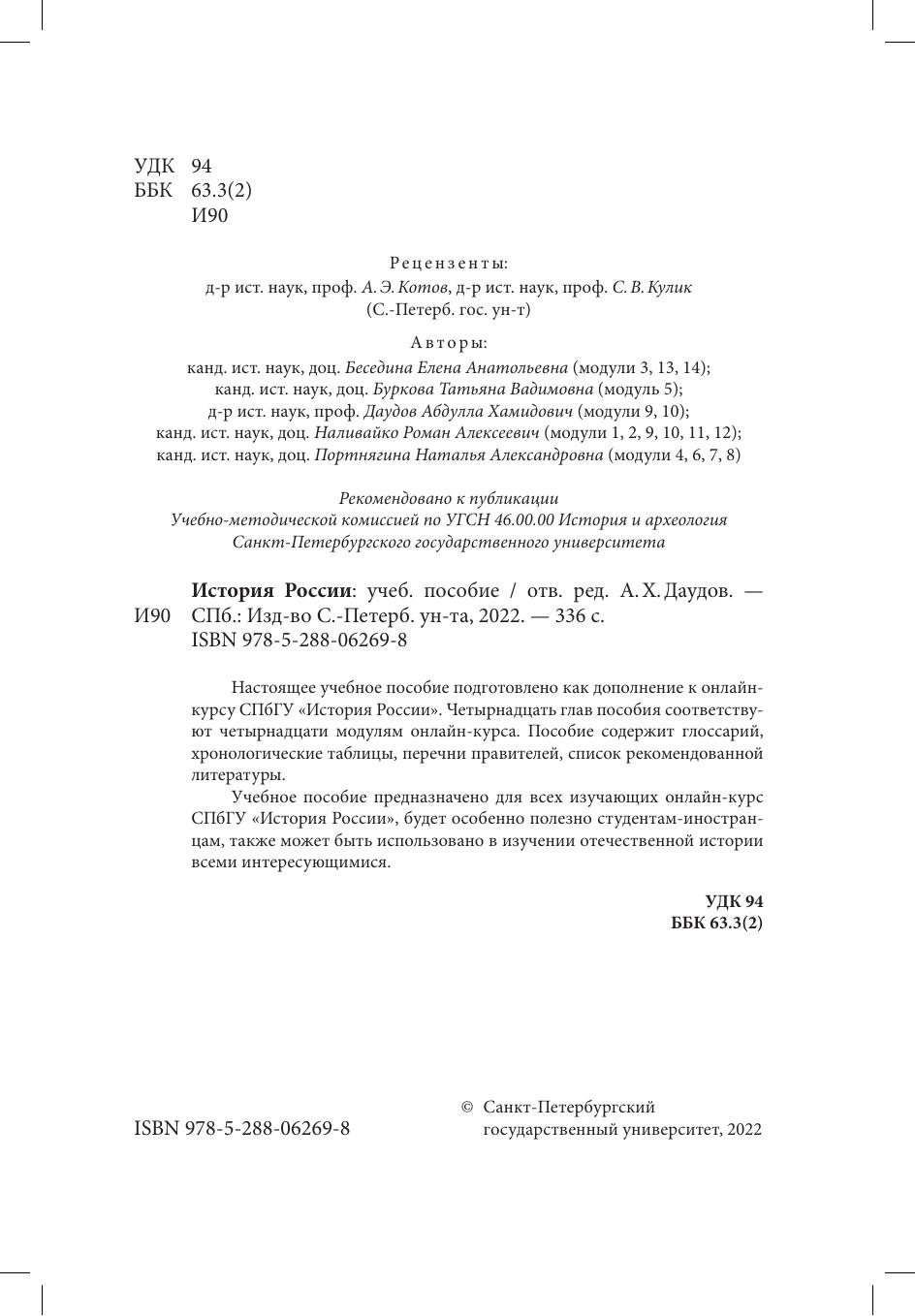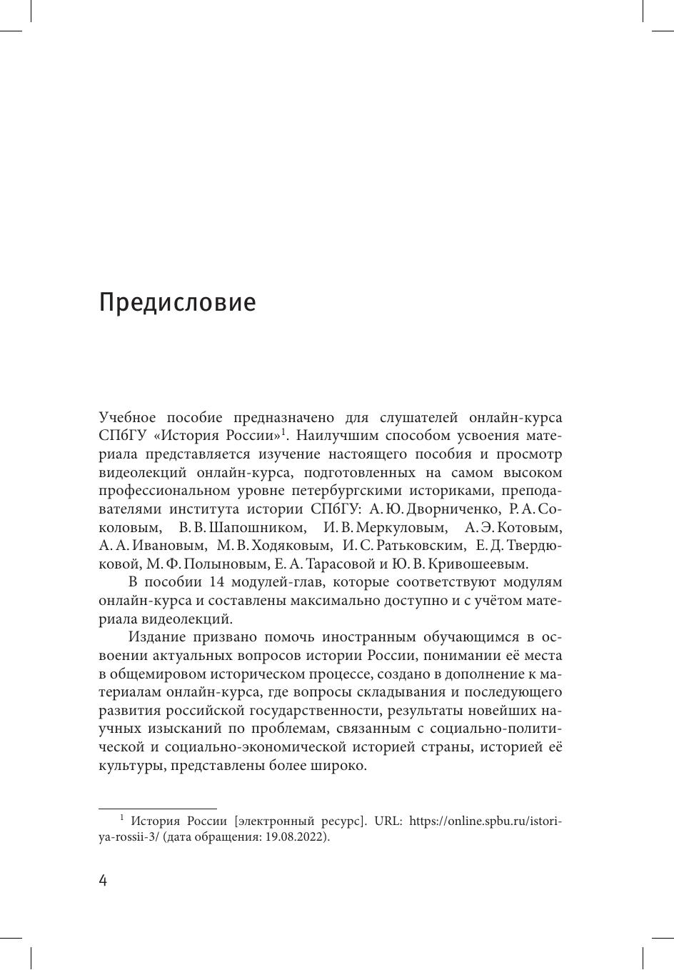 Настоящее учебное пособие подготовлено как дополнение к онлайн-курсу СПбГУ «История России». Четырнадцать глав пособия соответствуют четырнадцати модулям онлайн-курса. Пособие содержит глоссарий, хронологические таблицы, перечни правителей, список рекомендованной литературы. Учебное пособие предназначено для всех изучающих онлайн-курс СПбГУ «История России», будет особенно полезно студентам-иностранцам, также может быть использовано в изучении отечественной истории всеми интересующимися.