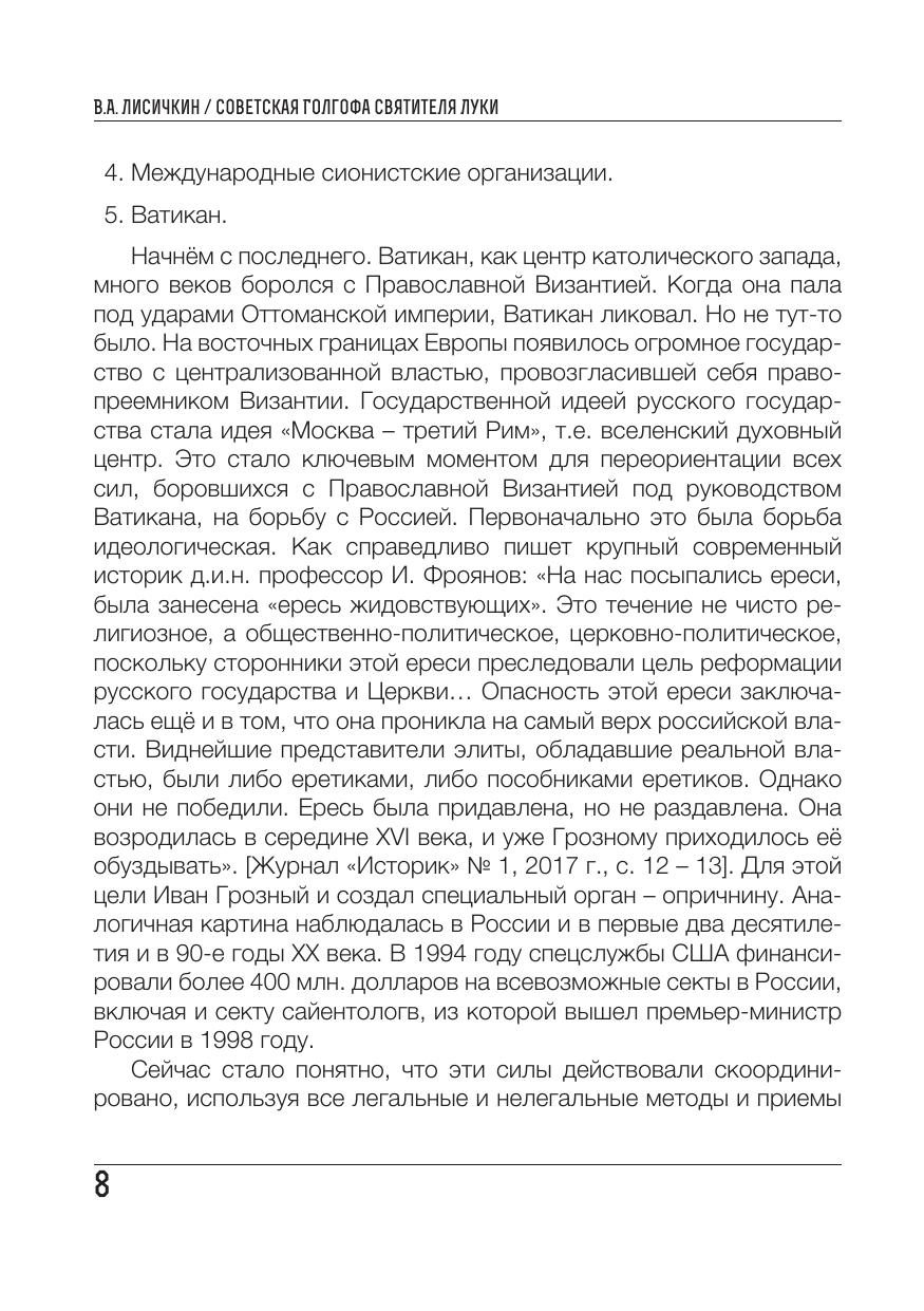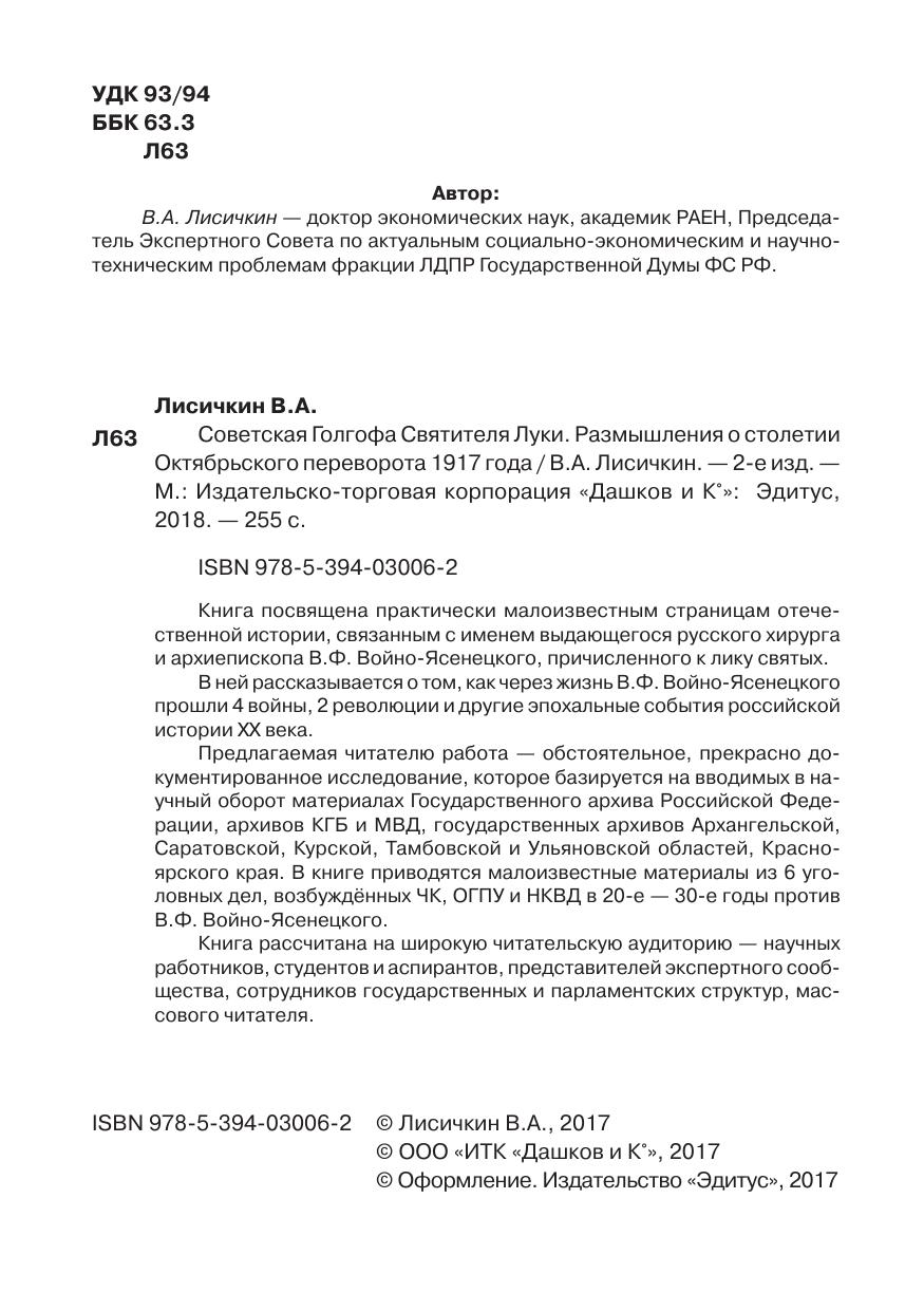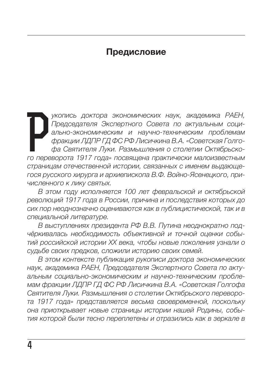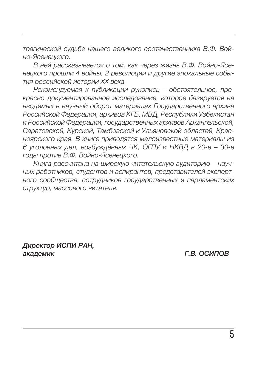 Книга посвящена практически малоизвестным страницам отечественной истории, связанным с именем выдающегося русского хирурга и архиепископа В.Ф. Войно-Ясенецкого, причисленного к лику святых. В ней рассказывается о том, как через жизнь В.Ф. Войно-Ясенецкого прошли 4 войны, 2 революции и другие эпохальные события российской истории XX века. Предлагаемая читателю работа — обстоятельное, прекрасно документированное исследование, которое базируется на вводимых в научный оборот материалах Государственного архива Российской Федерации, архивов КГБ и МВД, государственных архивов Архангельской, Саратовской, Курской, Тамбовской и Ульяновской областей, Красноярского края. В книге приводятся малоизвестные материалы из 6 уголовных дел, возбуждённых ЧК, ОГПУ и НКВД в 20-е — 30-е годы против В.Ф. Войно-Ясенецкого. Книга рассчитана на широкую читательскую аудиторию — научных работников, студентов и аспирантов, представителей экспертного сообщества, сотрудников государственных и парламентских структур, массового читателя.