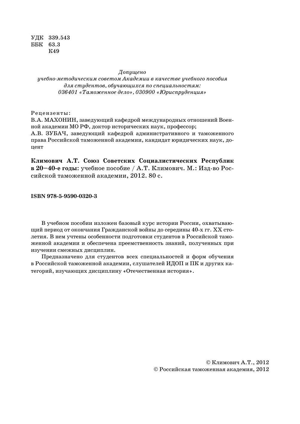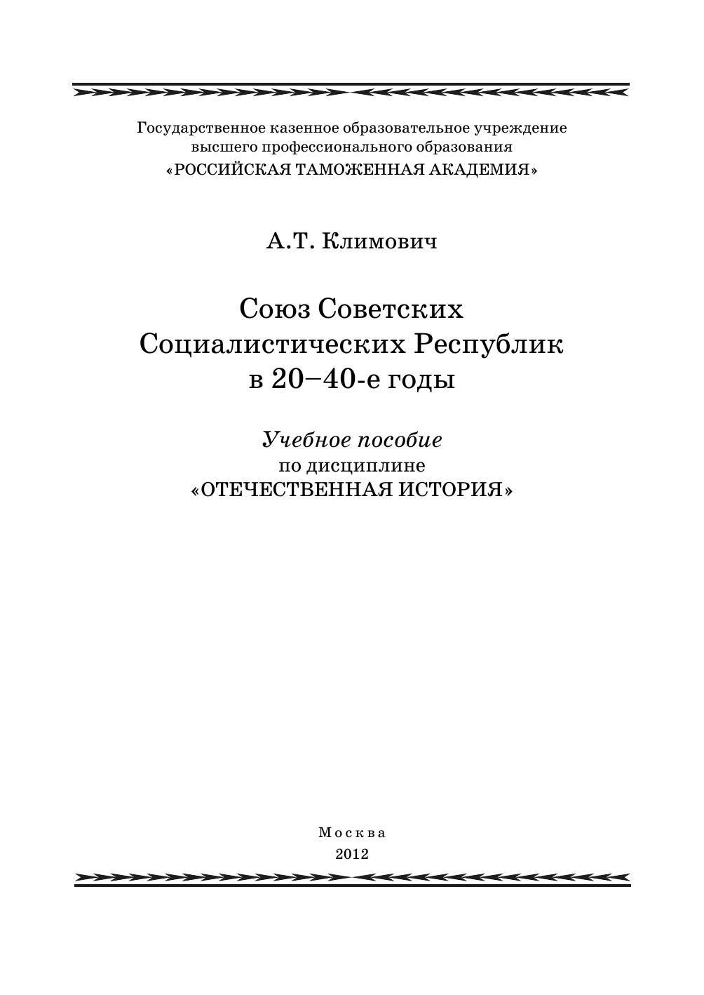 В учебном пособии изложен базовый курс истории России, охватывающий период от окончания Гражданской войны до середины 40-х гг. XX столетия. В нем учтены особенности подготовки студентов в Российской таможенной академии и обеспечена преемственность знаний, полученных при изучении смежных дисциплин. Предназначено для студентов всех специальностей и форм обучения в Российской таможенной академии, слушателей ИДОП и ПК и других категорий, изучающих дисциплину «Отечественная история».
