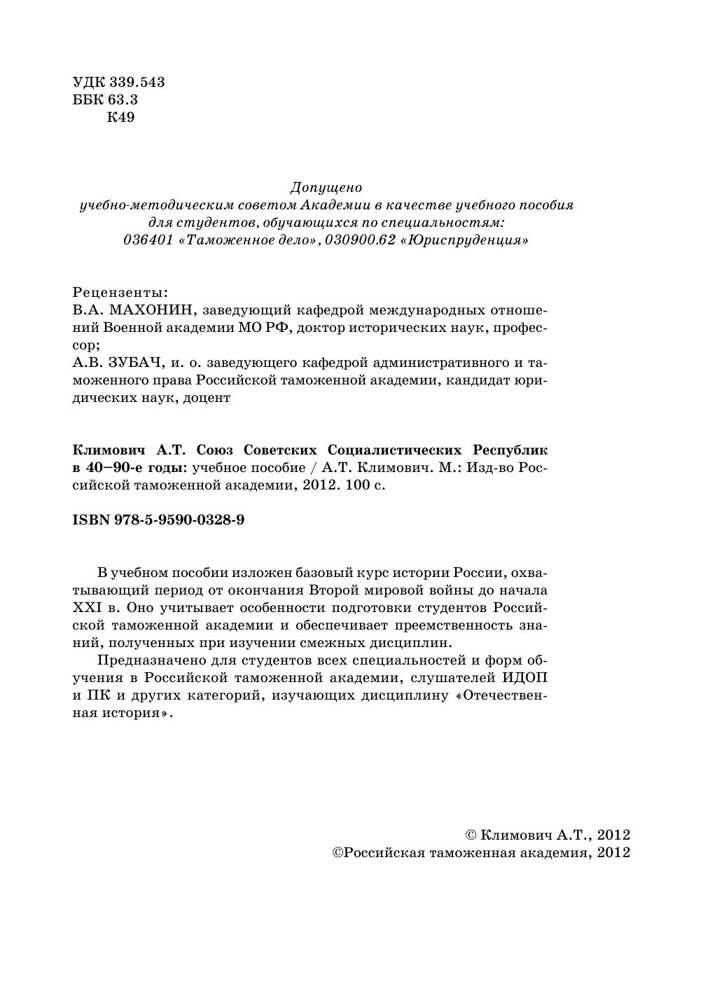 В учебном пособии изложен базовый курс истории России, охватывающий период от окончания Второй мировой войны до начала XXI в. Оно учитывает особенности подготовки студентов Российской таможенной академии и обеспечивает преемственность знаний, полученных при изучении смежных дисциплин. Предназначено для студентов всех специальностей и форм обучения в Российской таможенной академии, слушателей ИДОП и ПК и других категорий, изучающих дисциплину «Отечественная история».