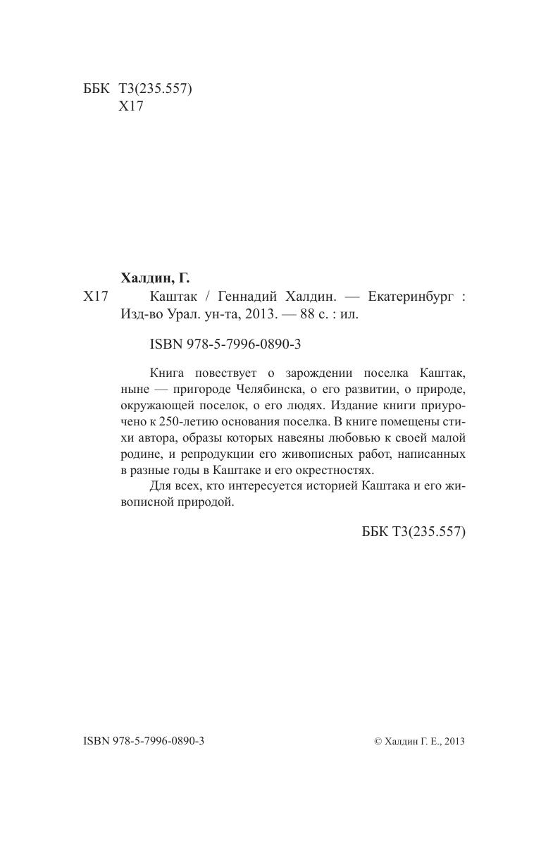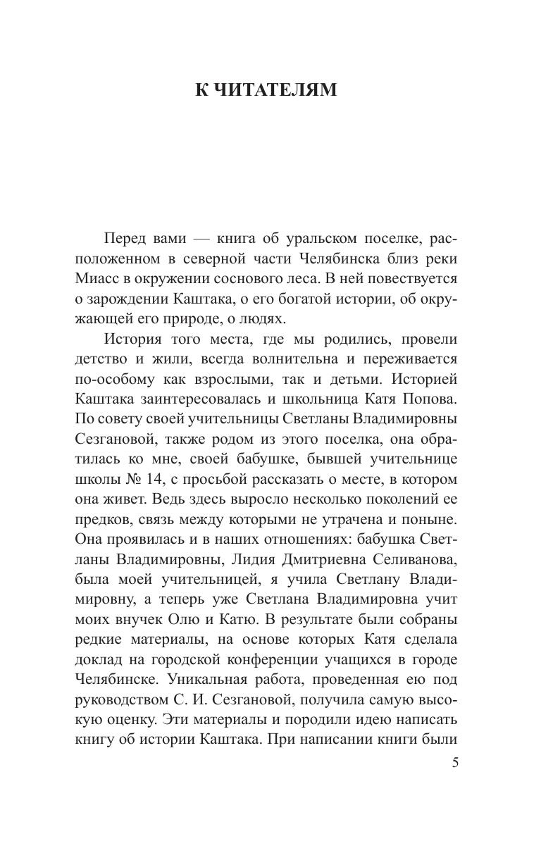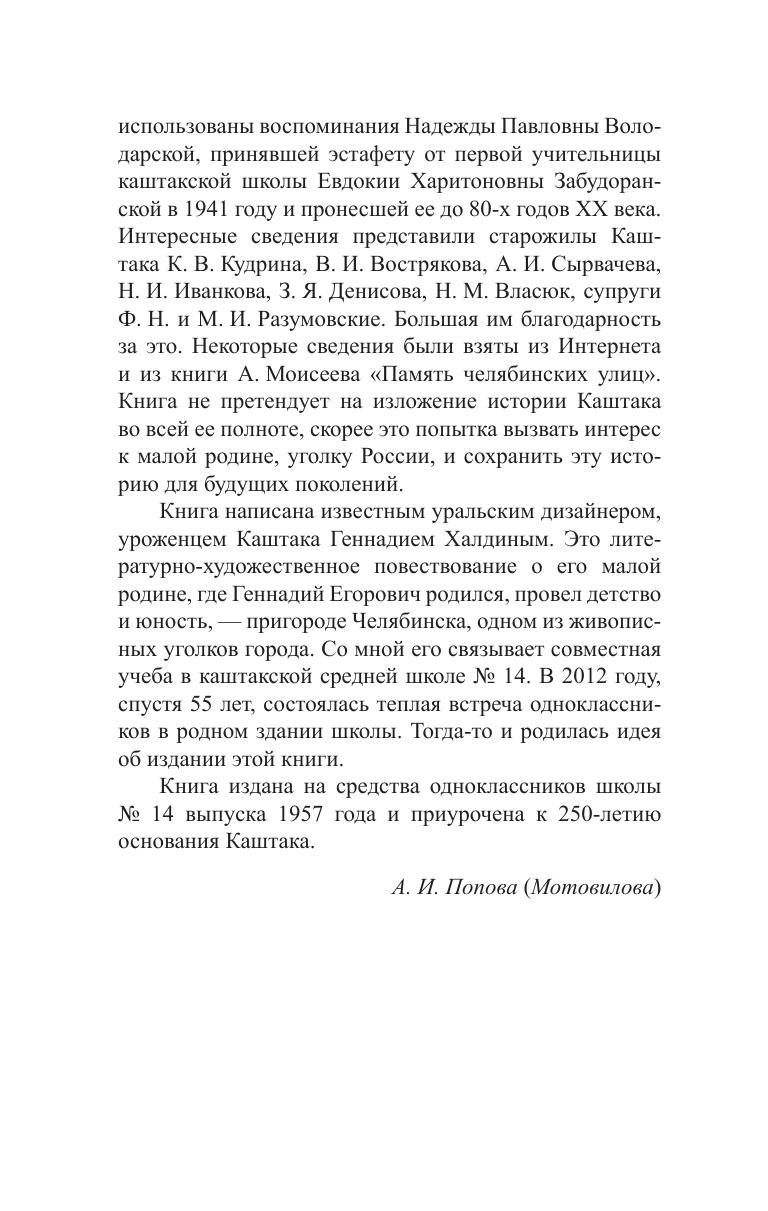 Книга повествует о зарождении поселка Каштак, ныне — пригороде Челябинска, о его развитии, о природе, окружающей поселок, о его людях. Издание книги приурочено к 250-летию основания поселка. В книге помещены стихи автора, образы которых навеяны любовью к своей малой родине, и репродукции его живописных работ, написанных в разные годы в Каштаке и его окрестностях. Для всех, кто интересуется историей Каштака и его живописной природой.