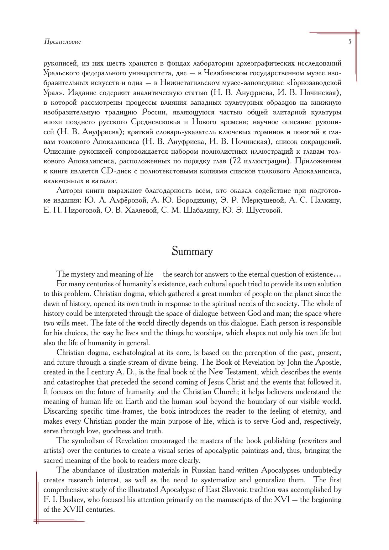 Книга посвящена анализу старообрядческих списков лицевого толкового Апокалипсиса из книгохранилищ Урала. Она содержит каталог полных научных описаний девяти рукописей, аналитическую статью, CD-диск с полно- текстовыми копиями памятников письменности, включенных в каталог. Прослежена история формирования и развития в России комплексов иллюстраций к толковому Апокалипсису. Важнейшим аспектом этой истории, рассмотренным авторами, стали процессы влияния западных культурных образцов на книжную изобразительную традицию России, которая являлась частью общей элитарной культуры эпохи позднего русского Средневековья и Нового времени. Элементы западноевропейского влияния прослежены в ходе подробного анализа художественных особенностей каждой рукописи, составившей источниковую базу исследования. Для специалистов – историков, искусствоведов, а также для широкого круга людей, интересующихся проблемами российской истории и культуры.
