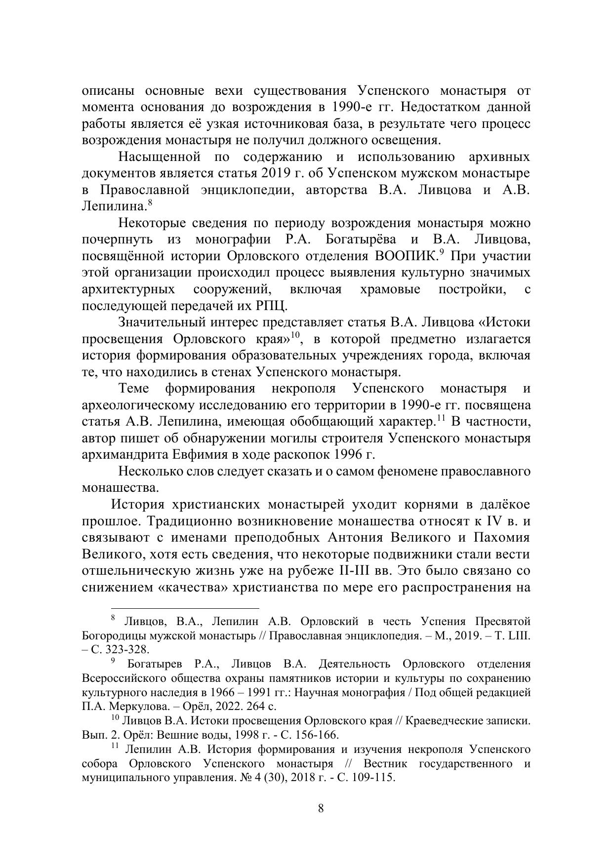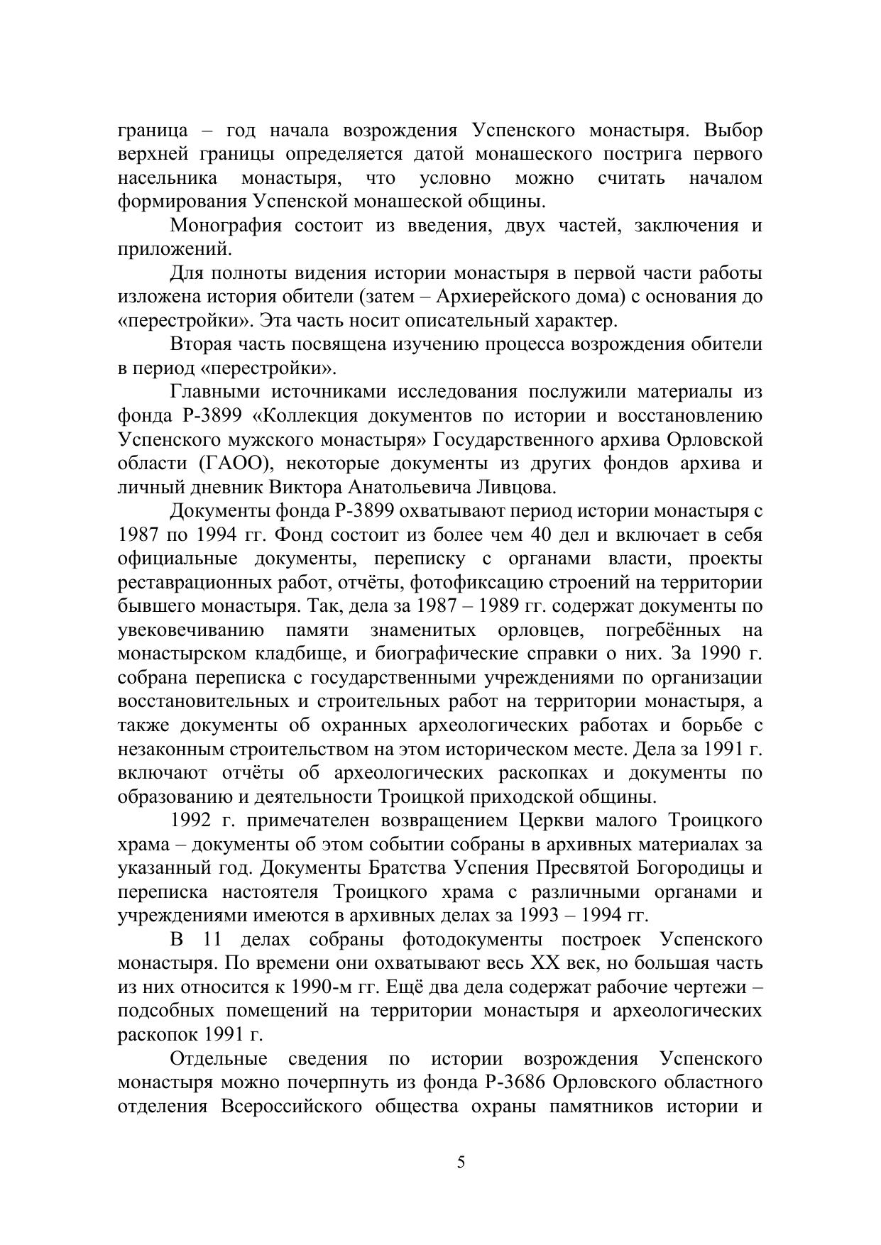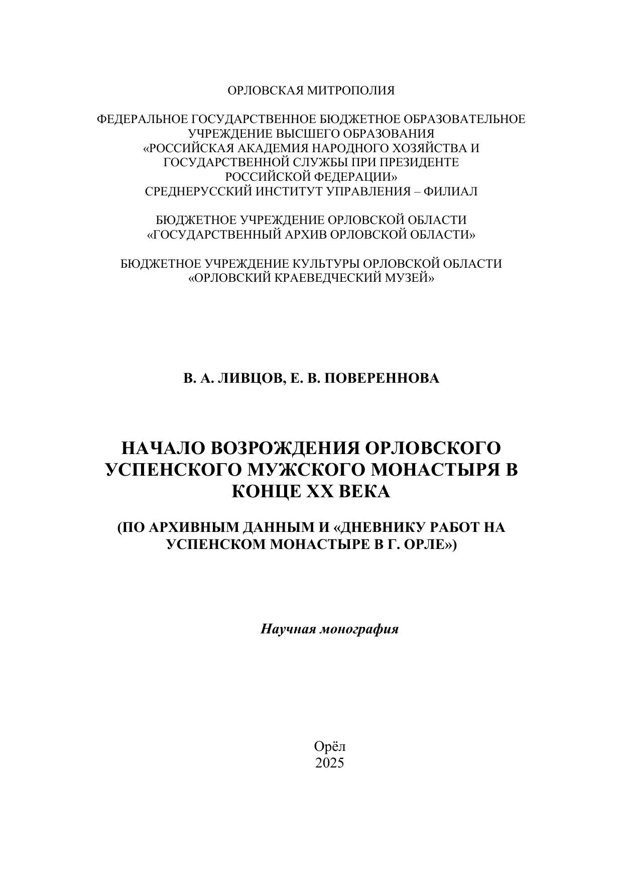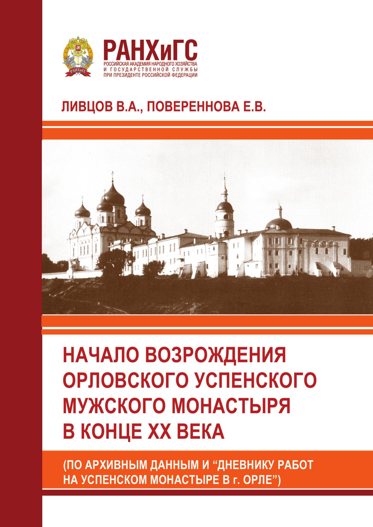 В монографии на основе архивных материалов и неизвестного ранее источника личного происхождения исследуется процесс возрождения Орловского Успенского мужского монастыря в конце 1980-х – середине 1990-х гг. В первой части работы излагается история Успенского монастыря (с 1820 г. – Архиерейского дома) с основания в последней четверти XVI в. до «перестройки». В Приложении публикуется «Дневник работ на Успенском монастыре в г. Орле» историка и краеведа В.А. Ливцова, исследование А. В. Лепилина о личностях настоятелей монастыря, а также архивные фотографии из ГАОО и Музея истории Санкт-Петербурга. Новый источник сопровождён необходимыми комментариями. Научная монография предназначена для тех, кто интересуется историей, и будет полезна студентам и аспирантам.