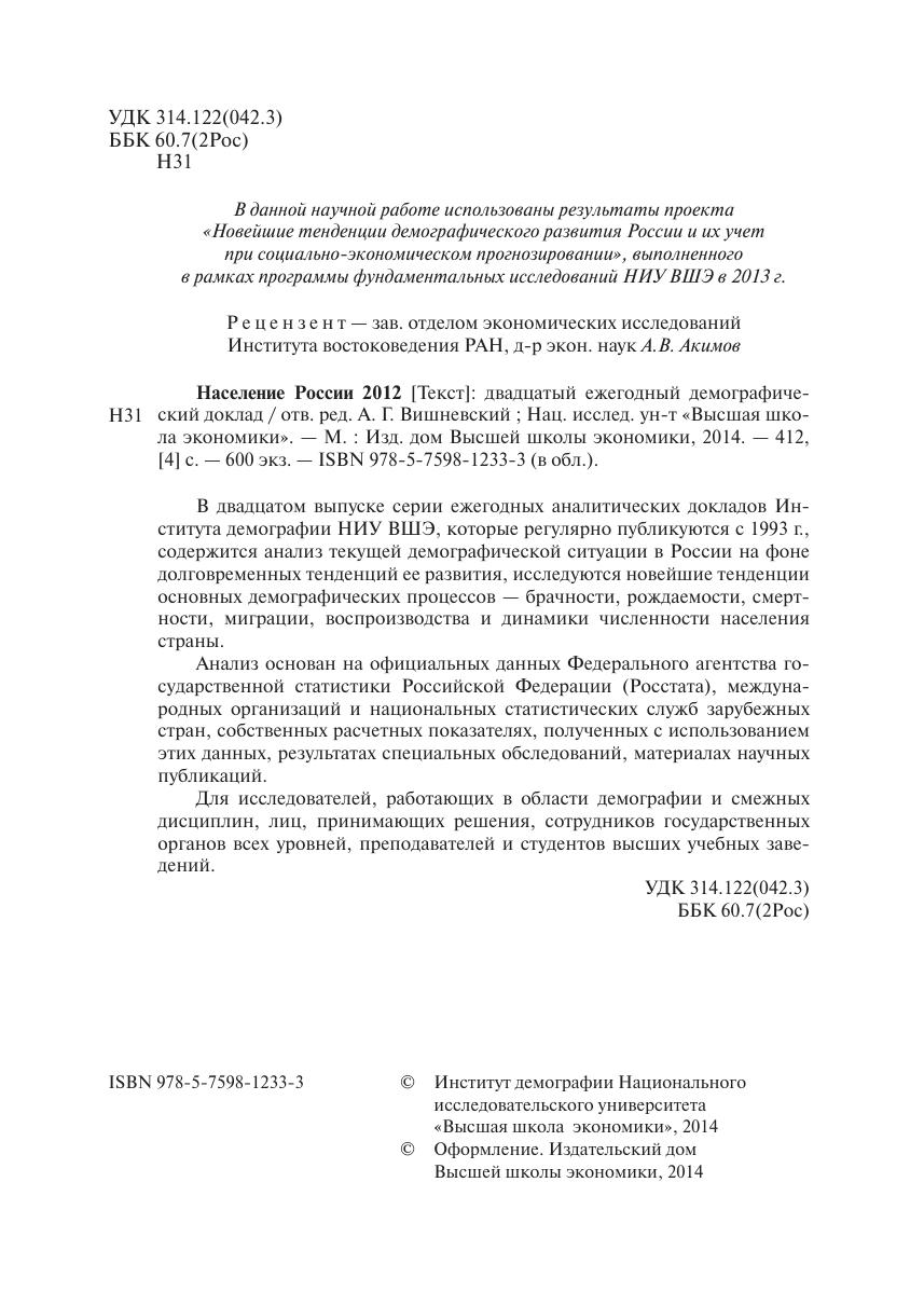 Население России 2012: двадцатый ежегодный демографический доклад