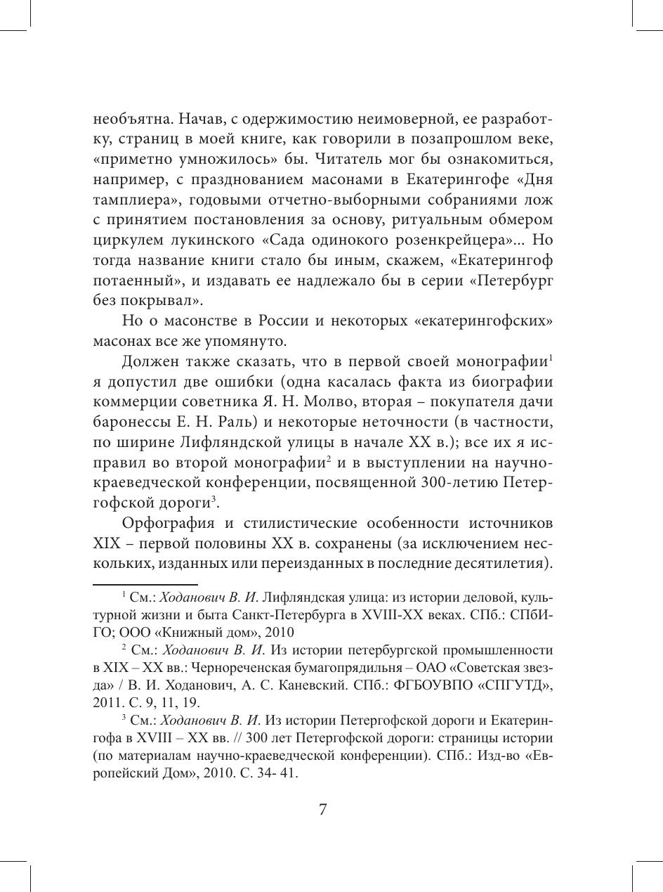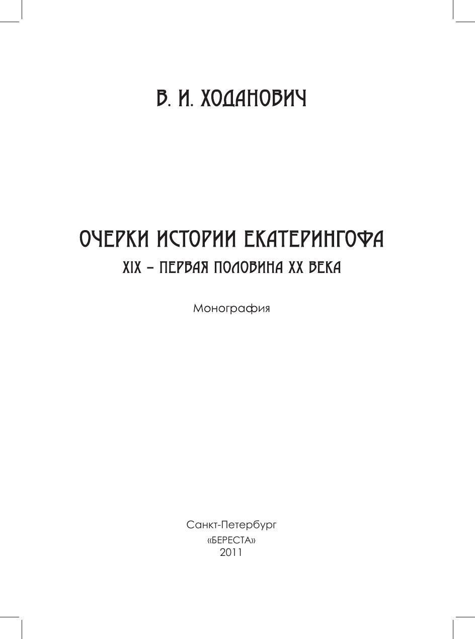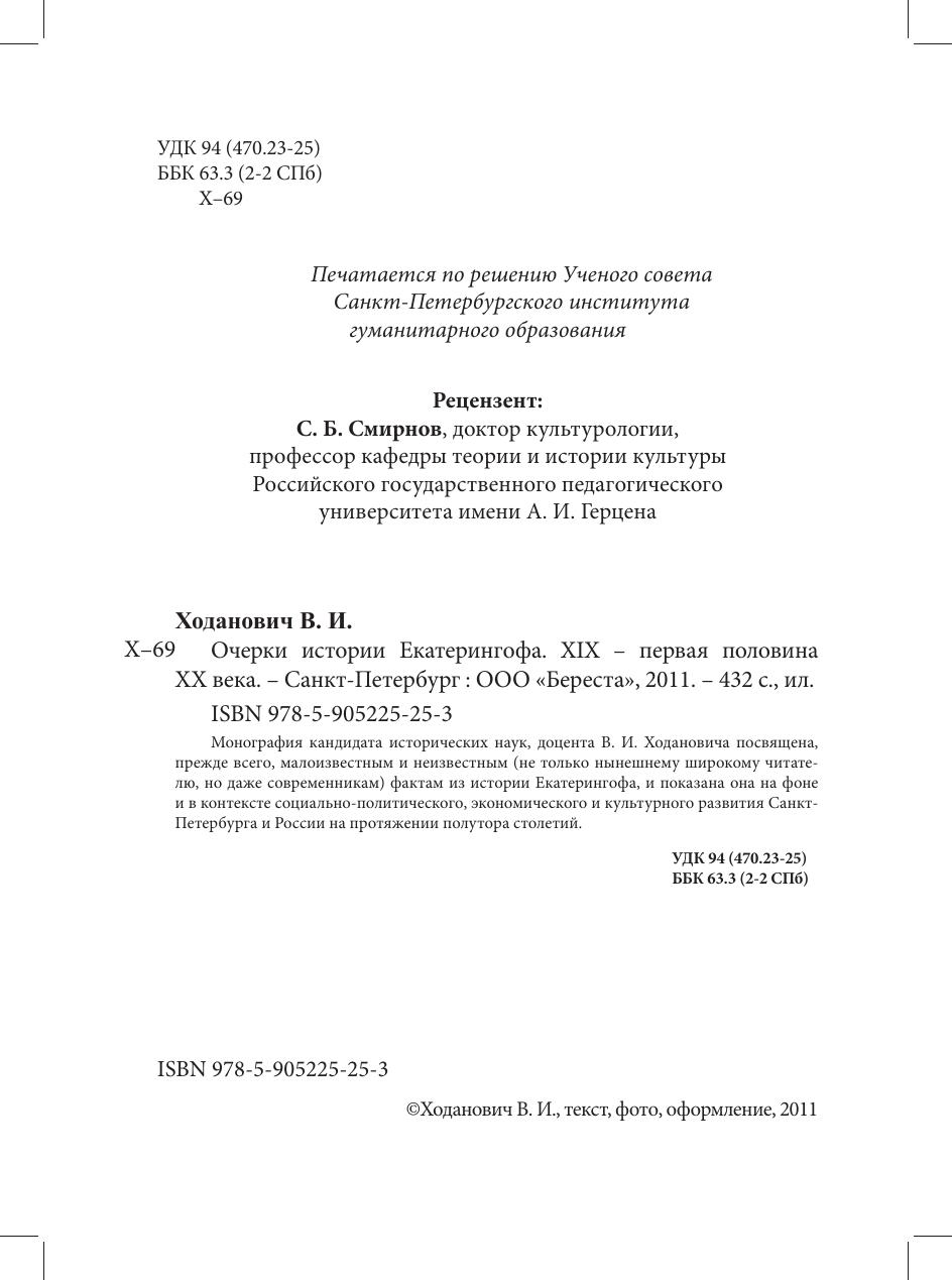 Монография кандидата исторических наук, доцента В. И. Ходановича посвящена, прежде всего, малоизвестным и неизвестным (не только ны нешнему широкому читателю, но даже современникам) фактам из истории Екатерингофа, и показана она на фоне и в контексте социально-политического, экономического и культурного развития Санкт-Петербурга и России на протяжении полутора столетий.
