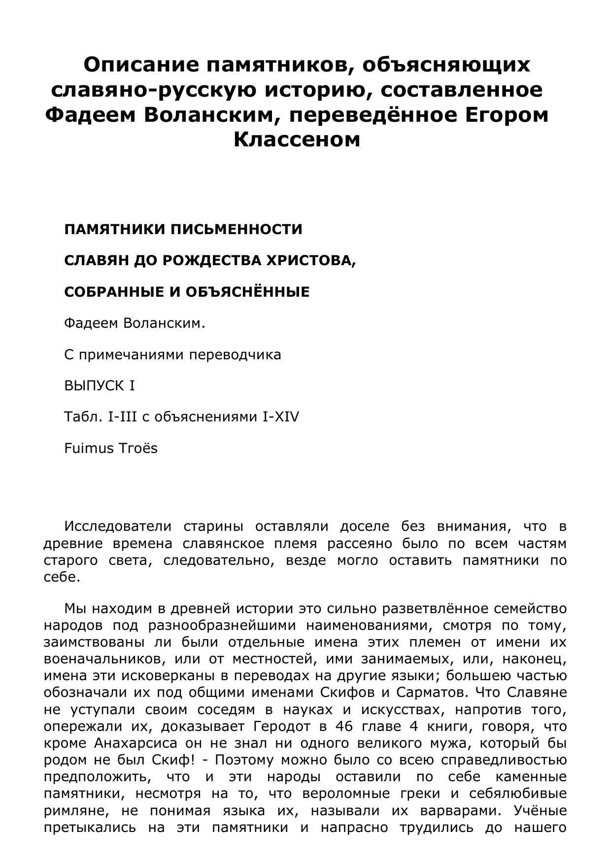 Описание памятников, объясняющих славяно-русскую историю, составленное Фадеем Воланским, переведённое Егором Классеном.