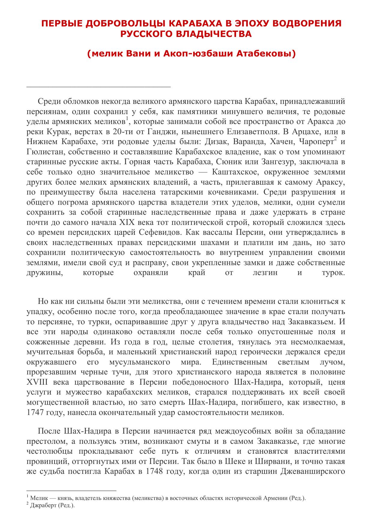 Первые добровольцы Карабаха в эпоху водворения русского владычества (мелик Вани и Акоп-юзбаши Атабековы)