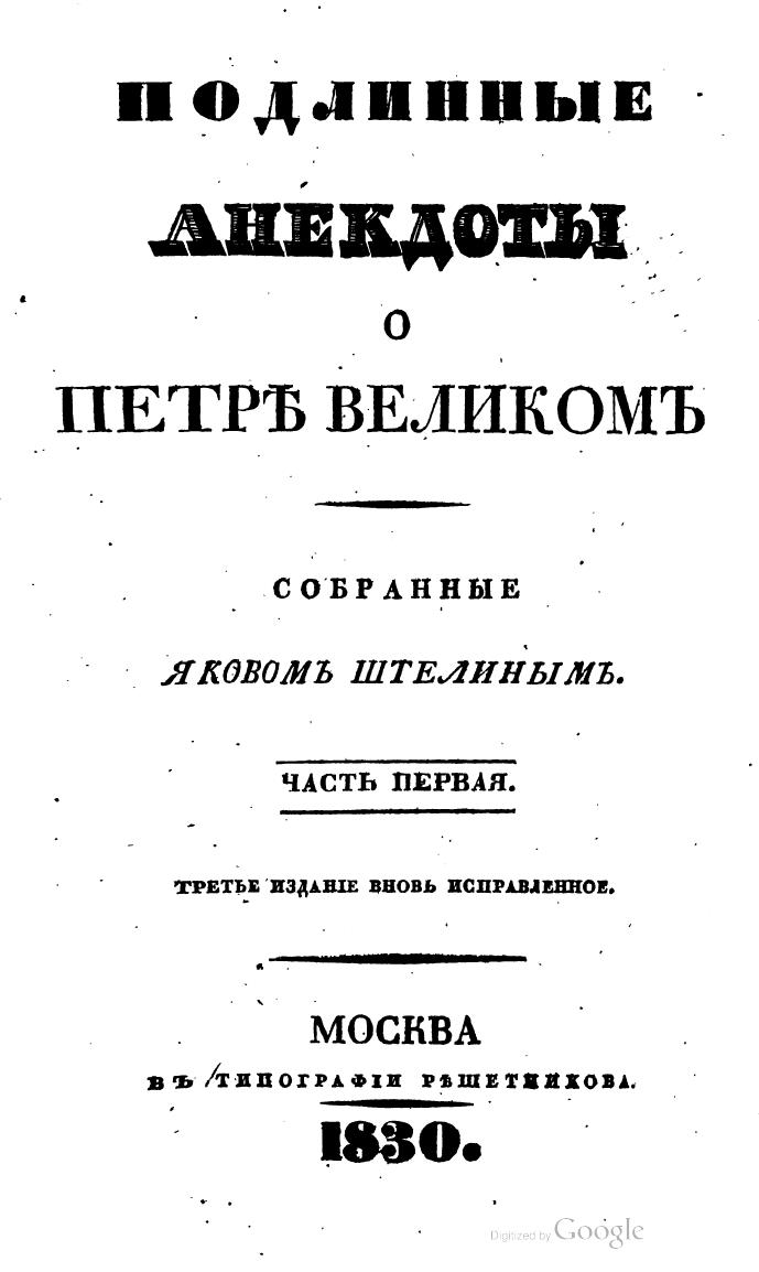 Подлинные анекдоты о Петре Великом, собранные Яковом Штелиным. Часть 1-2