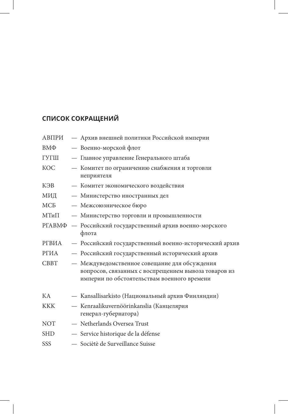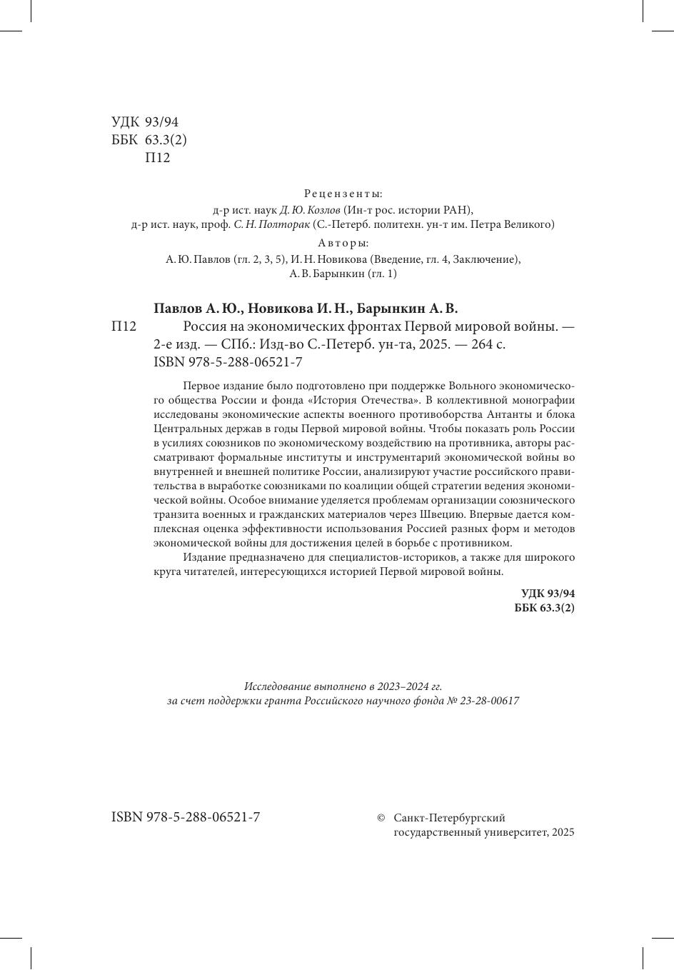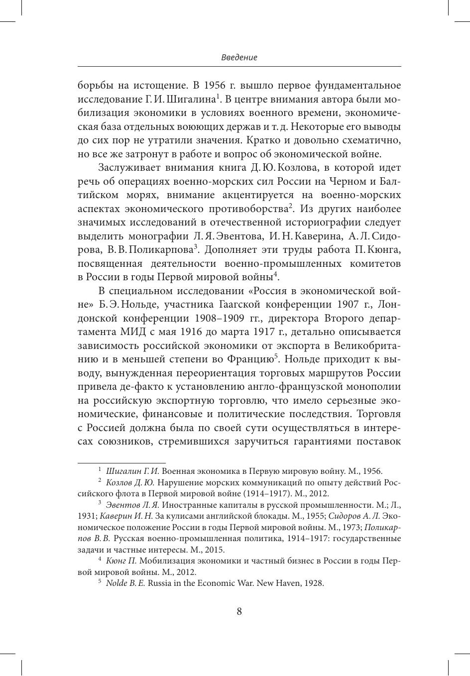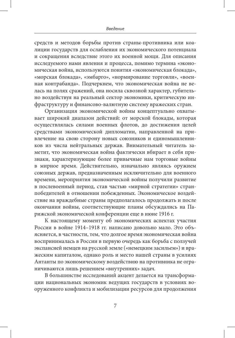 Первое издание было подготовлено при поддержке Вольного экономического общества России и фонда «История Отечества». В коллективной монографии исследованы экономические аспекты военного противоборства Антанты и блока Центральных держав в годы Первой мировой войны. Чтобы показать роль России в усилиях союзников по экономическому воздействию на противника, авторы рассматривают формальные институты и инструментарий экономической войны во внутренней и внешней политике России, анализируют участие российского правительства в выработке союзниками по коалиции общей стратегии ведения экономической войны. Особое внимание уделяется проблемам организации союзнического транзита военных и гражданских материалов через Швецию. Впервые дается комплексная оценка эффективности использования Россией разных форм и методов экономической войны для достижения целей в борьбе с противником. Издание предназначено для специалистов-историков, а также для широкого круга читателей, интересующихся историей Первой мировой войны.