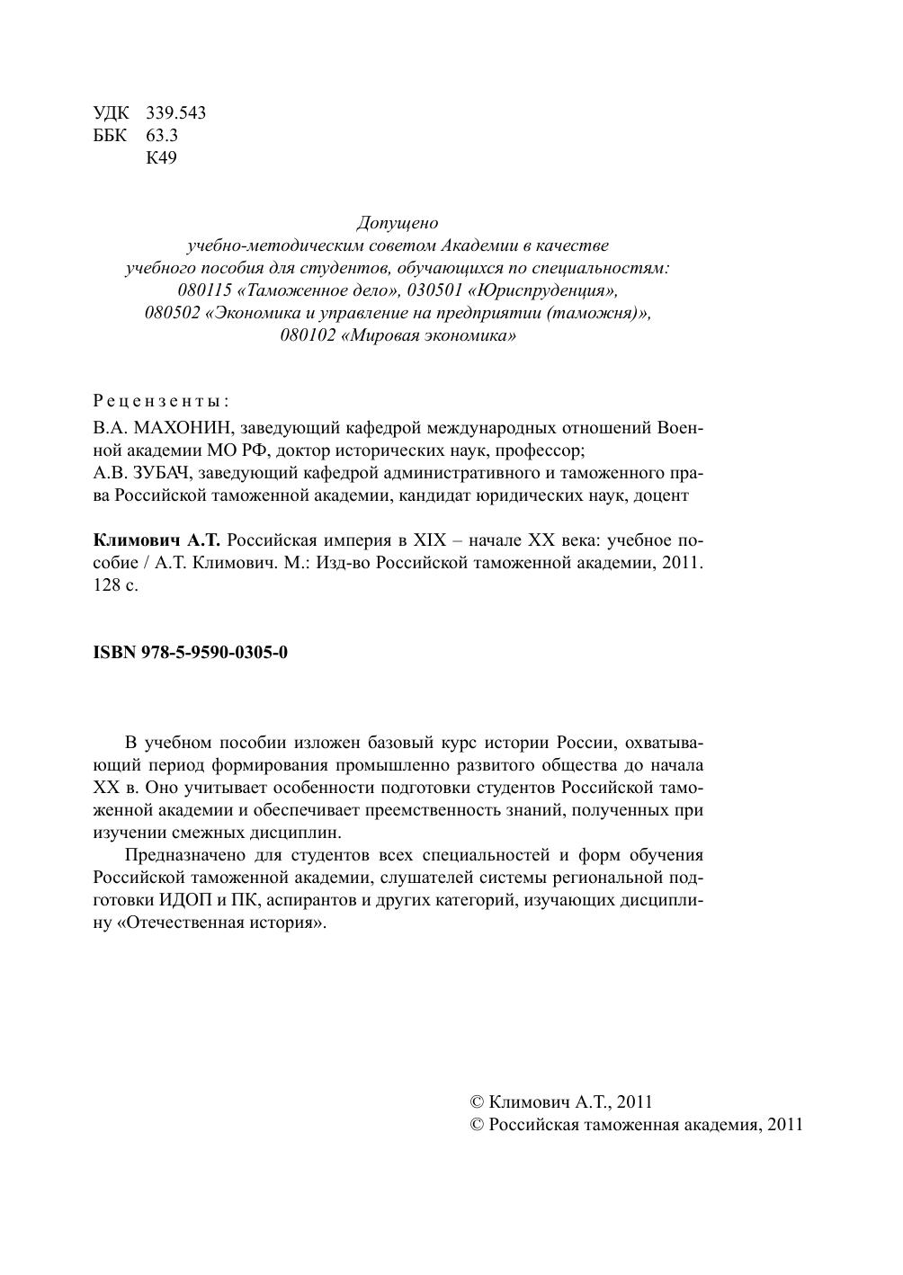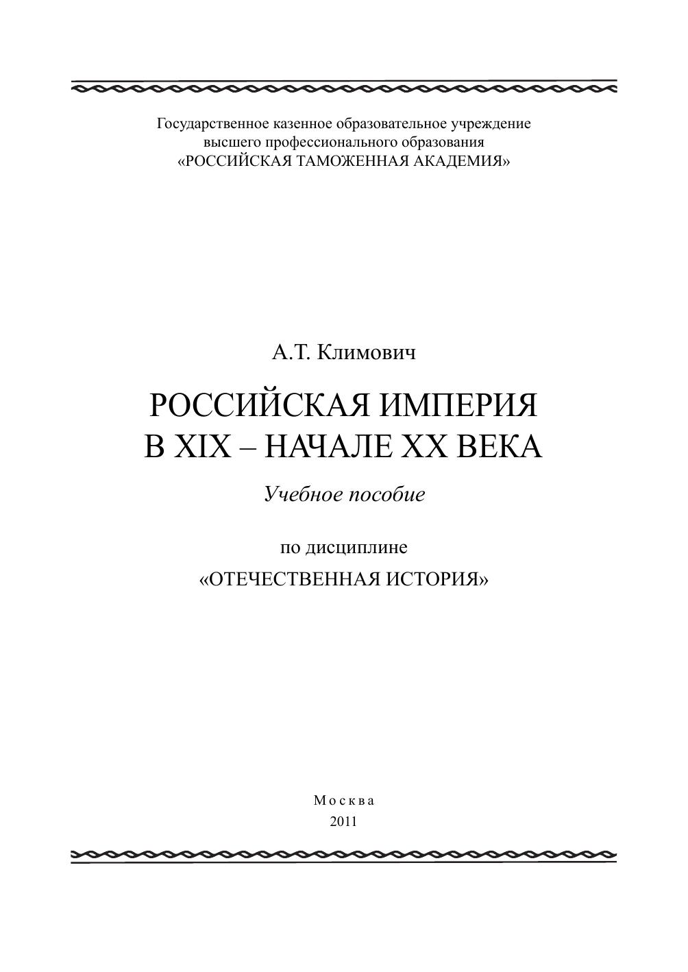 В учебном пособии изложен базовый курс истории России, охватывающий период формирования промышленно развитого общества до начала XX в. Оно учитывает особенности подготовки студентов Российской таможенной академии и обеспечивает преемственность знаний, полученных при изучении смежных дисциплин. предназначено для студентов всех специальностей и форм обучения Российской таможенной академии, слушателей системы региональной подготовки ИДОп и пК, аспирантов и других категорий, изучающих дисциплину «Отечественная история».