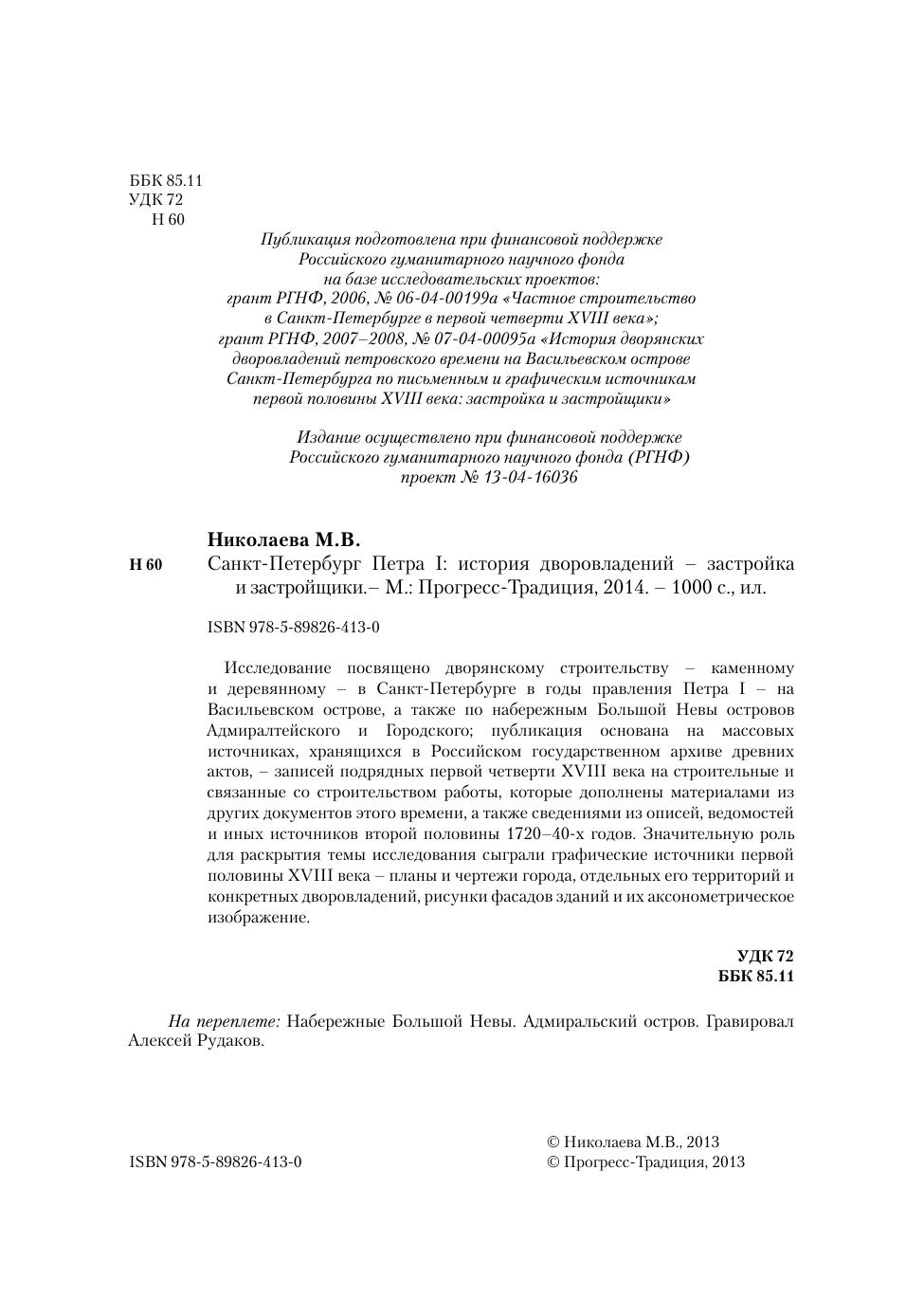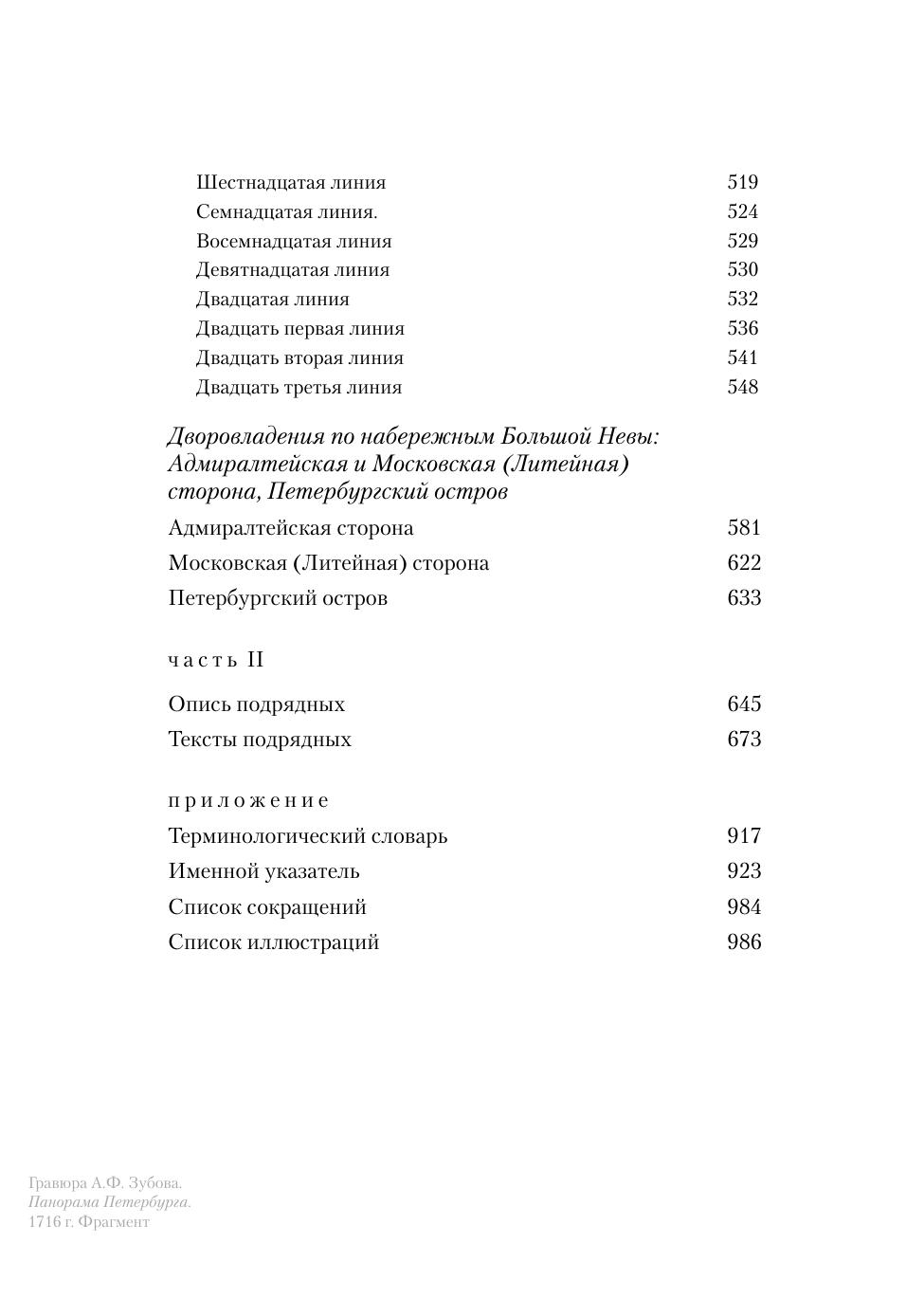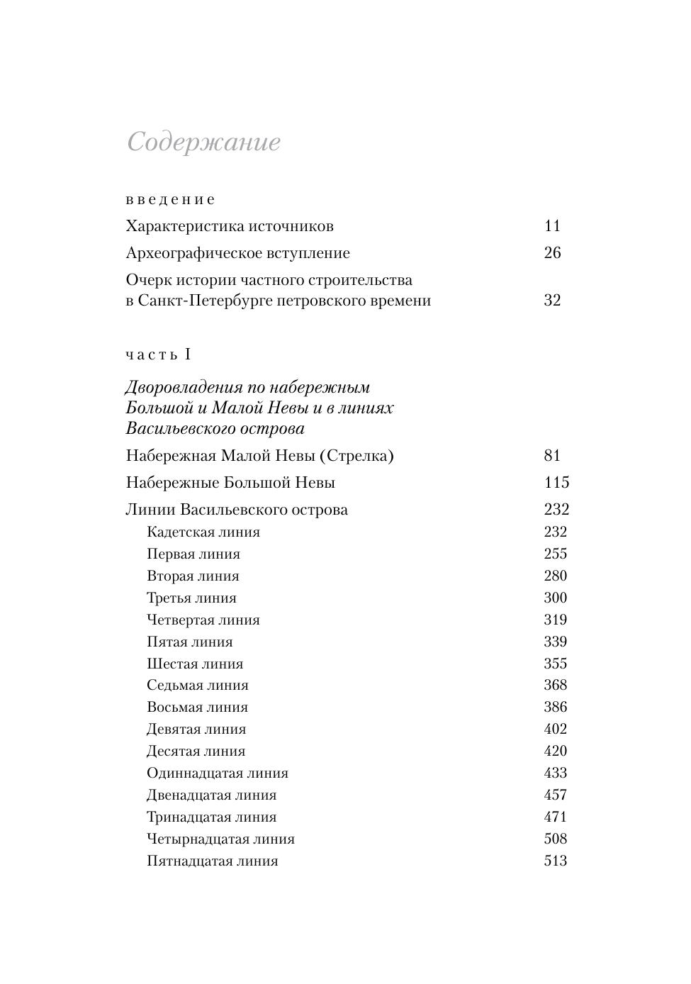 Исследование посвящено дворянскому строительству – каменному и деревянному – в Санкт-Петербурге в годы правления Петра I – на Васильевском острове, а также по набережным Большой Невы островов Адмиралтейского и Городского; публикация основана на массовых источниках, хранящихся в Российском государственном архиве древних актов, – записей подрядных первой четверти ХVIII века на строительные и связанные со строительством работы, которые дополнены материалами из других документов этого времени, а также сведениями из описей, ведомостей и иных источников второй половины 1720–40-х годов. Значительную роль для раскрытия темы исследования сыграли графические источники первой половины XVIII века – планы и чертежи города, отдельных его территорий и конкретных дворовладений, рисунки фасадов зданий и их аксонометрическое изображение.