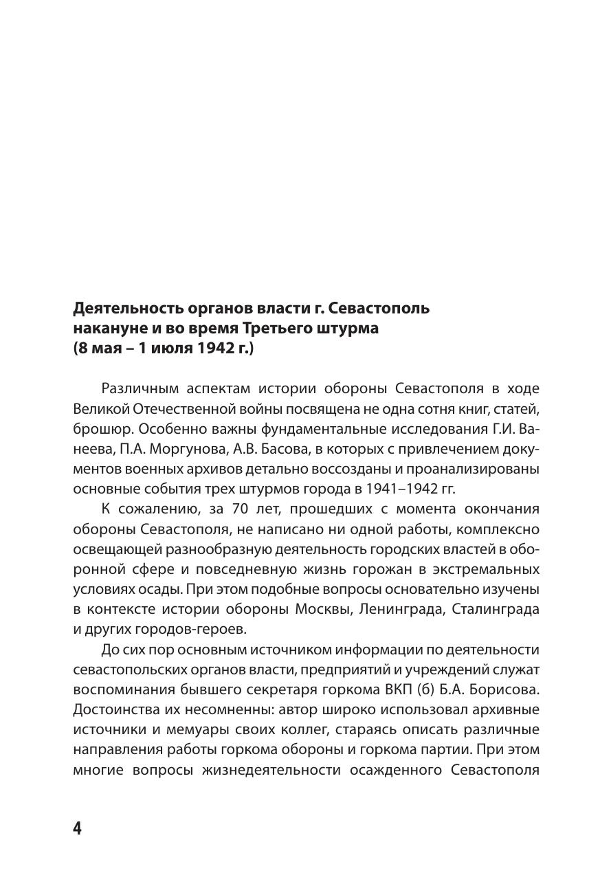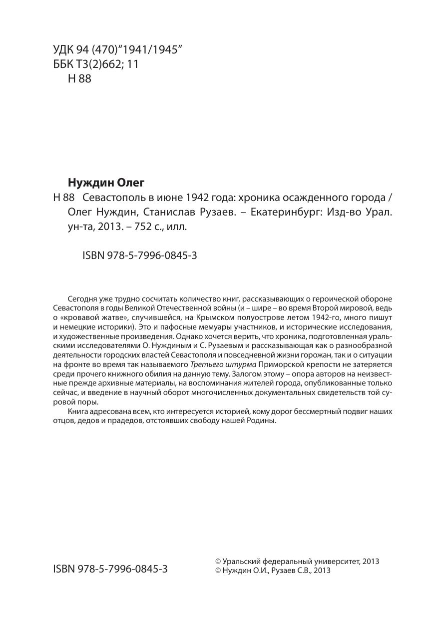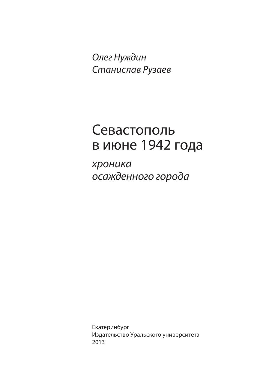 Сегодня уже трудно сосчитать количество книг, рассказывающих о героической обороне Севастополя в годы Великой Отечественной войны (и – шире – во время Второй мировой, ведь о «кровавой жатве», случившейся, на Крымском полуострове летом 1942-го, много пишут и немецкие историки). Это и пафосные мемуары участников, и исторические исследования, и художественные произведения. Однако хочется верить, что хроника, подготовленная уральскими исследователями О. Нуждиным и С. Рузаевым и рассказывающая как о разнообразной деятельности городских властей Севастополя и повседневной жизни горожан, так и о ситуации на фронте во время так называемого Третьего штурма Приморской крепости не затеряется среди прочего книжного обилия на данную тему. Залогом этому – опора авторов на неизвестные прежде архивные материалы, на воспоминания жителей города, опубликованные только сейчас, и введение в научный оборот многочисленных документальных свидетельств той суровой поры. Книга адресована всем, кто интересуется историей, кому дорог бессмертный подвиг наших отцов, дедов и прадедов, отстоявших свободу нашей Родины.
