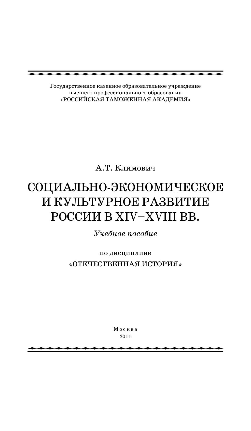 Социально-экономическое и культурное развитие России в XIV–XVIII вв.: учебное пособие