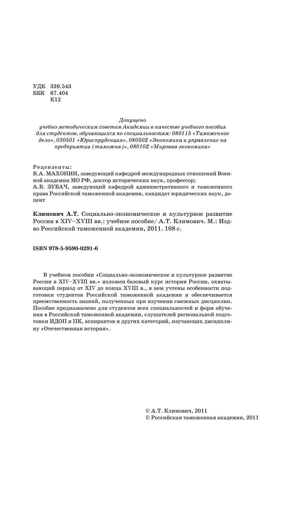 В учебном пособии «Социально-экономическое и культурное развитие России в XIV–XVIII вв.» изложен базовый курс истории России, охватывающий период от XIV до конца XVIII в., в нем учтены особенности подготовки студентов Российской таможенной академии и обеспечивается преемственность знаний, полученных при изучении смежных дисциплин. Пособие предназначено для студентов всех специальностей и форм обучения в Российской таможенной академии, слушателей региональной подготовки ИДОП и ПК, аспирантов и других категорий, изучающих дисциплину «Отечественная история»
