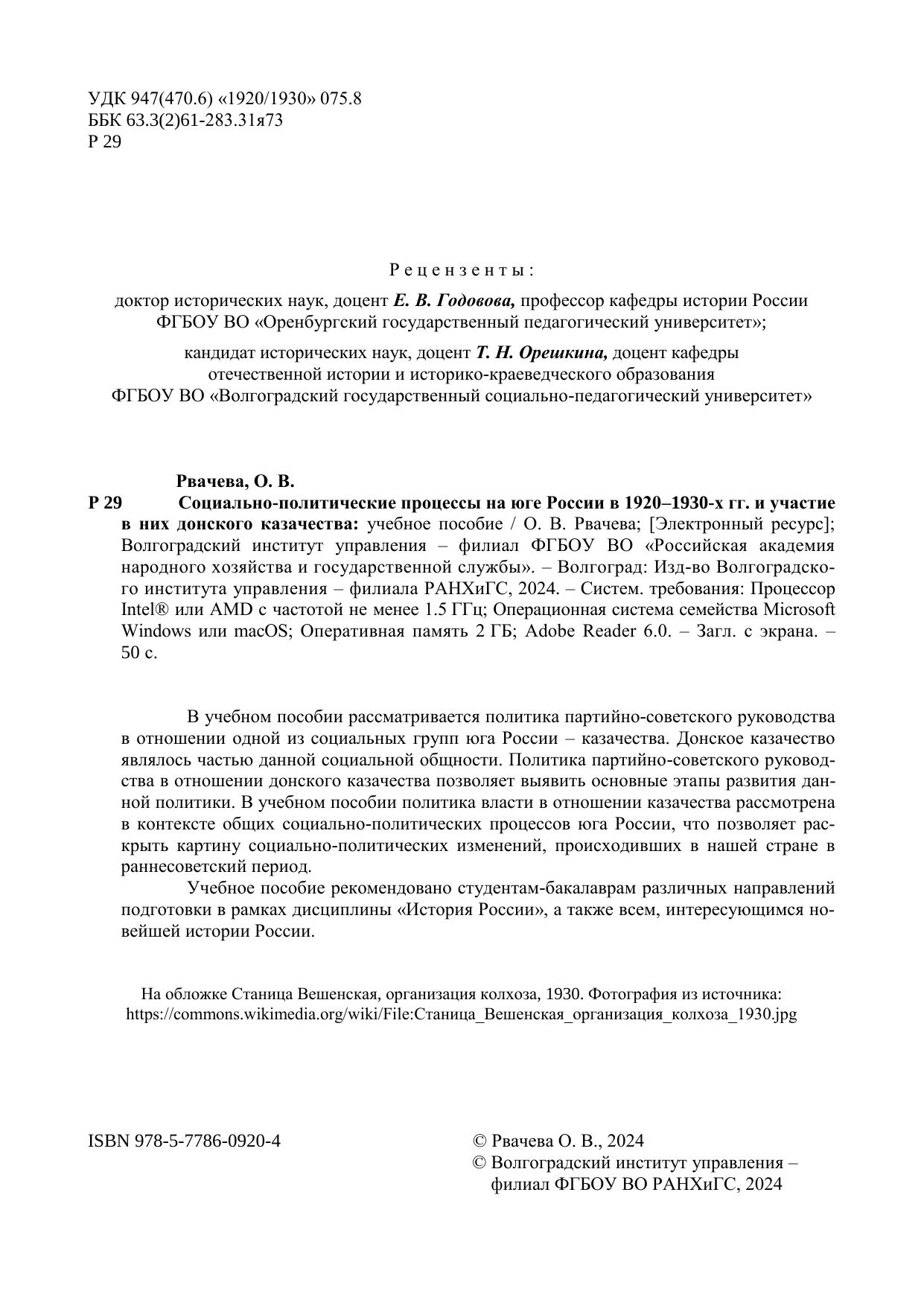 В учебном пособии рассматривается политика партийно-советского руководства в отношении одной из социальных групп юга России – казачества. Донское казачество являлось частью данной социальной общности. Политика партийно-советского руководства в отношении донского казачества позволяет выявить основные этапы развития данной политики. В учебном пособии политика власти в отношении казачества рассмотрена в контексте общих социально-политических процессов юга России, что позволяет раскрыть картину социально-политических изменений, происходивших в нашей стране в раннесоветский период. Учебное пособие рекомендовано студентам-бакалаврам различных направлений подготовки в рамках дисциплины «История России», а также всем, интересующимся новейшей истории России.
