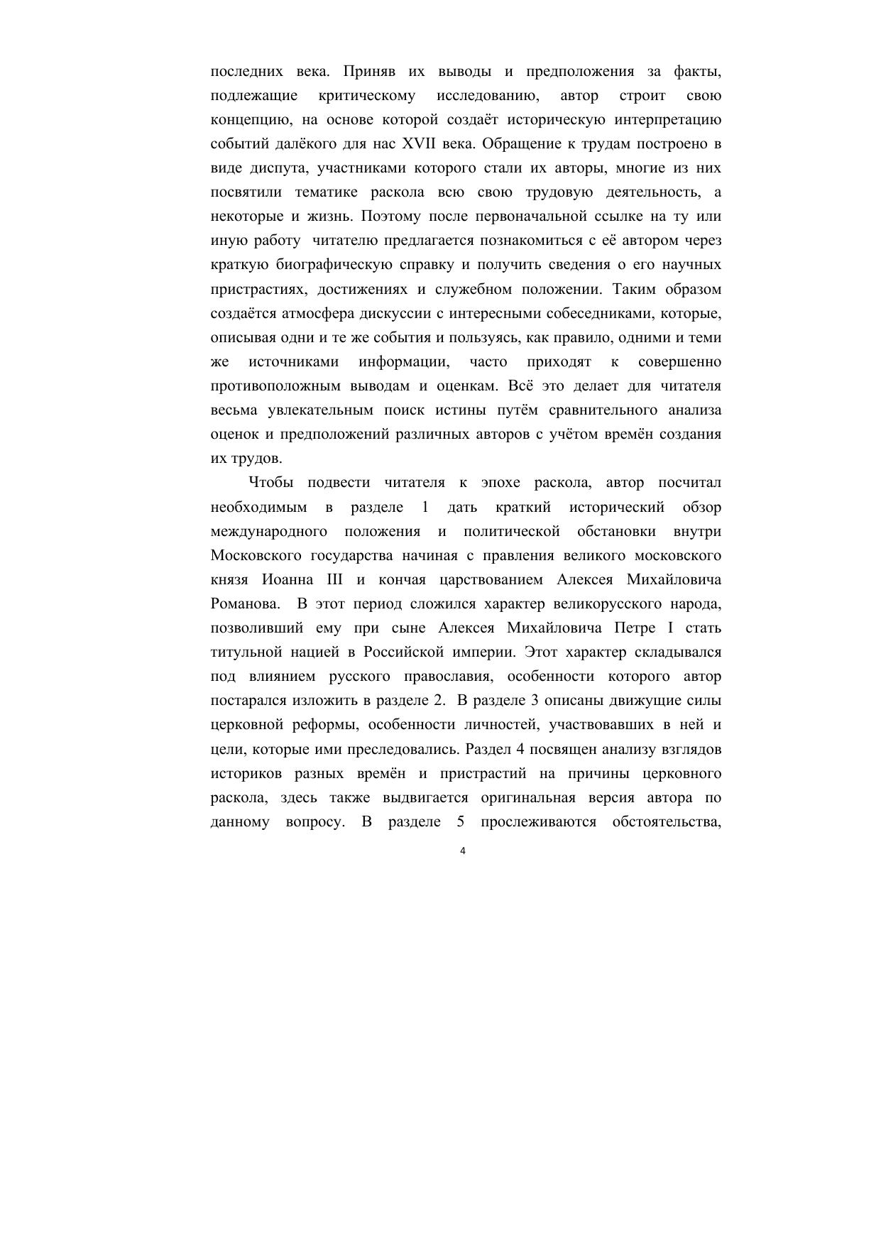 В книге проводится поиск причин трагических событий, произошедших в Московском государстве середины XVII века и приведших к расколу Русской Православной Церкви и русского народа в целом. В этом поиске автор пользовался трудами историков Русской Православной Церкви, древлеправославной (старообрядческой) церкви и светских историков религий за три последних века. Авторы трудов представлены краткими биографическими справками с описанием их научных достижений и пристрастий. Обращение к трудам построено в дискуссионной форме, что создаёт атмосферу общения с интересными собеседниками, которые, описывая одни и те же события, часто приходят к совершенно противоположным выводам и оценкам. Читателю предлагается весьма увлекательный поиск истины путём сравнительного анализа различных версий с учётом научных пристрастий авторов и времён создания их трудов.