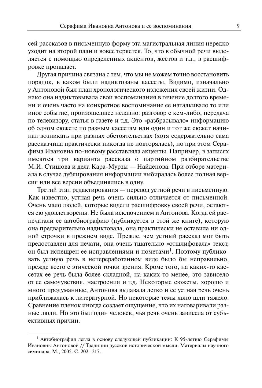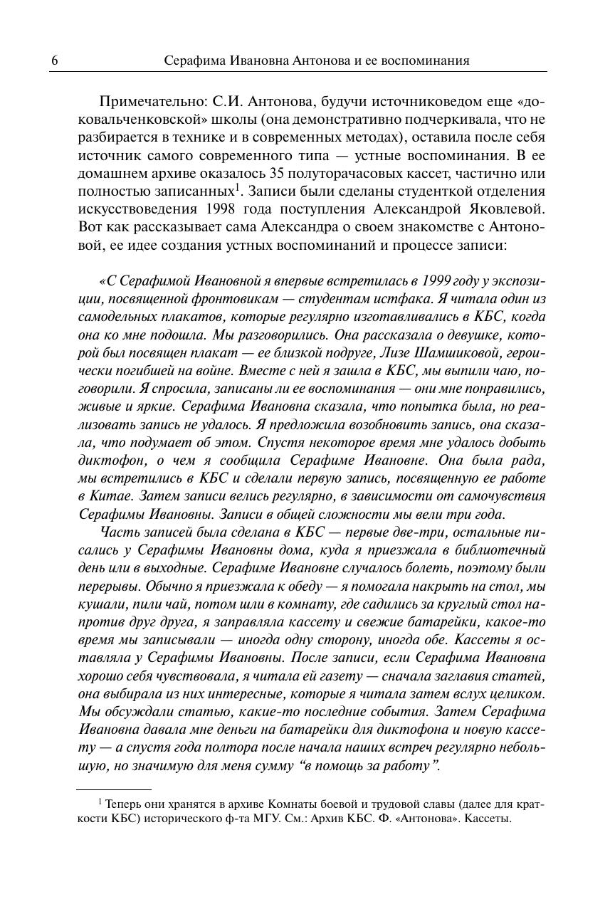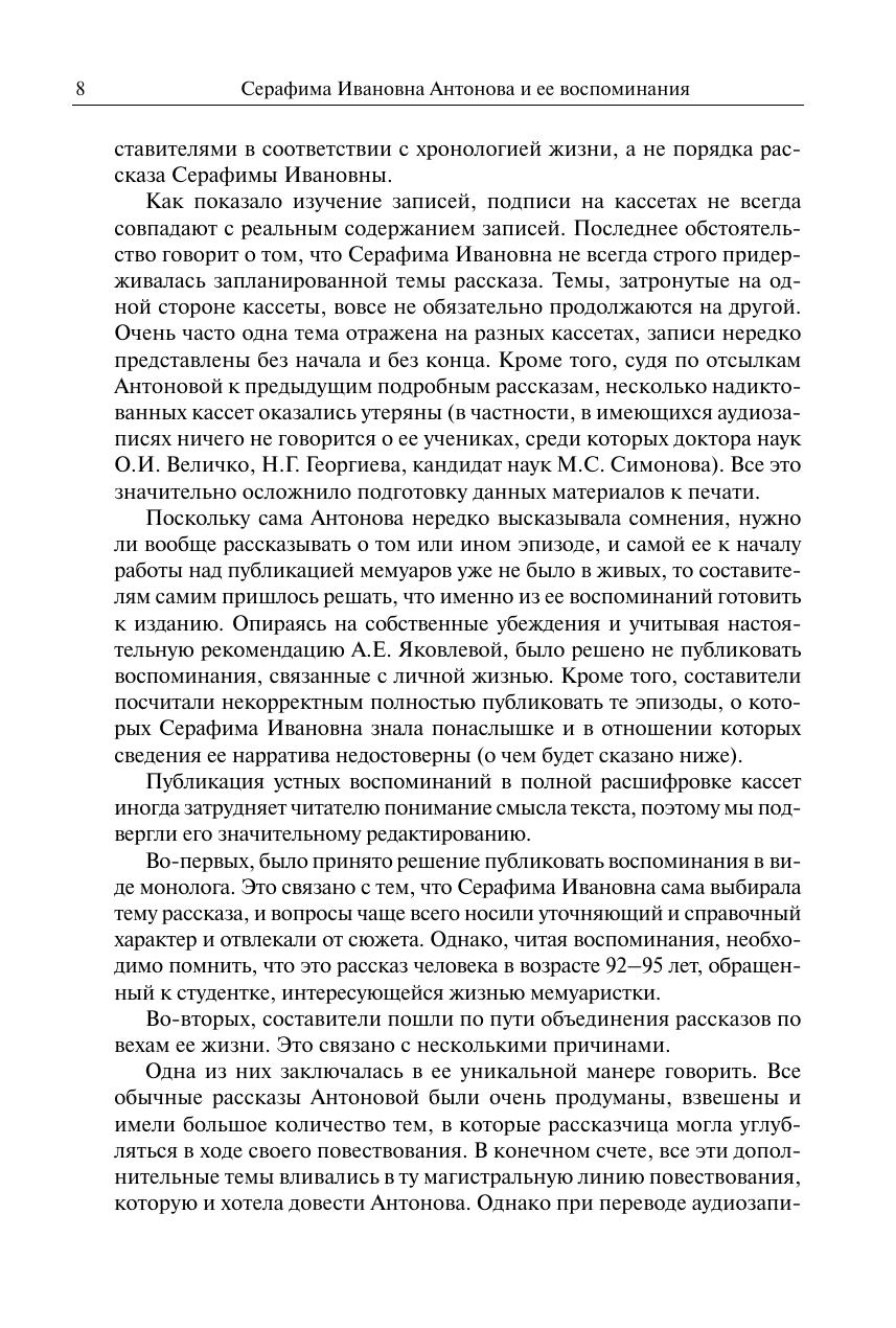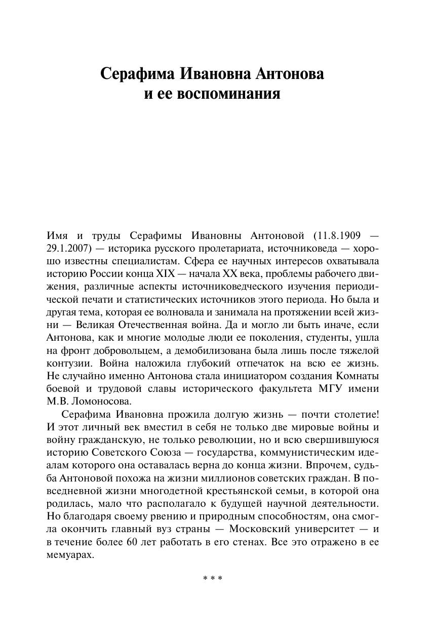 Серафима Ивановна Антонова (11.8.1909 – 29.1.2007) — историк русского пролетариата, источниковед, много лет проработавшая на историческом факультете МГУ имени М.В. Ломоносова, ветеран Великой Отечественной войны, создатель Комнаты боевой и трудовой славы исторического факультета. Прожив долгую жизнь, являясь участником ключевых событий отечественной истории XX в., она оставила подробные воспоминания, в которых отразились взгляды и судьбы целого поколения советских людей, сформировавшиеся вместе со становлением советского строя, со всеми его надеждами, крупными свершениями и глубокими противоречиями. Особое место в книге уделено поисковой работе С.И. Антоновой, связанной с увековечением памяти друзей и коллег — участников Великой Отечественной войны. Книга издана в преддверии 80-летия исторического факультета МГУ имени М.В. Ломоносова.