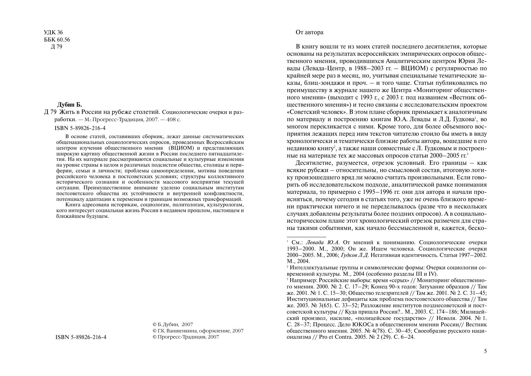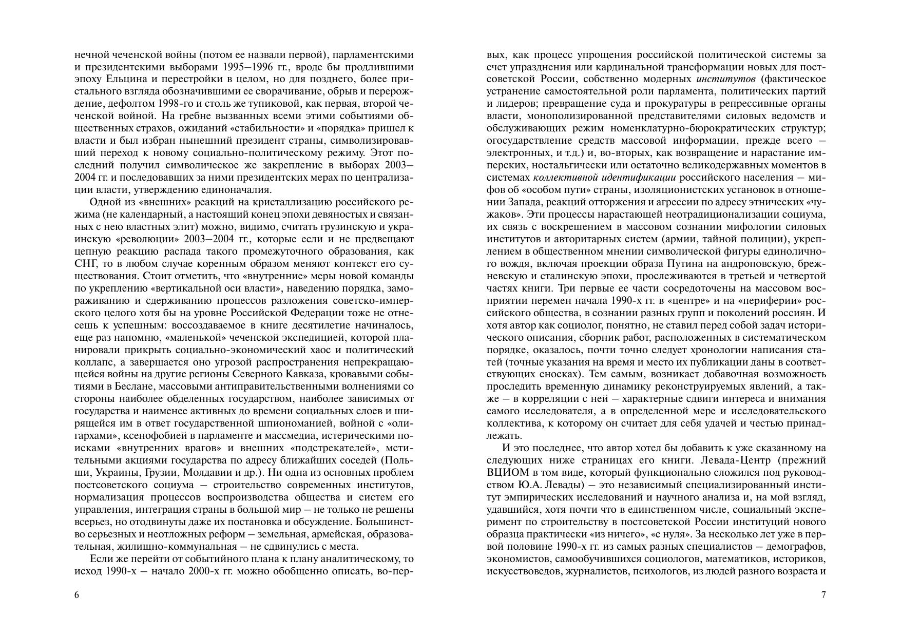 В основе статей, составивших сборник, лежат данные систематических общенациональных социологических опросов, проведенных Всероссийским центром изучения общественного мнения (ВЦИОМ) и представляющих широкую картину общественной жизни в России последнего пятнадцатилетия. На их материале рассматриваются социальные и культурные изменения на уровне страны в целом и различных подсистем общества, столицы и периферии, семьи и личности; проблемы самоопределения, мотивы поведения российского человека в постсоветских условиях; структуры коллективного исторического сознания и особенности массового восприятия текущей ситуации. Преимущественное внимание уделено социальным институтам постсоветского общества их устойчивости и внутренней конфликтности, потенциалу адаптации к переменам и границам возможных трансформаций.