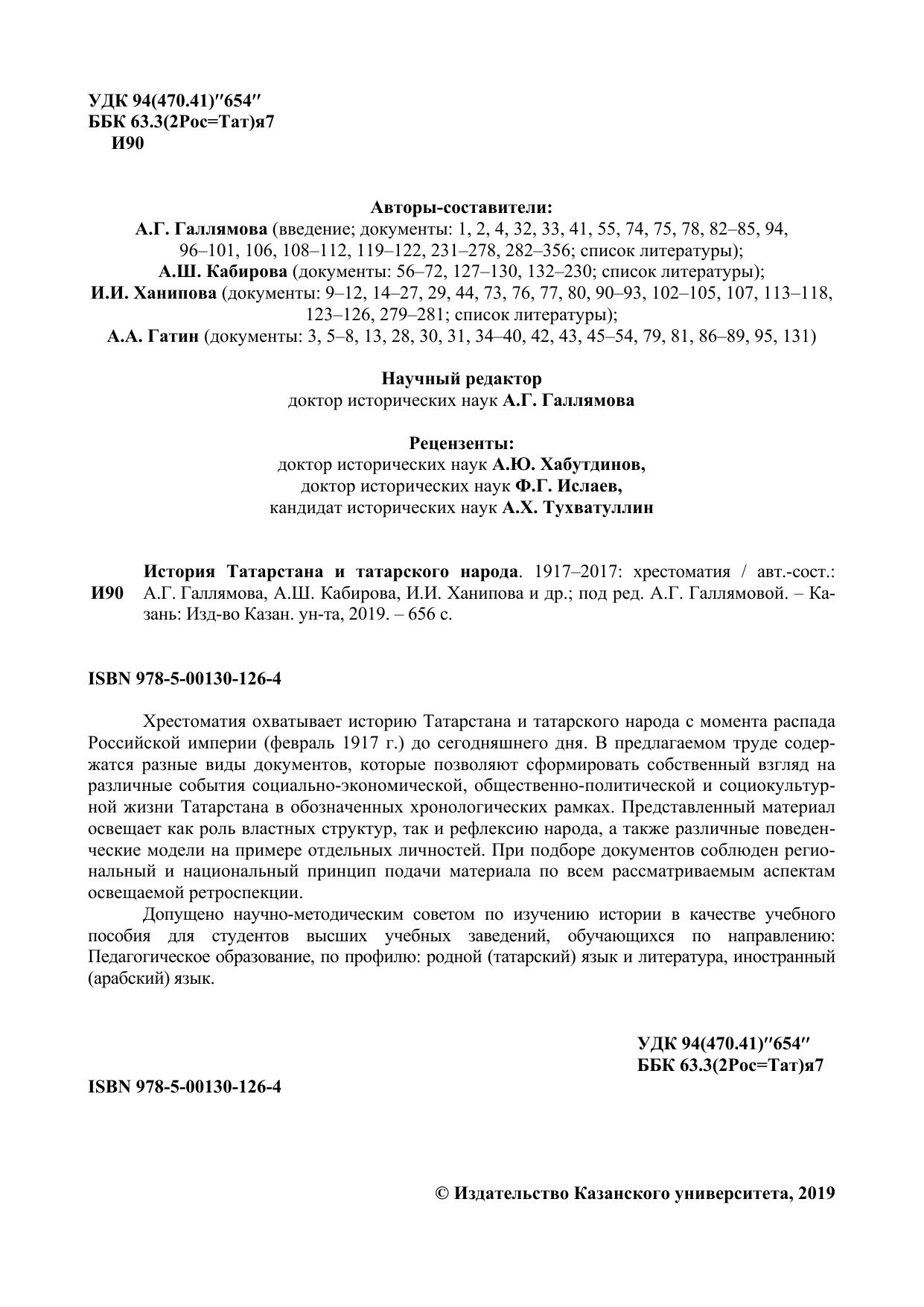 Хрестоматия охватывает историю Татарстана и татарского народа с момента распада Российской империи (февраль 1917 г.) до сегодняшнего дня. В предлагаемом труде содержатся разные виды документов, которые позволяют сформировать собственный взгляд на различные события социально-экономической, общественно-политической и социокультурной жизни Татарстана в обозначенных хронологических рамках. Представленный материал освещает как роль властных структур, так и рефлексию народа, а также различные поведенческие модели на примере отдельных личностей. При подборе документов соблюден региональный и национальный принцип подачи материала по всем рассматриваемым аспектам освещаемой ретроспекции. Допущено научно-методическим советом по изучению истории в качестве учебного пособия для студентов высших учебных заведений, обучающихся по направлению: Педагогическое образование, по профилю: родной (татарский) язык и литература, иностранный (арабский) язык.