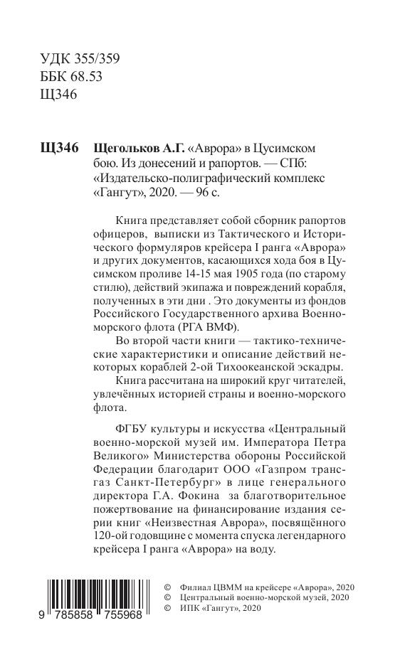 Книга представляет собой сборник рапортов офицеров, выписки из Тактического и Исторического формуляров крейсера I ранга «Аврора» и других документов, касающихся хода боя в Цусимском проливе 14-15 мая 1905 года (по старому стилю), действий экипажа и повреждений корабля, полученных в эти дни . Это документы из фондов Российского Государственного архива Военно-морского флота (РГА ВМФ).