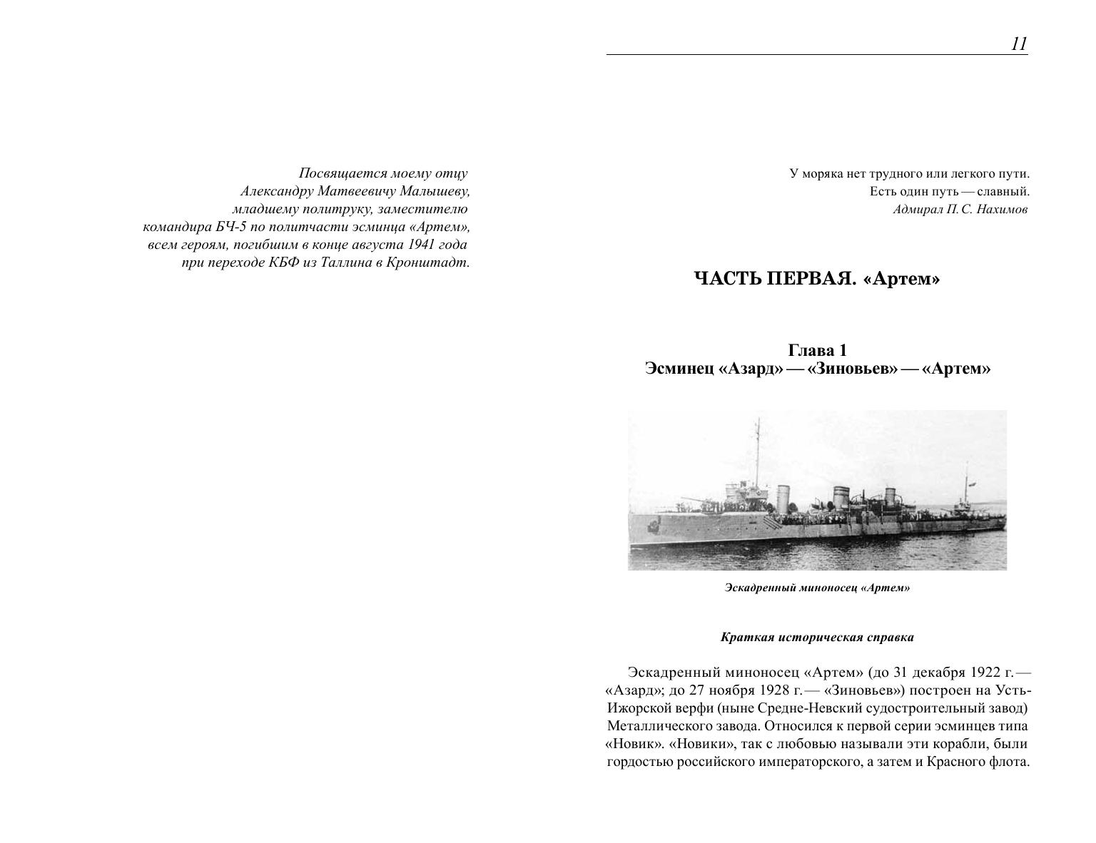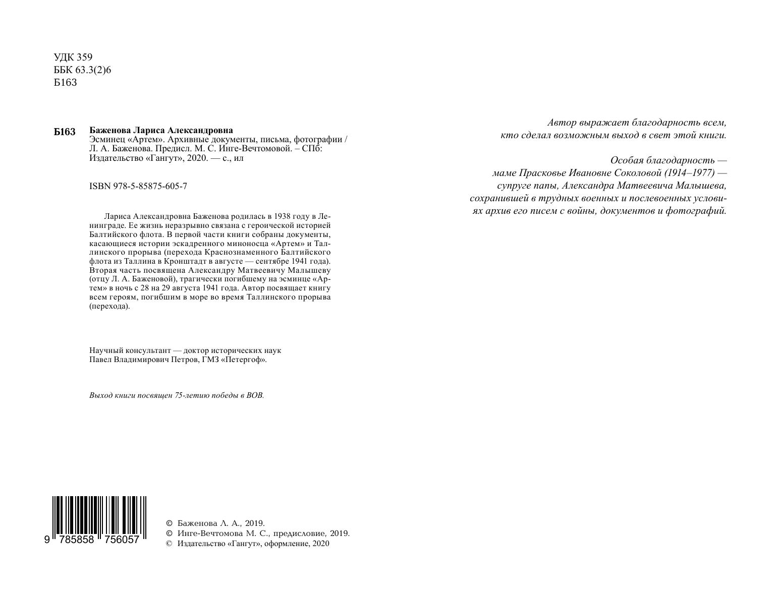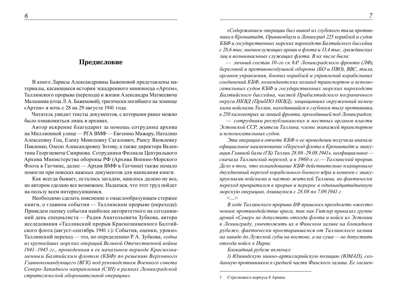 Лариса Александровна Баженова родилась в 1938 году в Ленинграде. Ее жизнь неразрывно связана с героической историей Балтийского флота. В первой части книги собраны документы, касающиеся истории эскадренного миноносца «Артем» и Таллинского прорыва (перехода Краснознаменного Балтийского флота из Таллина в Кронштадт в августе — сентябре 1941 года). Вторая часть посвящена Александру Матвеевичу Малышеву (отцу Л. А. Баженовой), трагически погибшему на эсминце «Артем» в ночь с 28 на 29 августа 1941 года. Автор посвящает книгу всем героям, погибшим в море во время Таллинского прорыва (перехода).