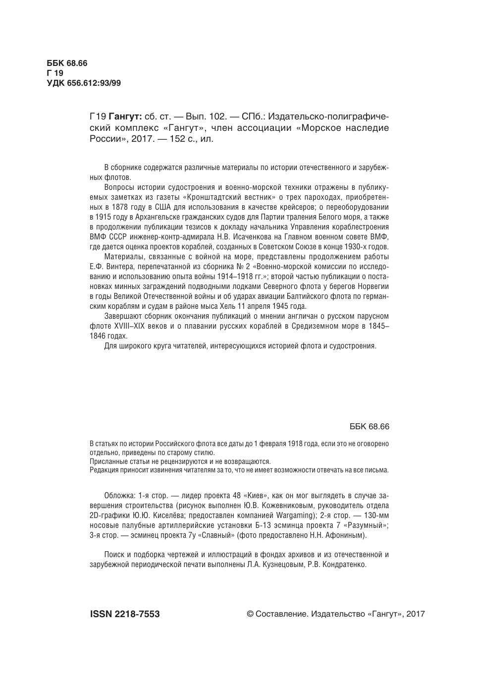 В сборнике содержатся различные материалы по истории отечественного и зарубежных флотов. Вопросы истории судостроения и военно-морской техники отражены в публикуемых заметках из газеты «Кронштадтский вестник» о трех пароходах, приобретенных в 1878 году в США для использования в качестве крейсеров; о переоборудовании в 1915 году в Архангельске гражданских судов для Партии траления Белого моря, а также в продолжении публикации тезисов к докладу начальника Управления кораблестроения ВМФ СССР инженер-контр-адмирала Н.В. Исаченкова на Главном военном совете ВМФ, где дается оценка проектов кораблей, созданных в Советском Союзе в конце 1930-х годов. Материалы, связанные с войной на море, представлены продолжением работы Е.Ф. Винтера, перепечатанной из сборника № 2 «Военно-морской комиссии по исследованию и использованию опыта войны 1914–1918 гг.»; второй частью публикации о постановках минных заграждений подводными лодками Северного флота у берегов Норвегии в годы Великой Отечественной войны и об ударах авиации Балтийского флота по германским кораблям и судам в районе мыса Хель 11 апреля 1945 года. Завершают сборник окончания публикаций о мнении англичан о русском парусном флоте XVIII–XIX веков и о плавании русских кораблей в Средиземном море в 1845–1846 годах. Для широкого круга читателей, интересующихся историей флота и судостроения.