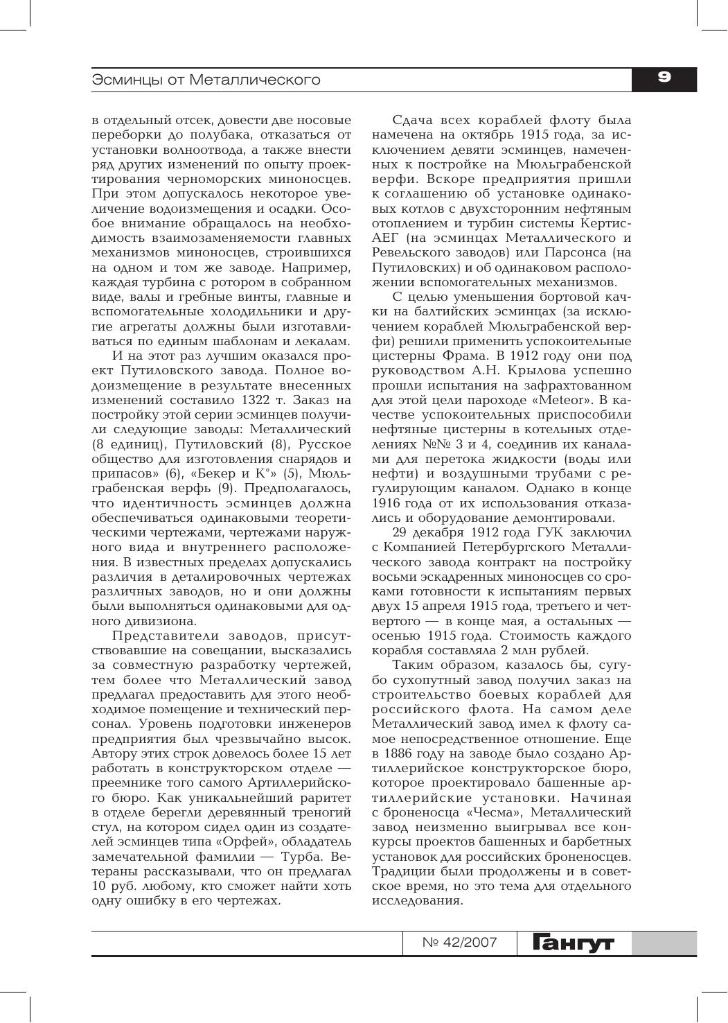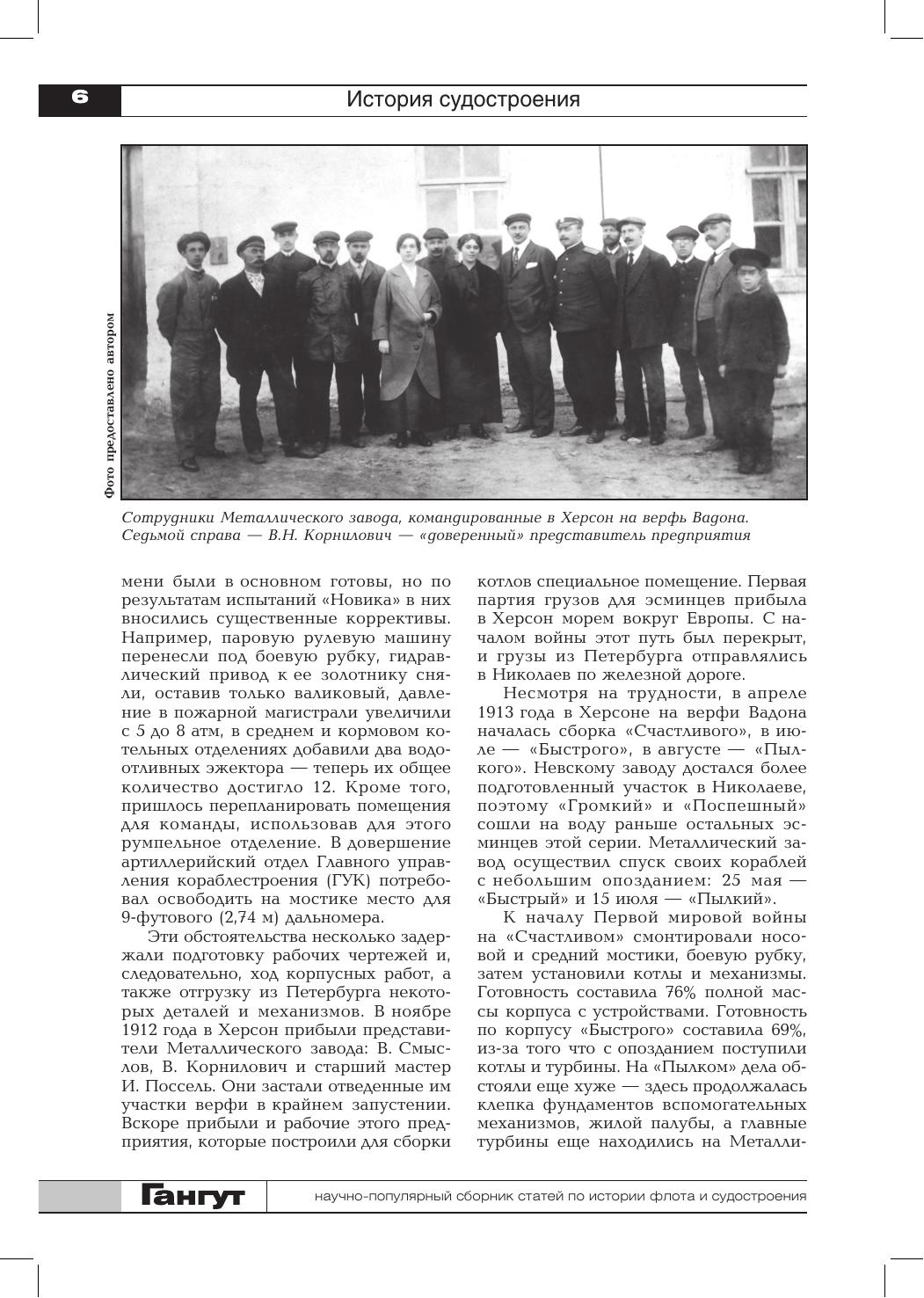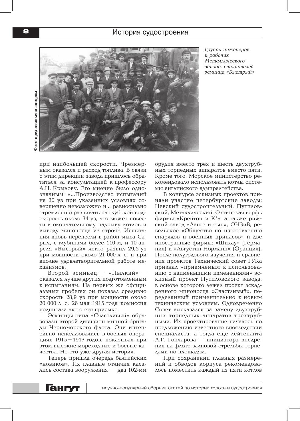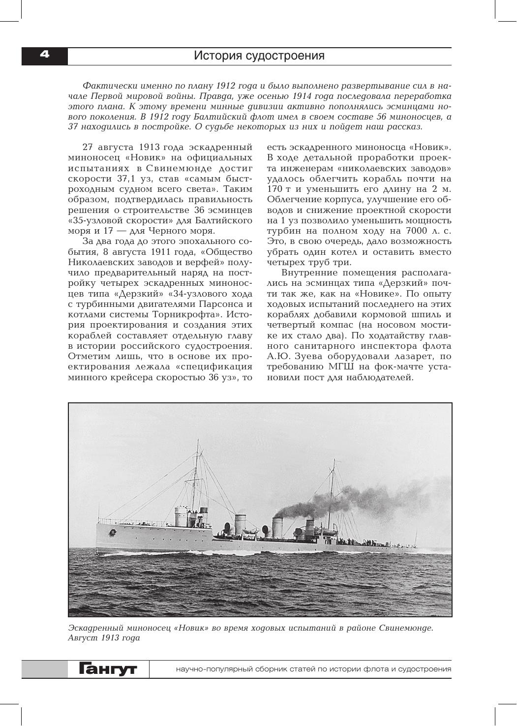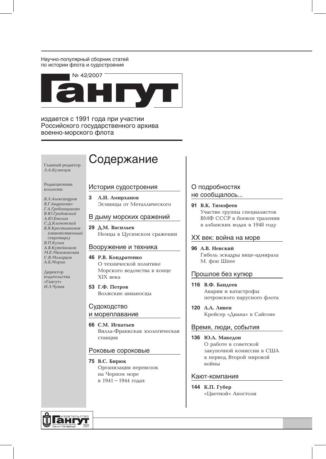Сборник открывает статья об истории постройки Санкт-Петербургским Металлическим заводом в 1913–1916 годах десяти турбинных эскадренных миноносцев: двух — на верфи Вадона в Херсоне и восьми — на специально созданной предприятием Усть Ижорской верфи. Русско-японская война представлена публикацией о приобретении в Германии буксира «Roland», переименованного в «Русь», его участии в походе со 2-й Тихоокеанской эскадрой с частью немецкого экипажа и гибели в Цусимском бою и заключительной частью книги командира крейсера «Диана» А.А. Ливена о первых месяцах пребывания интернированного в августе 1904 года корабля в Сайгоне во второй половине 1904 года. Сборник продолжает знакомить читателей с историей эскадры М. фон Шпее в годы Первой мировой войны. Освещается ее участие в бою с английскими кораблями в районе мыса Коронель 1 ноября 1914 года. Вторая мировая война представлена публикацией по организации военных перевозок на Черном море в 1941–1944 годах и заключительной частью воспоминаний Ю.А. Македона, где рассказывается о работе советской закупочной комиссии в США, а послевоенный период — материалами об участии советских специалистов в боевом тралении в албанских водах в декабре 1948 года. Отдельные статьи посвящены авариям и катастрофам русских кораблей в начале XVIII века, деятельности Морского министерства в конце XIX века по внедрению в Российском флоте последних достижений науки и техники, истории Вилла-Франкской биологической станции в Средиземном море, переоборудованию речных барж под носители самолетов во время Гражданской войны в СССР в 1918–1920 годах, а также серии почтовых карточек, выпущенных Н.Н. Апостоли в начале XX века. Сборник иллюстрирован фотографиями, чертежами и схемами из государственных архивохранилищ, библиотек и частных собраний. Для широкого круга читателей, интересующихся историей флота и судостроения.