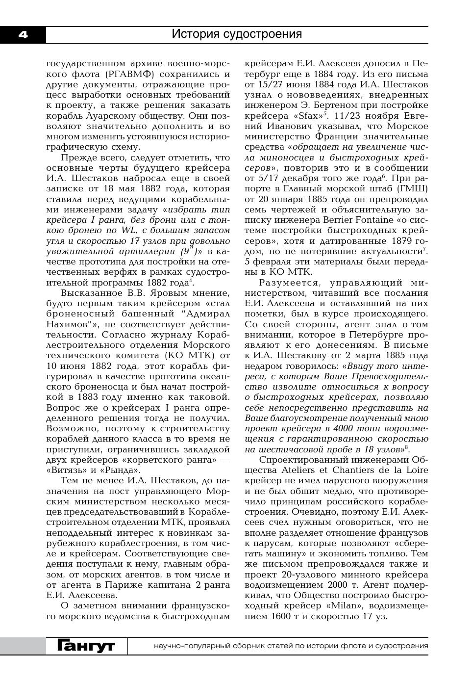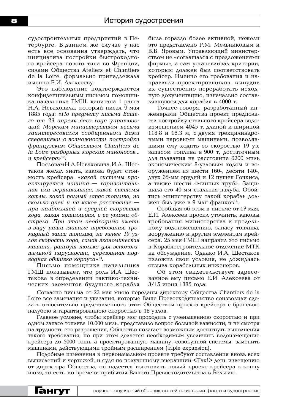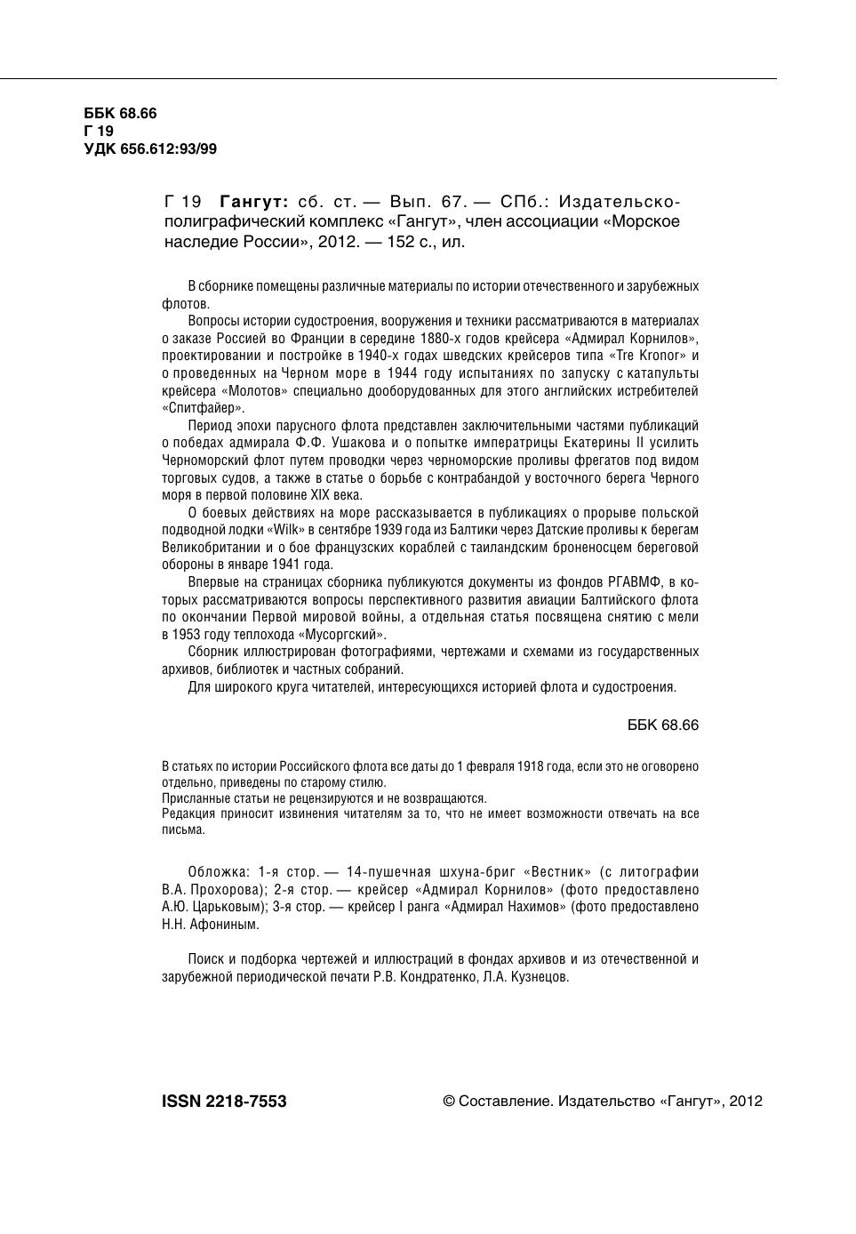 В сборнике помещены различные материалы по истории отечественного и зарубежных флотов. Вопросы истории судостроения, вооружения и техники рассматриваются в материалах о заказе Россией во Франции в середине 1880-х годов крейсера «Адмирал Корнилов», проектировании и постройке в 1940-х годах шведских крейсеров типа «Tre Kronor» и о проведенных на Черном море в 1944 году испытаниях по запуску с катапульты крейсера «Молотов» специально дооборудованных для этого английских истребителей «Спитфайер». Период эпохи парусного флота представлен заключительными частями публикаций о победах адмирала Ф.Ф. Ушакова и о попытке императрицы Екатерины II усилить Черноморский флот путем проводки через черноморские проливы фрегатов под видом торговых судов, а также в статье о борьбе с контрабандой у восточного берега Черного моря в первой половине XIX века. О боевых действиях на море рассказывается в публикациях о прорыве польской подводной лодки «Wilk» в сентябре 1939 года из Балтики через Датские проливы к берегам Великобритании и о бое французских кораблей с таиландским броненосцем береговой обороны в январе 1941 года. Впервые на страницах сборника публикуются документы из фондов РГАВМФ, в которых рассматриваются вопросы перспективного развития авиации Балтийского флота по окончании Первой мировой войны, а отдельная статья посвящена снятию с мели в 1953 году теплохода «Мусоргский». Сборник иллюстрирован фотографиями, чертежами и схемами из государственных архивов, библиотек и частных собраний. Для широкого круга читателей, интересующихся историей флота и судостроения.