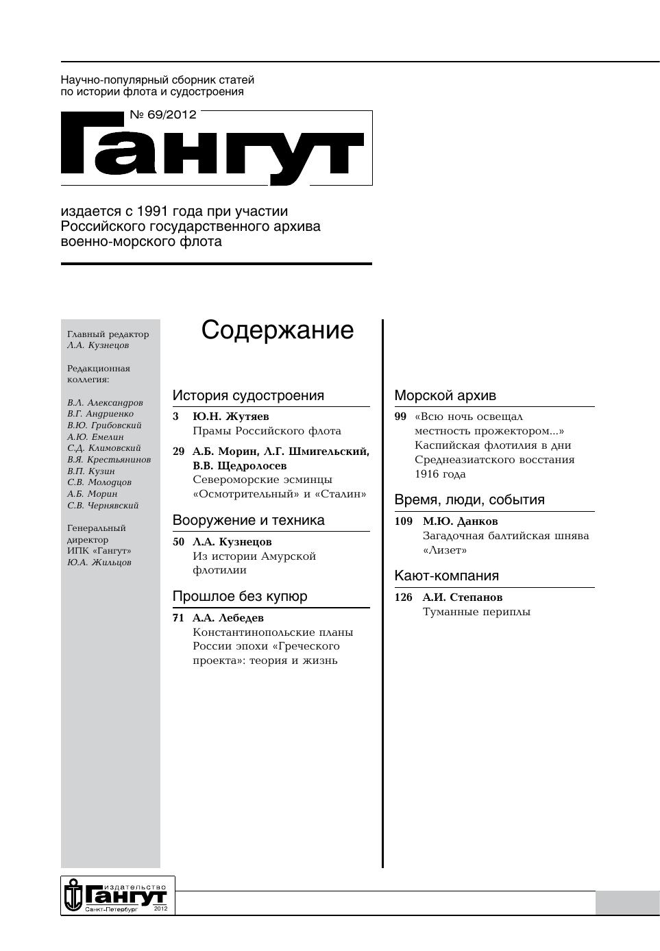В сборнике помещены различные материалы по истории отечественного и зарубежных флотов. Судостроительная тематика и история морского оружия и техники отражены в материалах о прамах в Российском флоте в XVIII веке, балтийской шняве «Лизет» эпохи Петра I, переоборудовании в период Русско-японской войны 1904–1905 годов ряда грузовых амурских барж в плавучие батареи и в заключительной части статьи об истории североморских эсминцев «Осмотрительный» и «Сталин» проекта 30К. В отдельных статьях рассказывается о разрабатывавшихся в России в последней четверти XVIII века планах захвата Константинополя и черноморских проливов и о действиях кораблей Каспийской флотилии по защите русских поселений в дни восстания народов Средней Азии и Казахстана осенью 1916 года. С этого выпуска сборник приступает к публикации воспоминаний капитана 1 ранга в запасе А.И. Степанова о совершенном им в 1975 году впервые в истории СССР продолжительном одиночном плавании на яхте по маршруту Владивосток — Петропавловск-Камчатский — Владивосток. Для широкого круга читателей, интересующихся историей флота и судостроения.