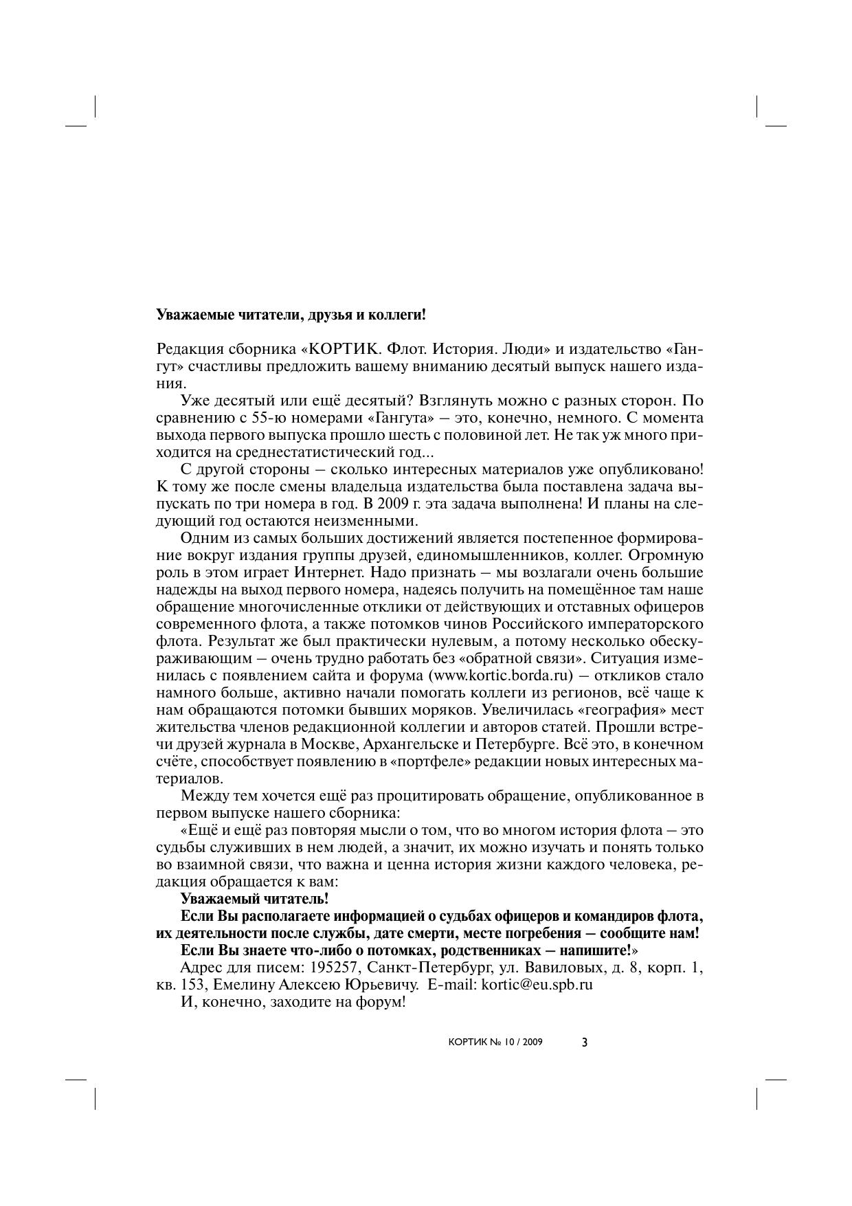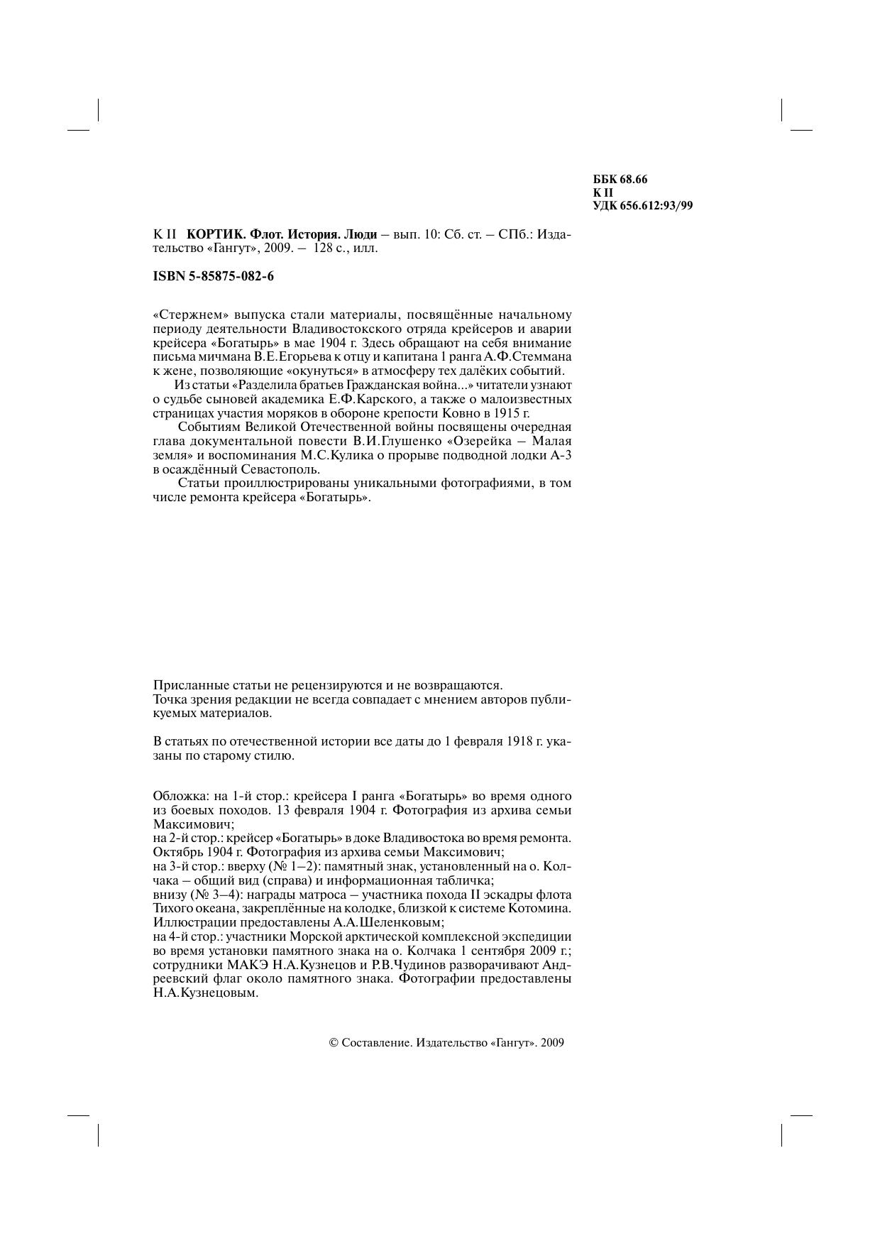 «Стержнем» выпуска стали материалы, посвящённые начальному периоду деятельности Владивостокского отряда крейсеров и аварии крейсера «Богатырь» в мае 1904 г. Здесь обращают на себя внимание письма мичмана В.Е.Егорьева к отцу и капитана 1 ранга А.Ф.Стеммана к жене, позволяющие «окунуться» в атмосферу тех далёких событий. Из статьи «Разделила братьев Гражданская война…» читатели узнают о судьбе сыновей академика Е.Ф.Карского, а также о малоизвестных страницах участия моряков в обороне крепости Ковно в 1915 г. Событиям Великой Отечественной войны посвящены очередная глава документальной повести В.И.Глушенко «Озерейка – Малая земля» и воспоминания М.С.Кулика о прорыве подводной лодки А-3 в осаждённый Севастополь. Статьи проиллюстрированы уникальными фотографиями, в том числе ремонта крейсера «Богатырь».