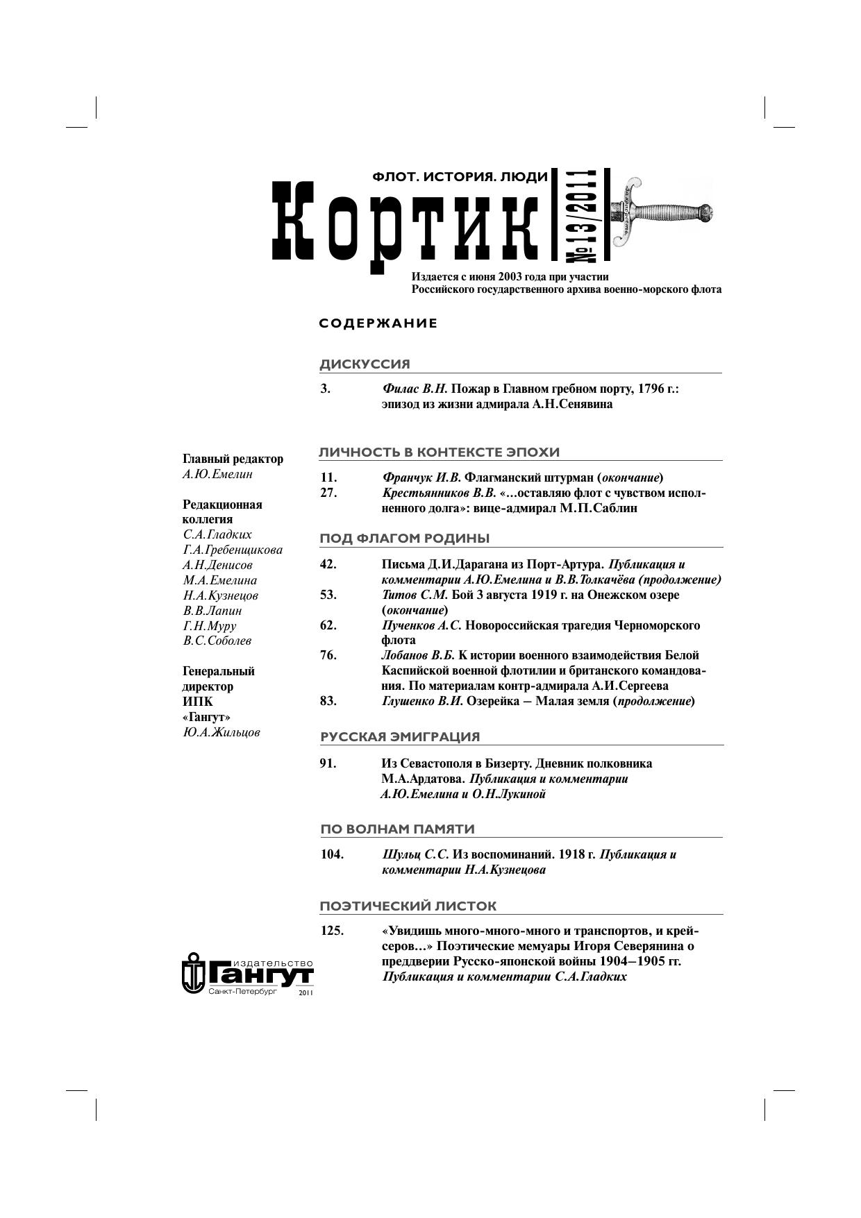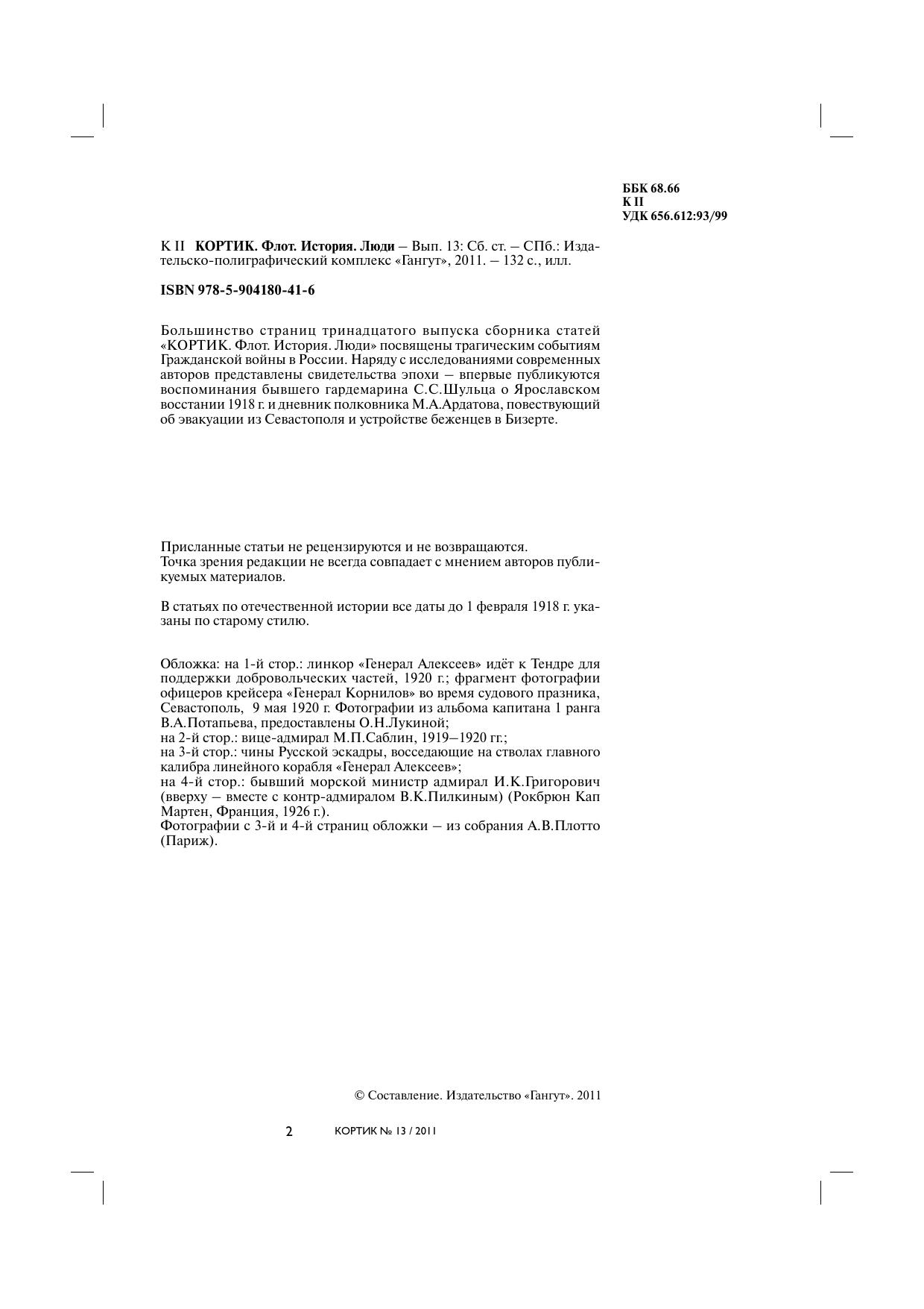 Большинство страниц тринадцатого выпуска сборника статей «КОРТИК. Флот. История. Люди» посвящены трагическим событиям Гражданской войны в России. Наряду с исследованиями современных авторов представлены свидетельства эпохи – впервые публикуются воспоминания бывшего гардемарина С.С.Шульца о Ярославском восстании 1918 г. и дневник полковника М.А.Ардатова, повествующий об эвакуации из Севастополя и устройстве беженцев в Бизерте.