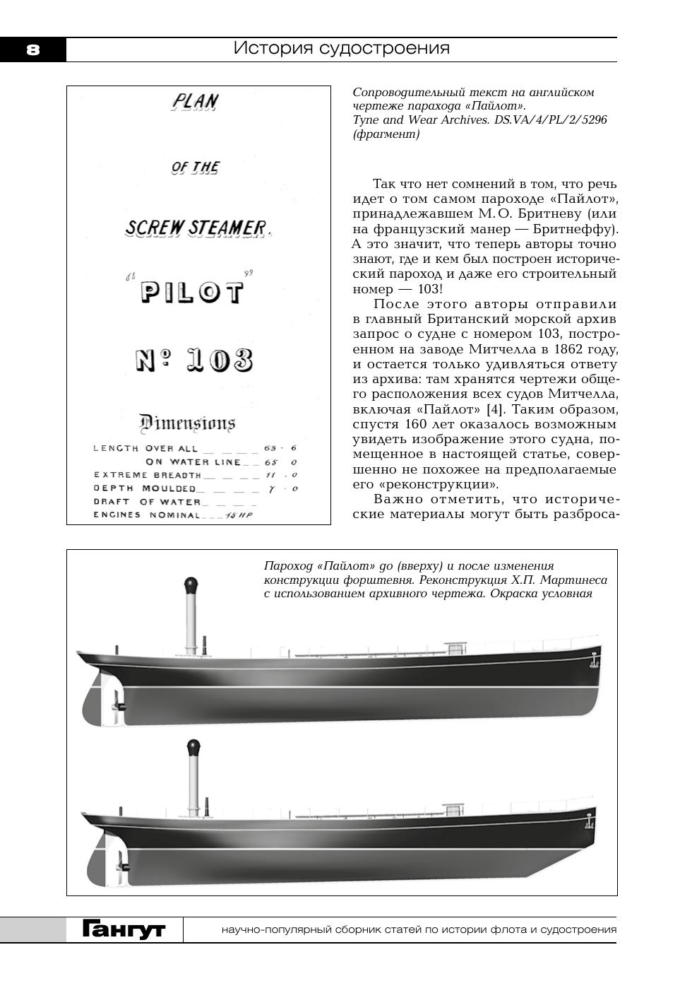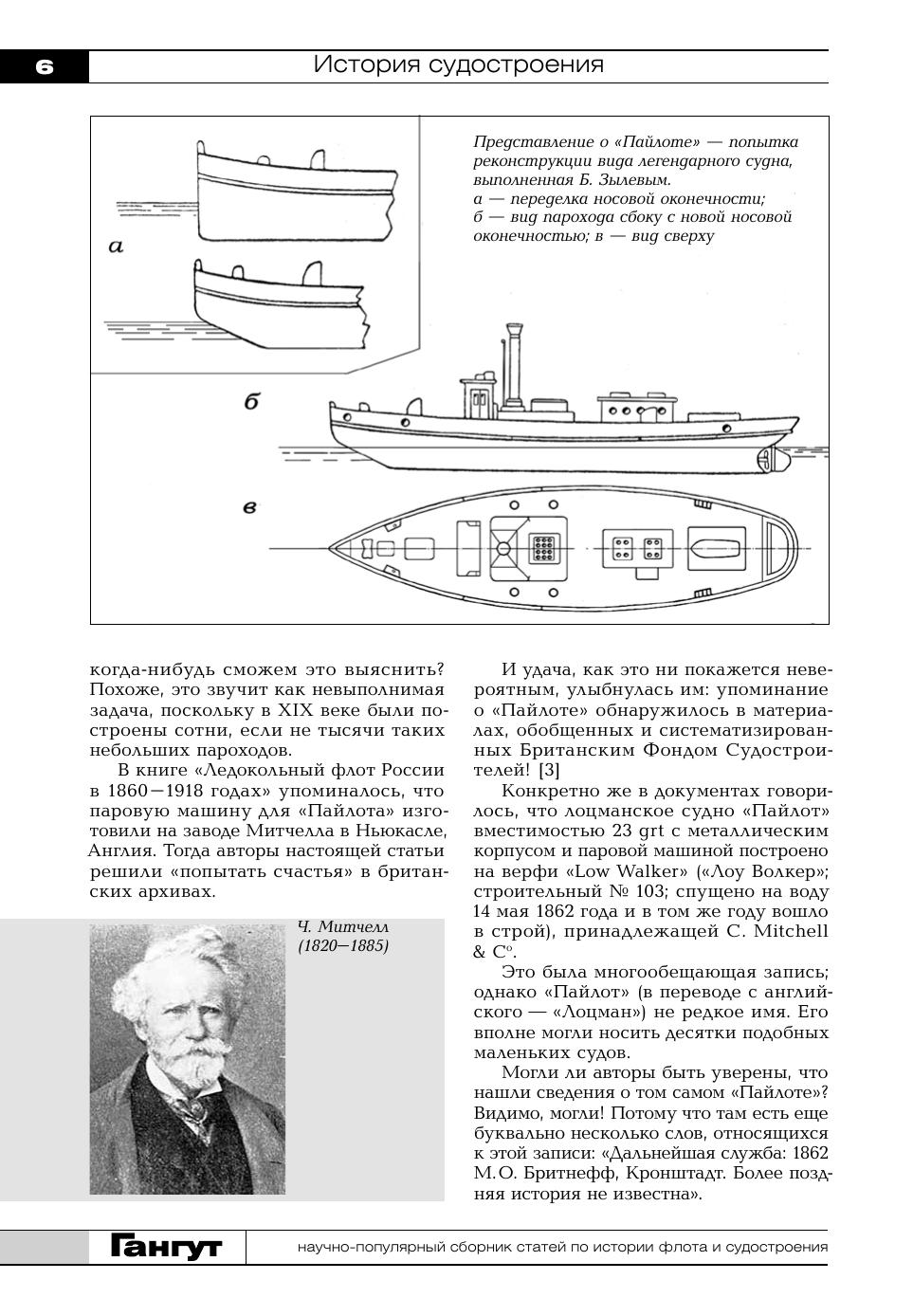 История судостроения представлена работой о кронштадтском пароходе «Пайлот», построенном в 1862 году и ошибочно считавшемся первым ледоколом; перепечаткой публикации из журнала «Русское судоходство» за 1886 год о российских заводах-строителях кораблей и предприятиях, изготовлявших для них вооружение и механизмы; и очередной частью публикации отзывов русских адмиралов о разрабатываемой кораблестроительной программе 1903–1923 годов.