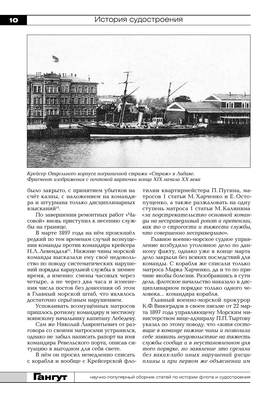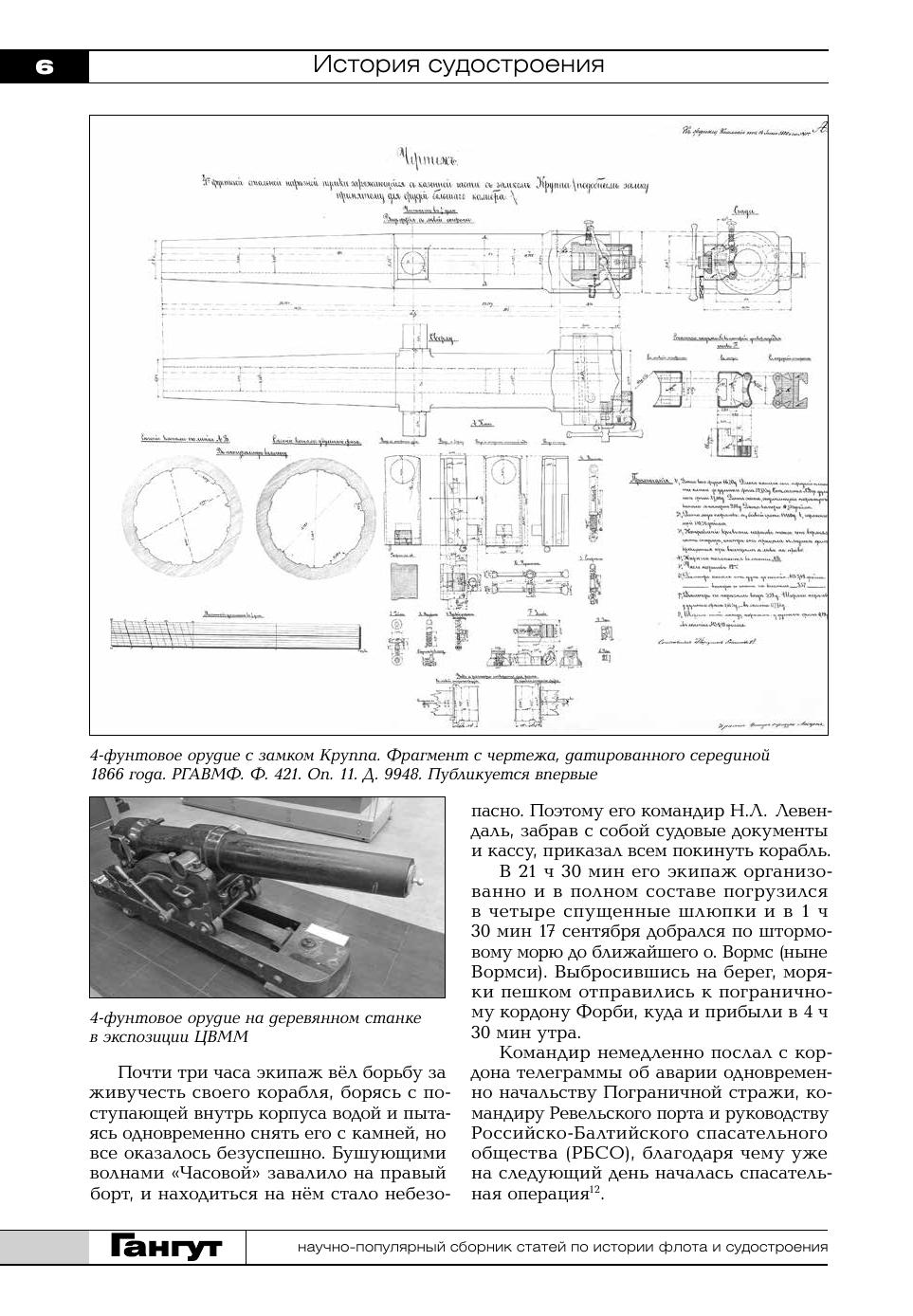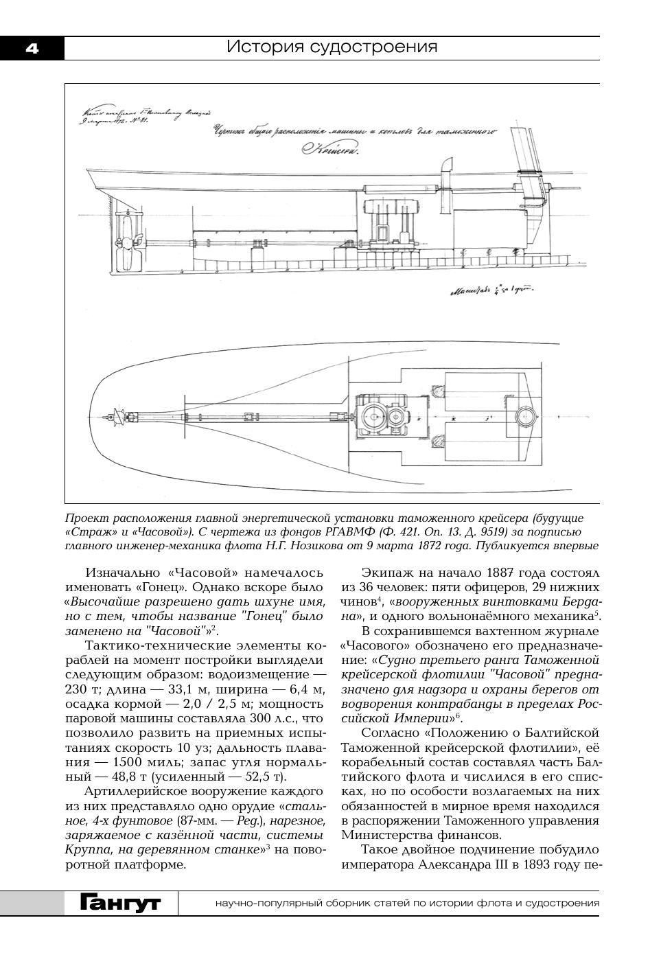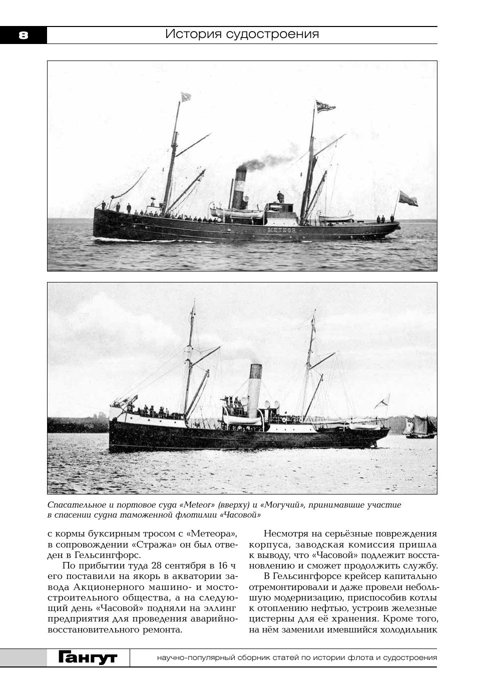 История судостроения представлена статьями о пограничном крейсере «Часовой», прослужившем в разных ипостасях более шестидесяти лет, и завершающей частью серии публикаций отзывов русских адмиралов на разрабатывавшуюся кораблестроительную программу 1903–1923 годов.