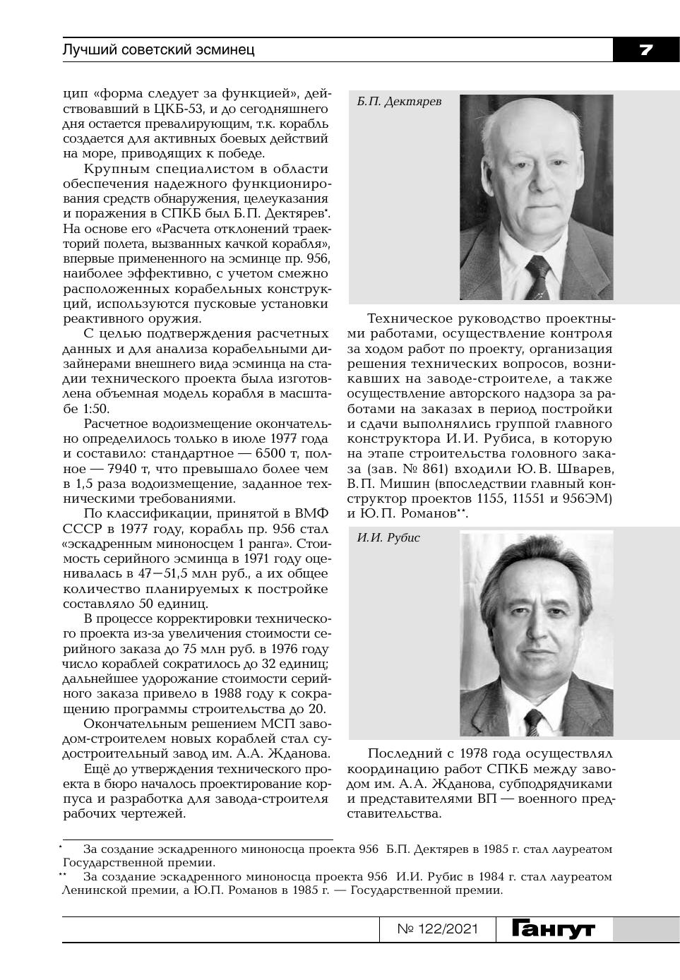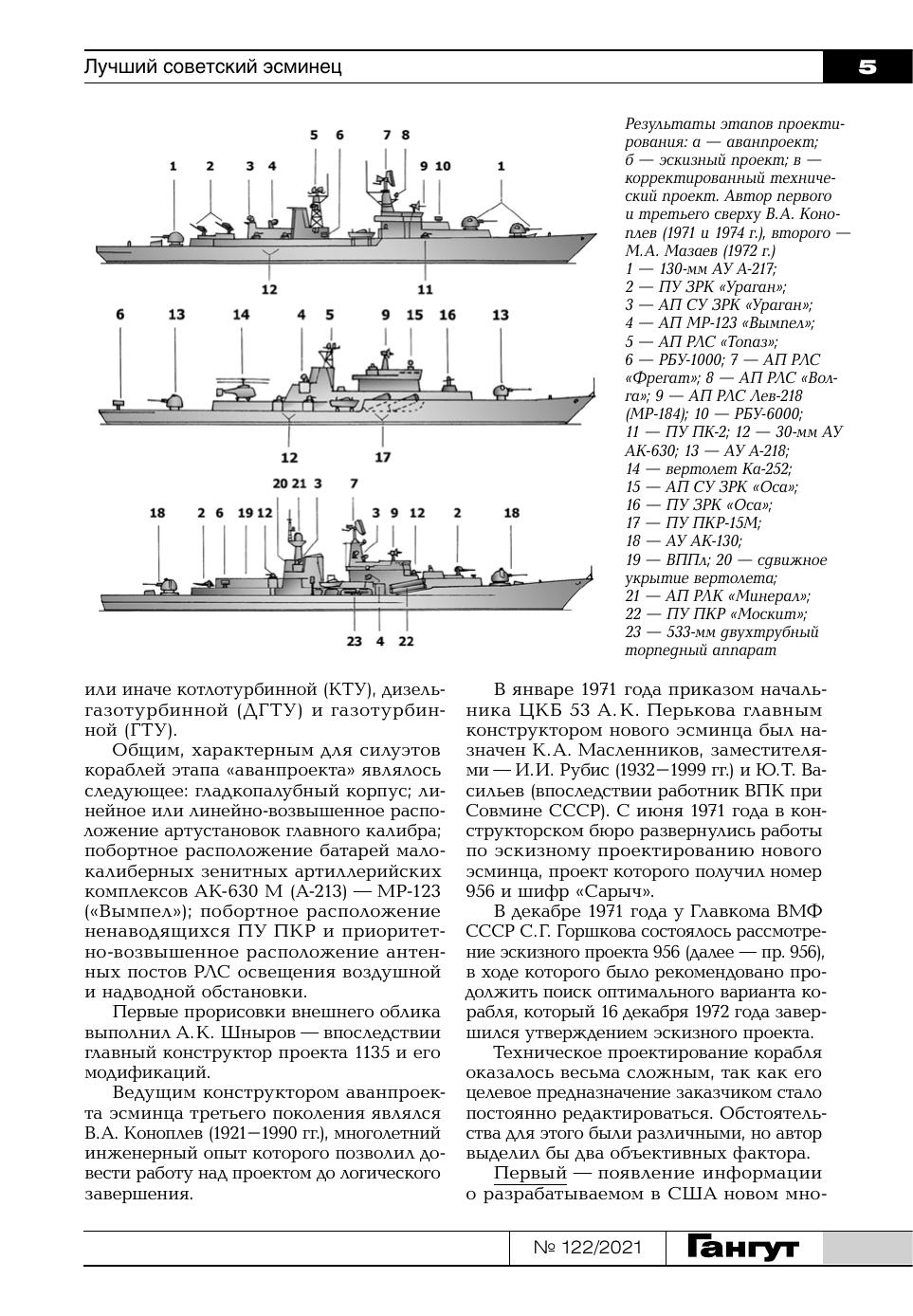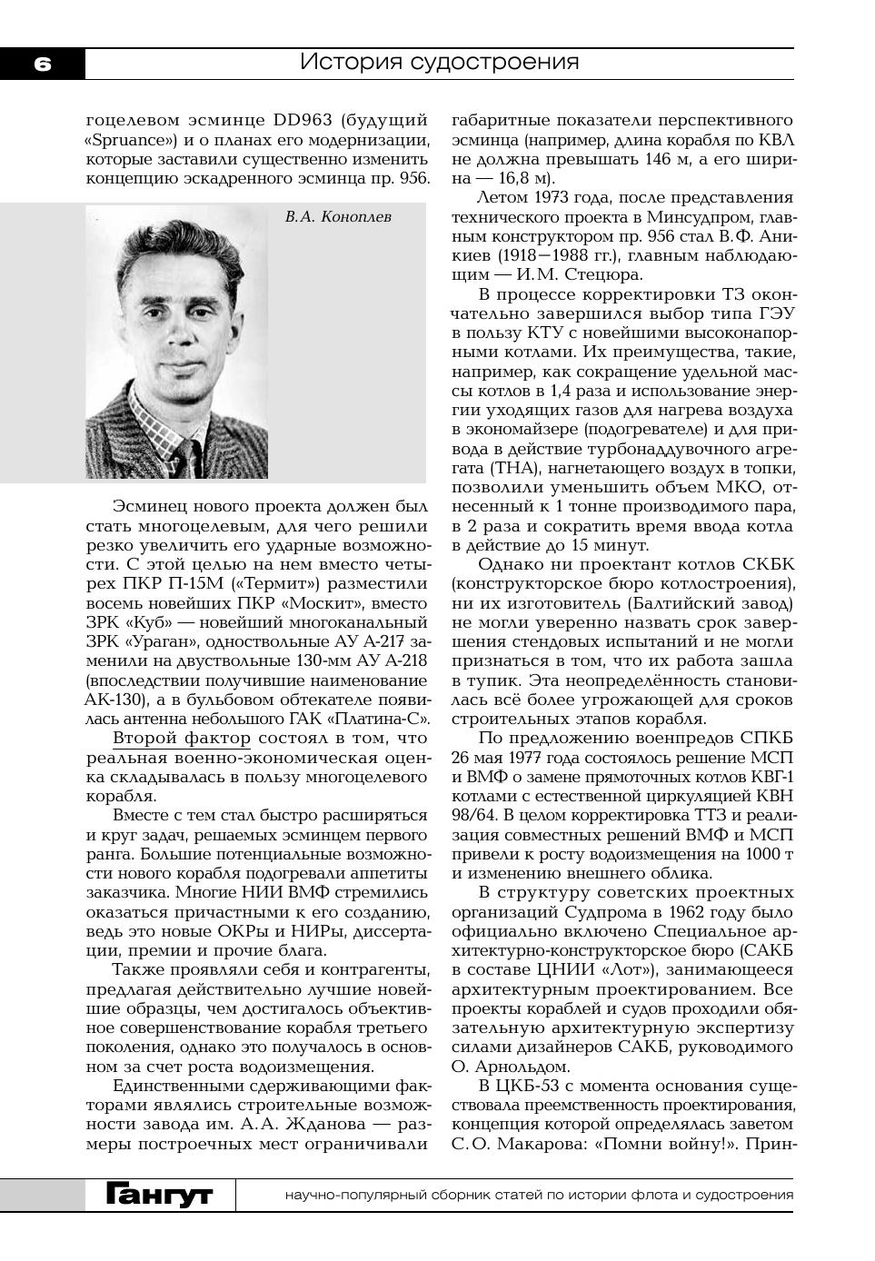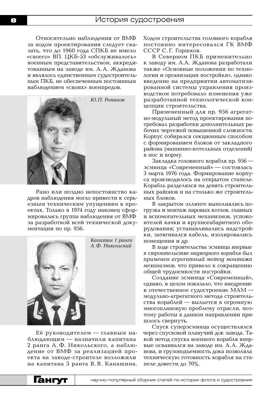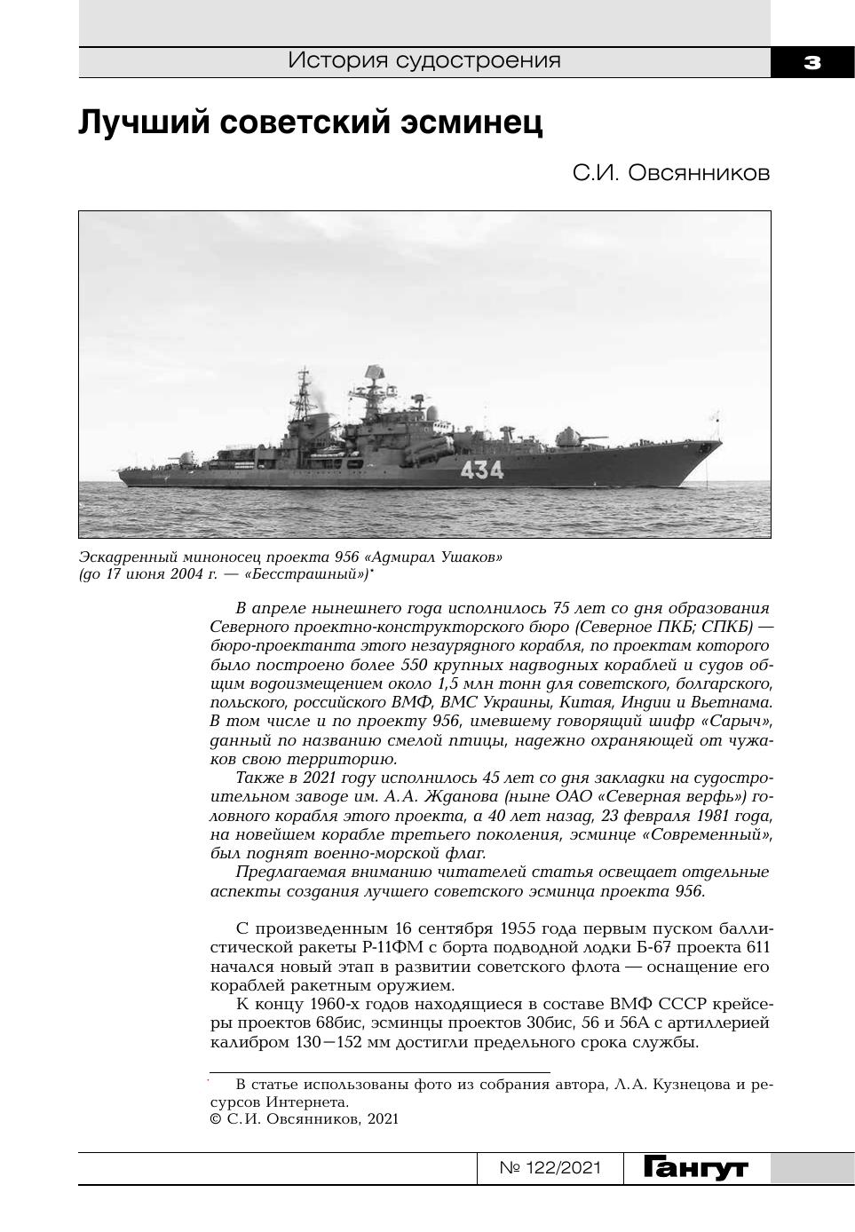 об эскадренных миноносцах проекта 956 типа «Современный», продолжением публикаций отзывов русских адмиралов на разрабатываемую кораблестроительную программу 1903–1923 годов, работами о морских артиллерийских лихтерах типа «АМL» Германии времен Второй мировой войны и о боевых повреждениях лидера «Ташкент» в 1941 и 1942 годах.